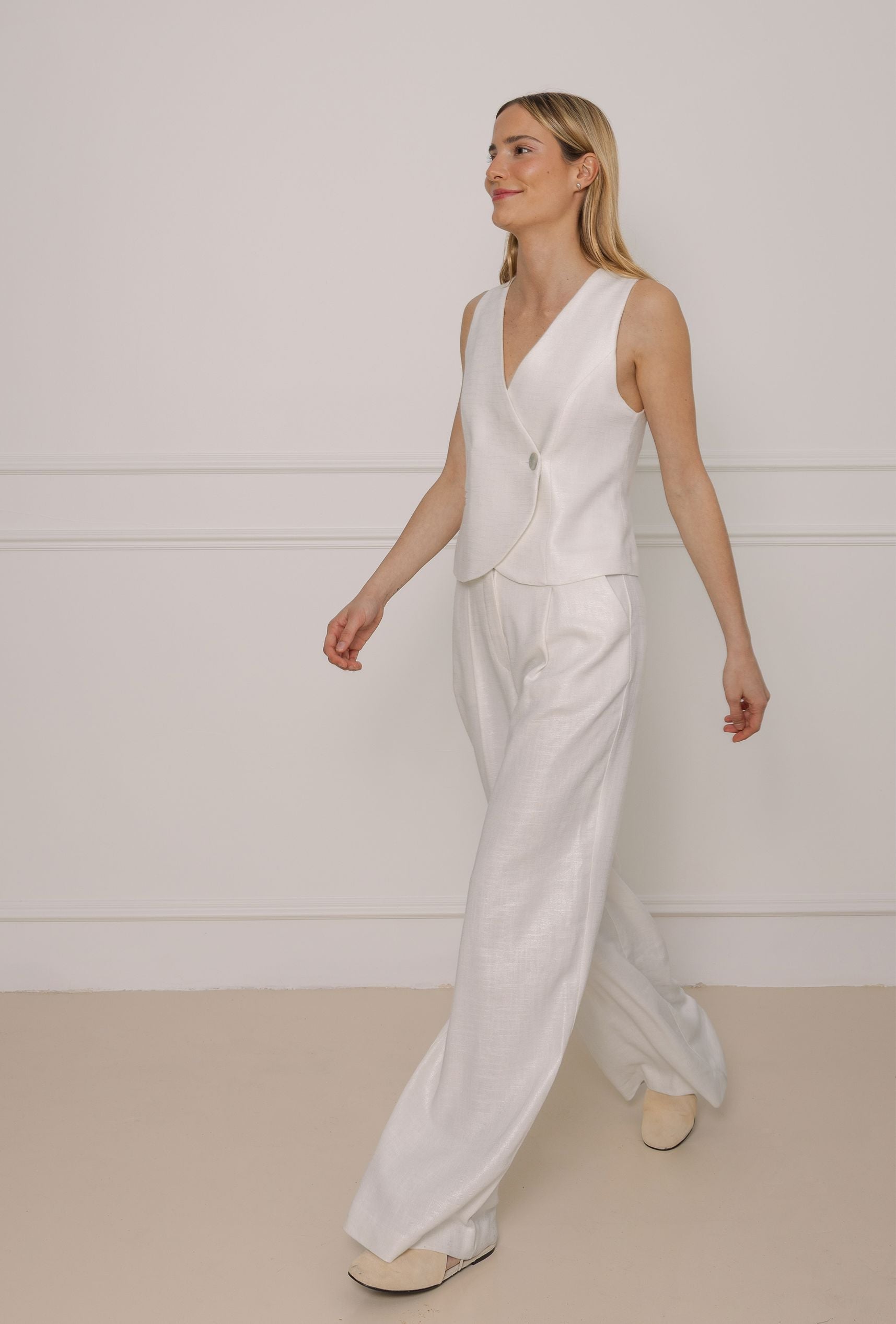 Este conjunto minimalista está elaborado en lino blanco con un sutil hilo plateado.