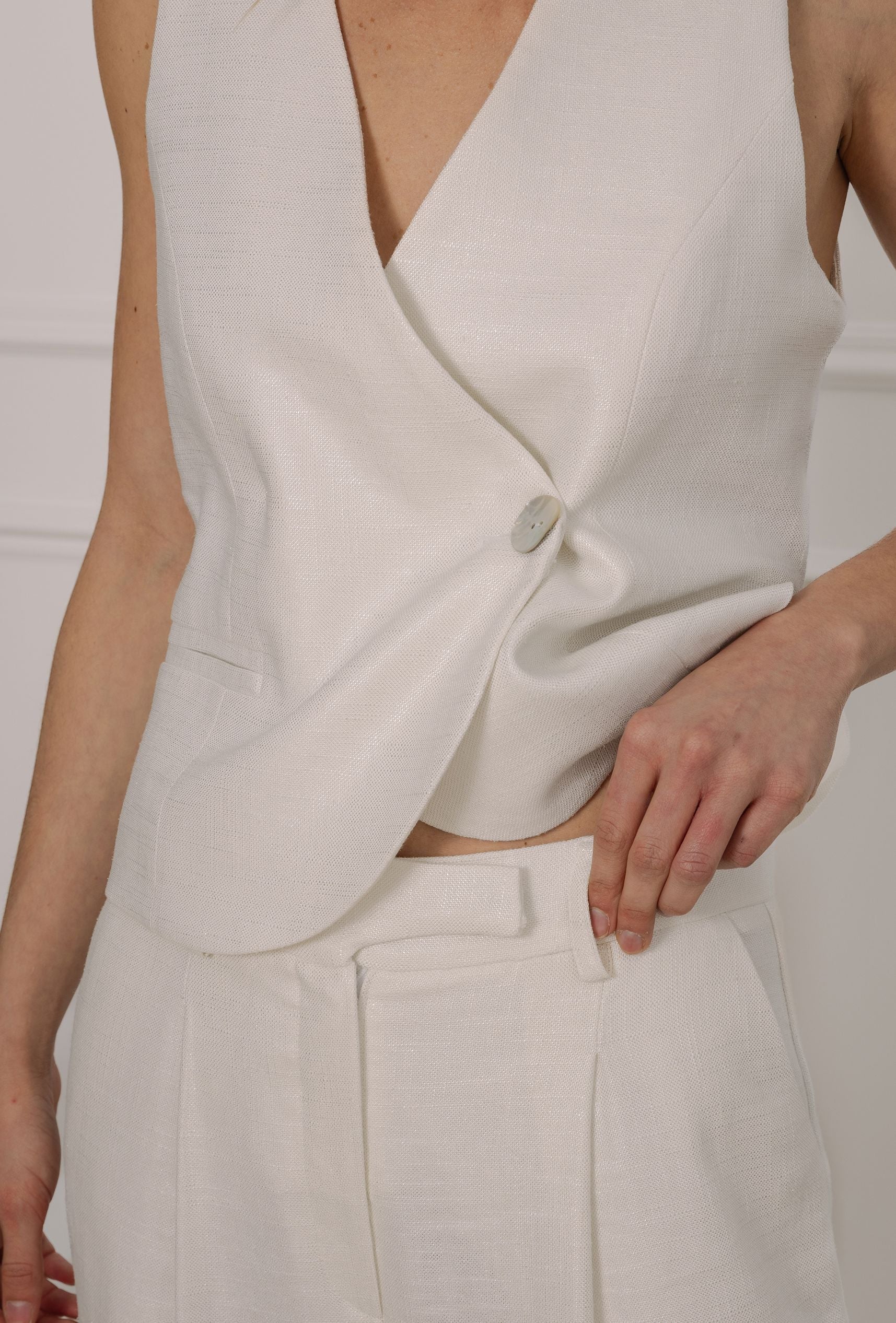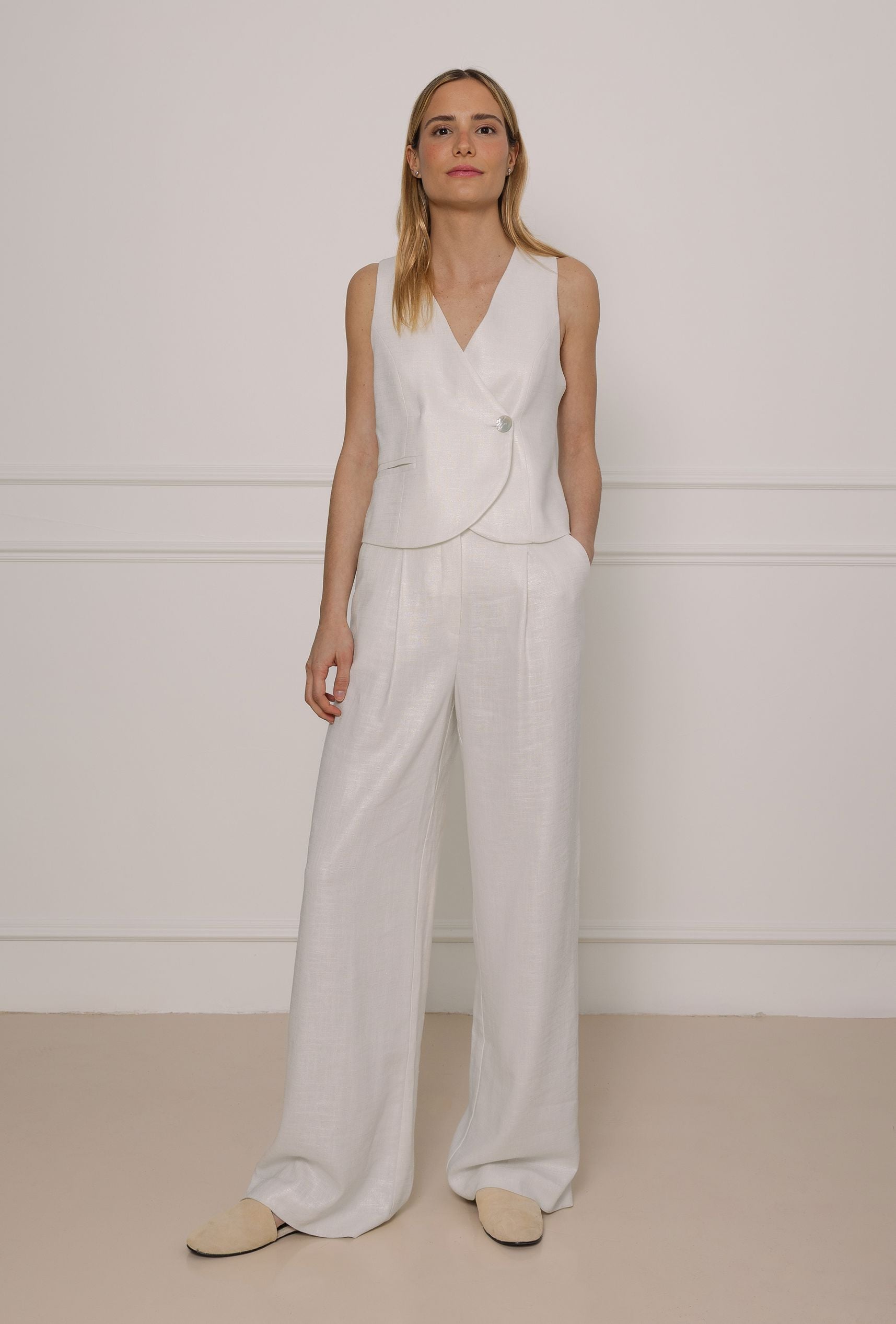 Este chaleco sin mangas presenta un escote en V que estiliza la figura, bolsillos falsos y un botón de nácar. En la espalda, una hebilla ajustable permite adaptar la prenda a tu silueta.