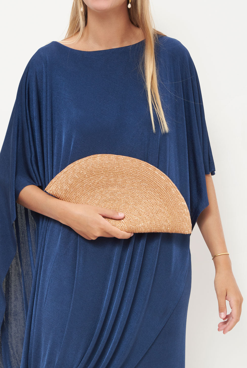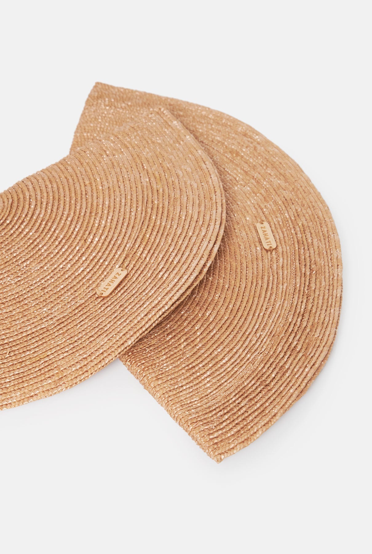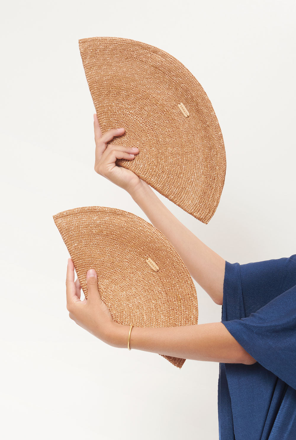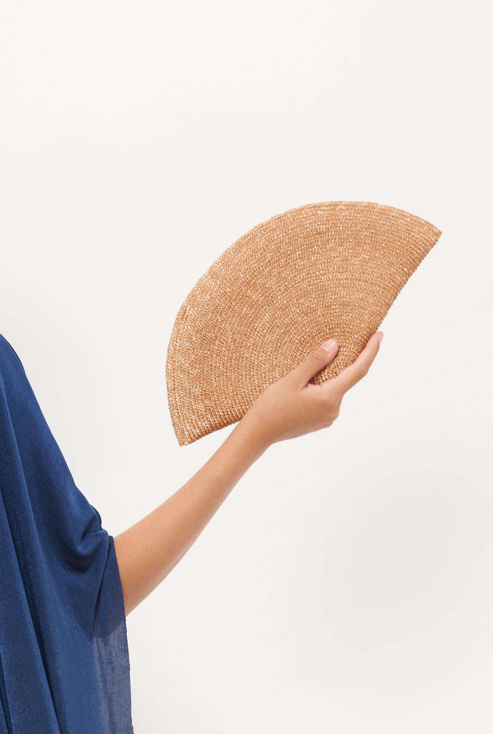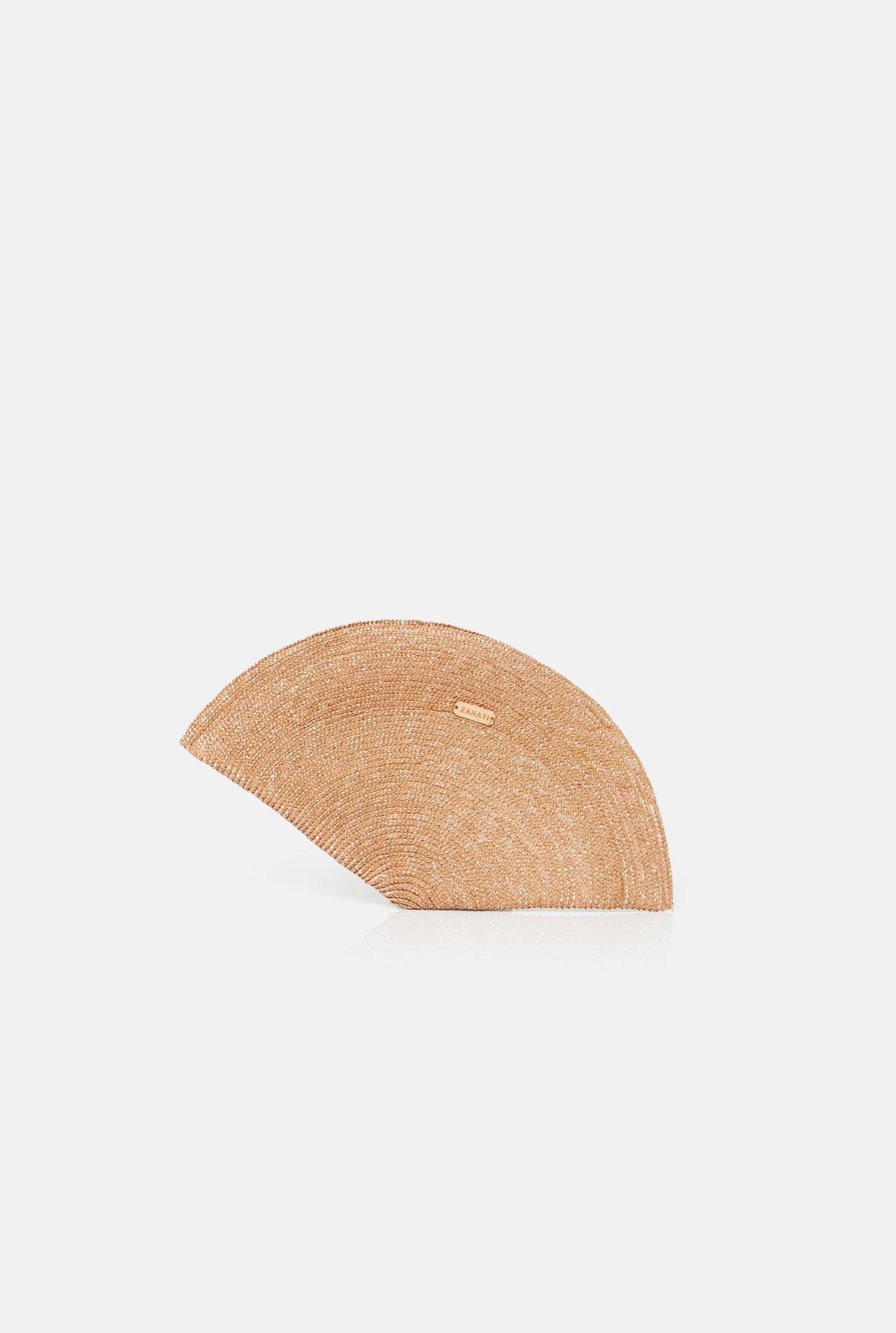 Bolso de mano abanico elaborado con paja de trigo en color camel. Diseñado por Zahati