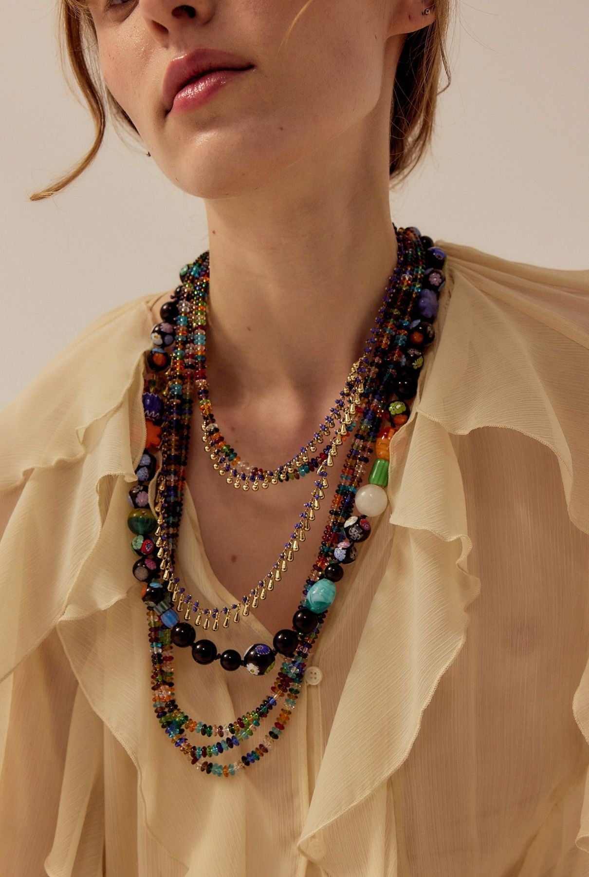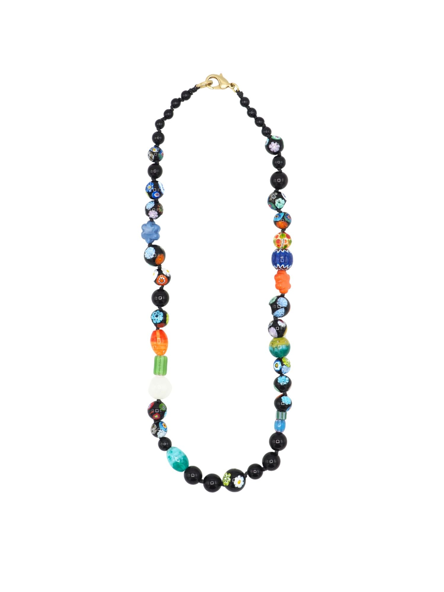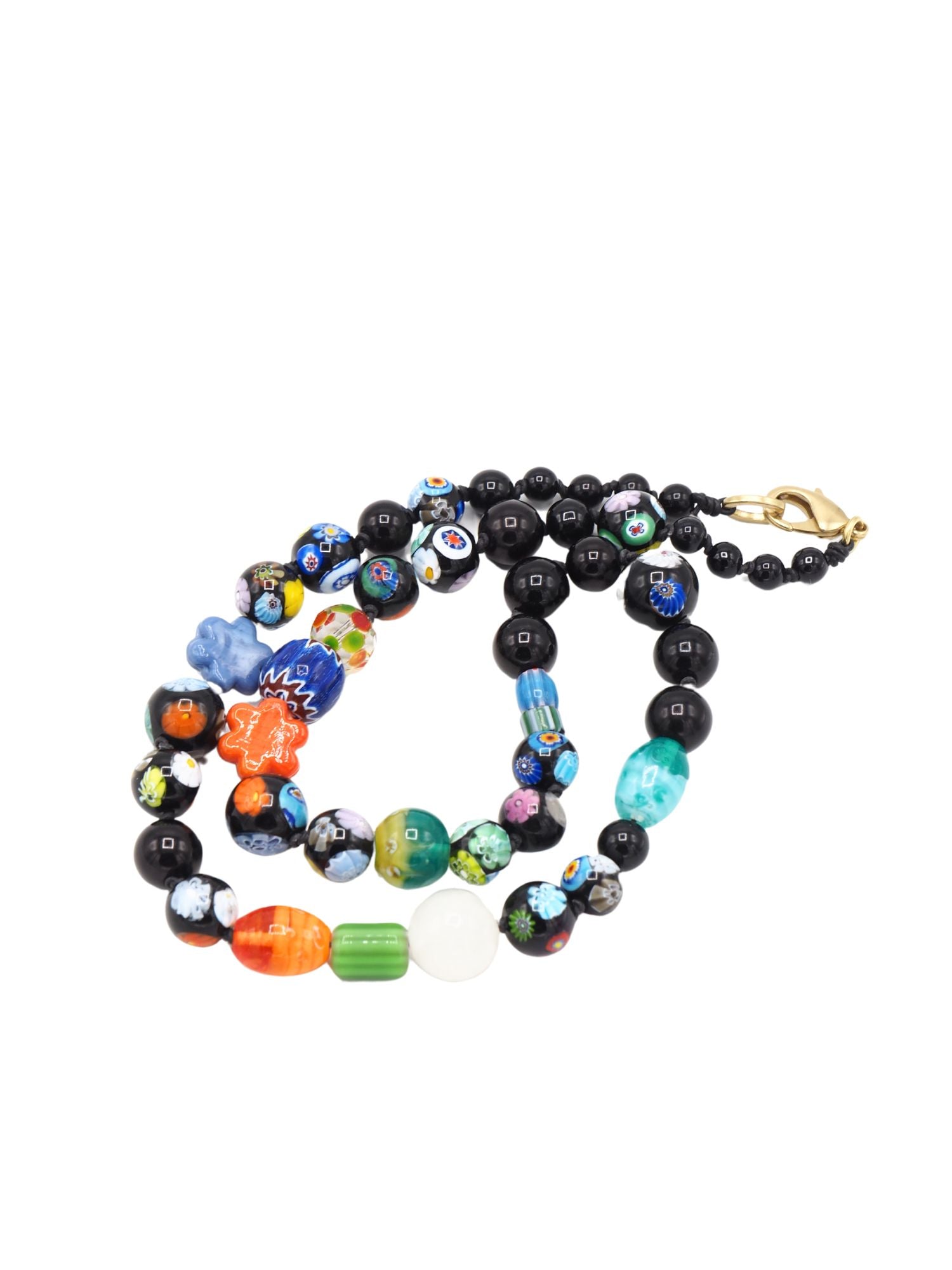 Collar de medio pecho, realizado con cuentas negras y multicolores.