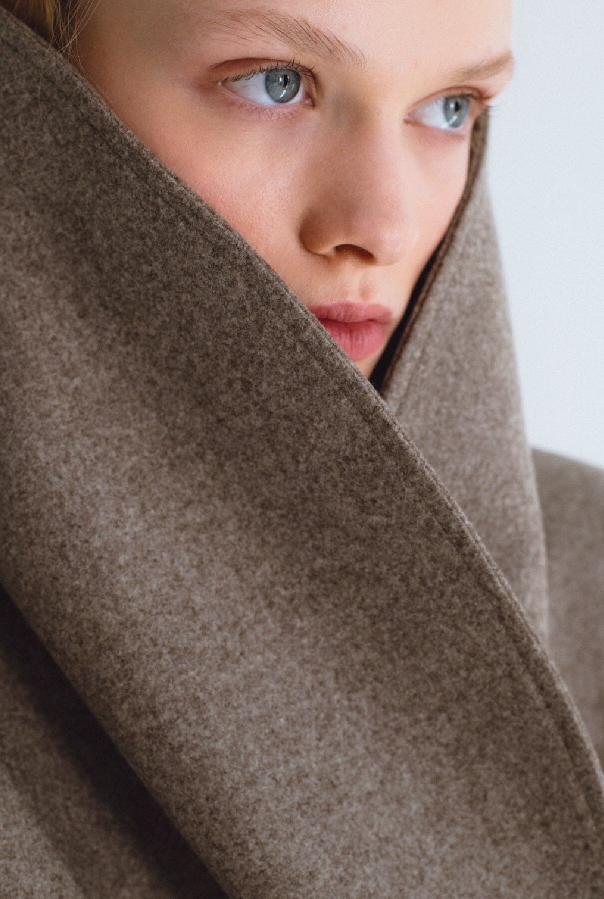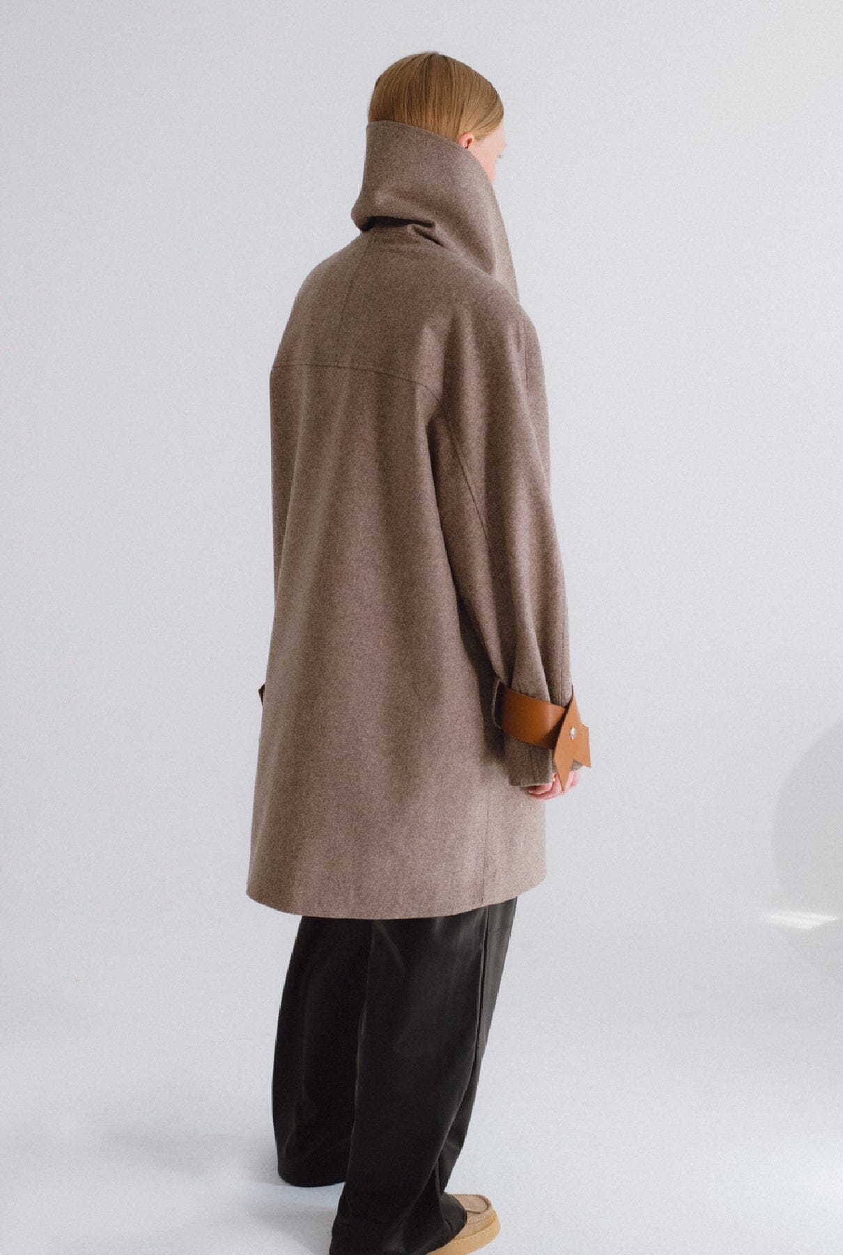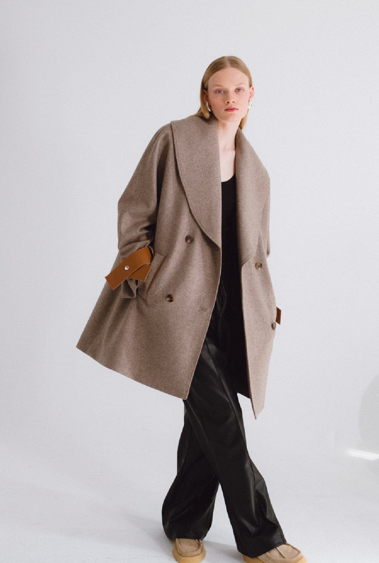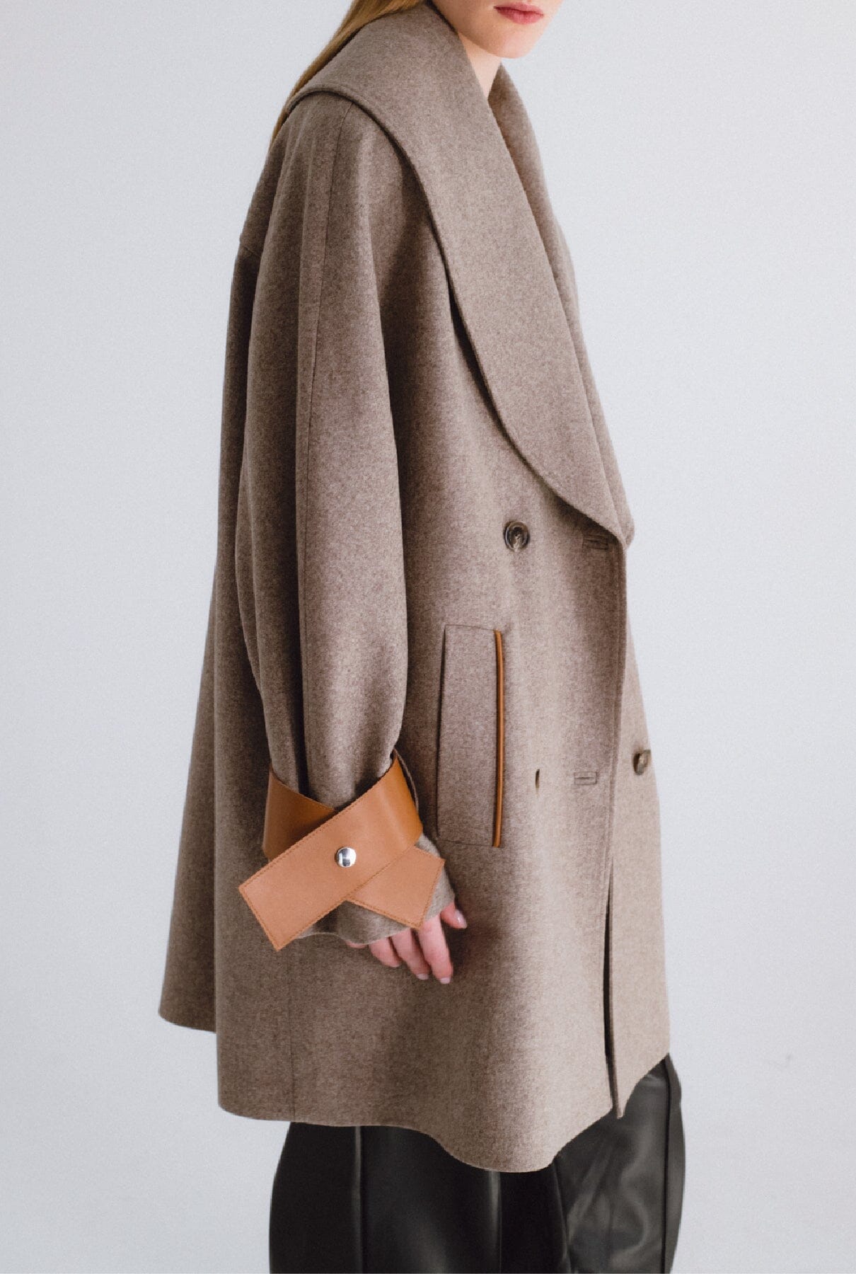 Chaqueta corta de la firma Miguel Marinero en lana merino azul con cuello de pelo rizado negro. Estilo moderno con cuello camisero largo y puños de piel ajustables con botón a presión.