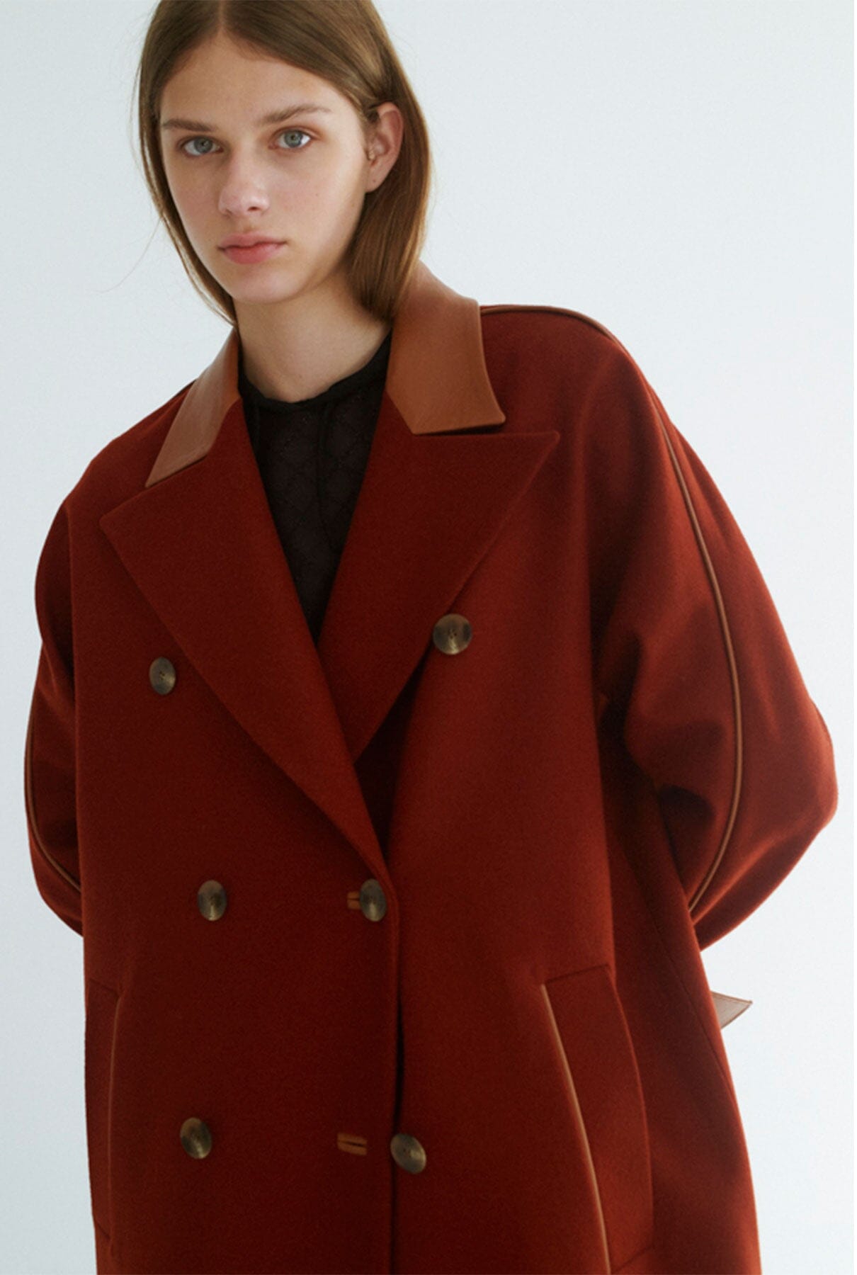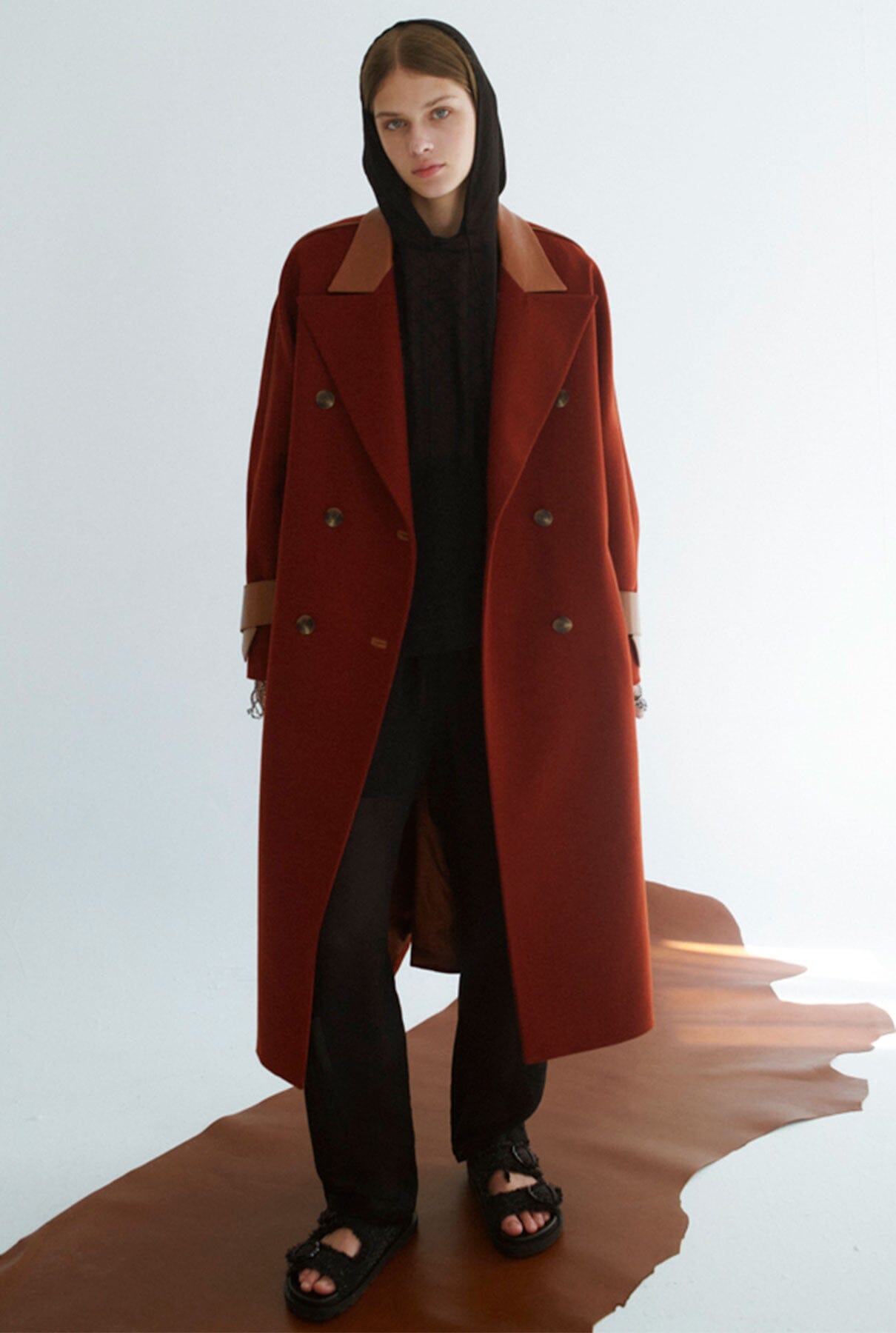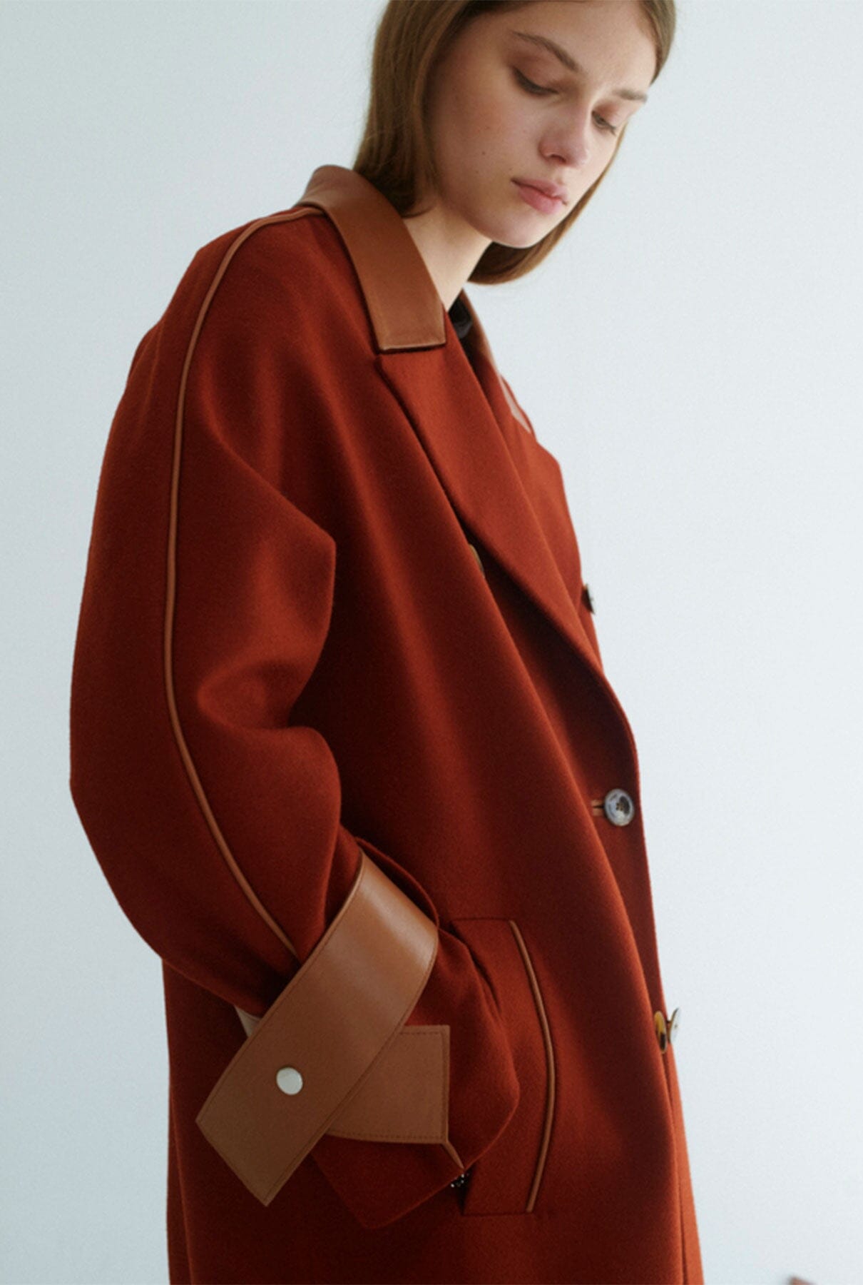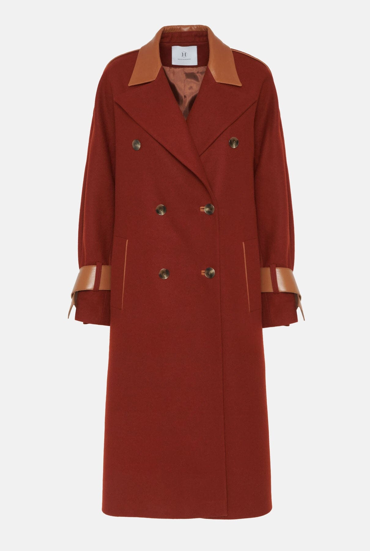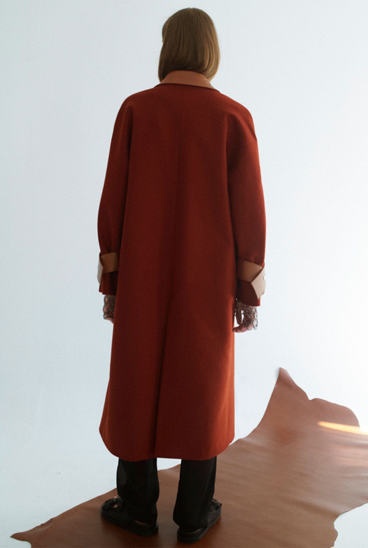 Abrigo largo cruzado característico de Miguel Marinero en lana merino color terracota, con detalles de piel en color camel. Estilo clásico reinventado con cierre cruzado con botones MM. El abrigo es cálido y envolvente, llévalo casualmente durante el día o con vestidos sofisticados por la noche.