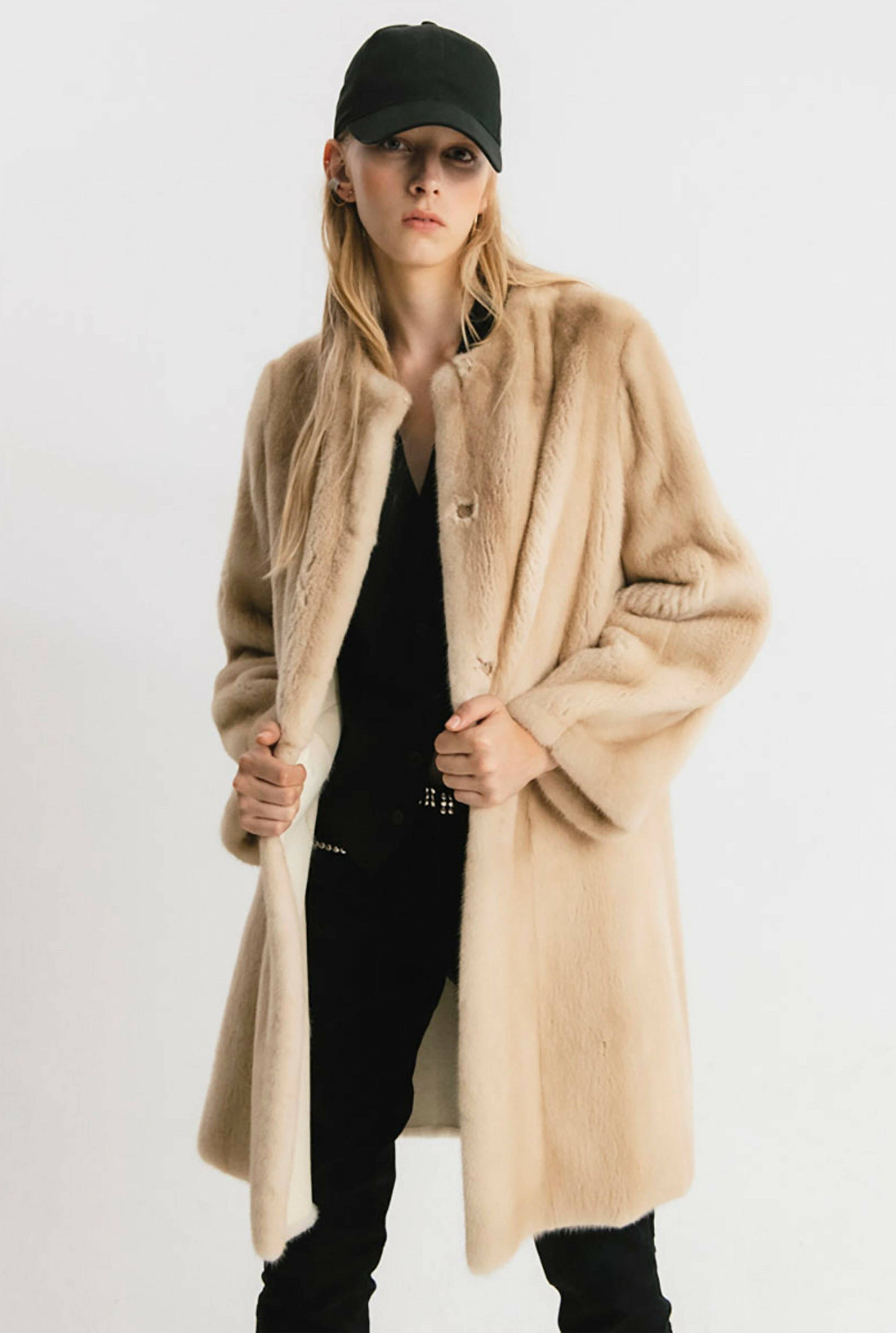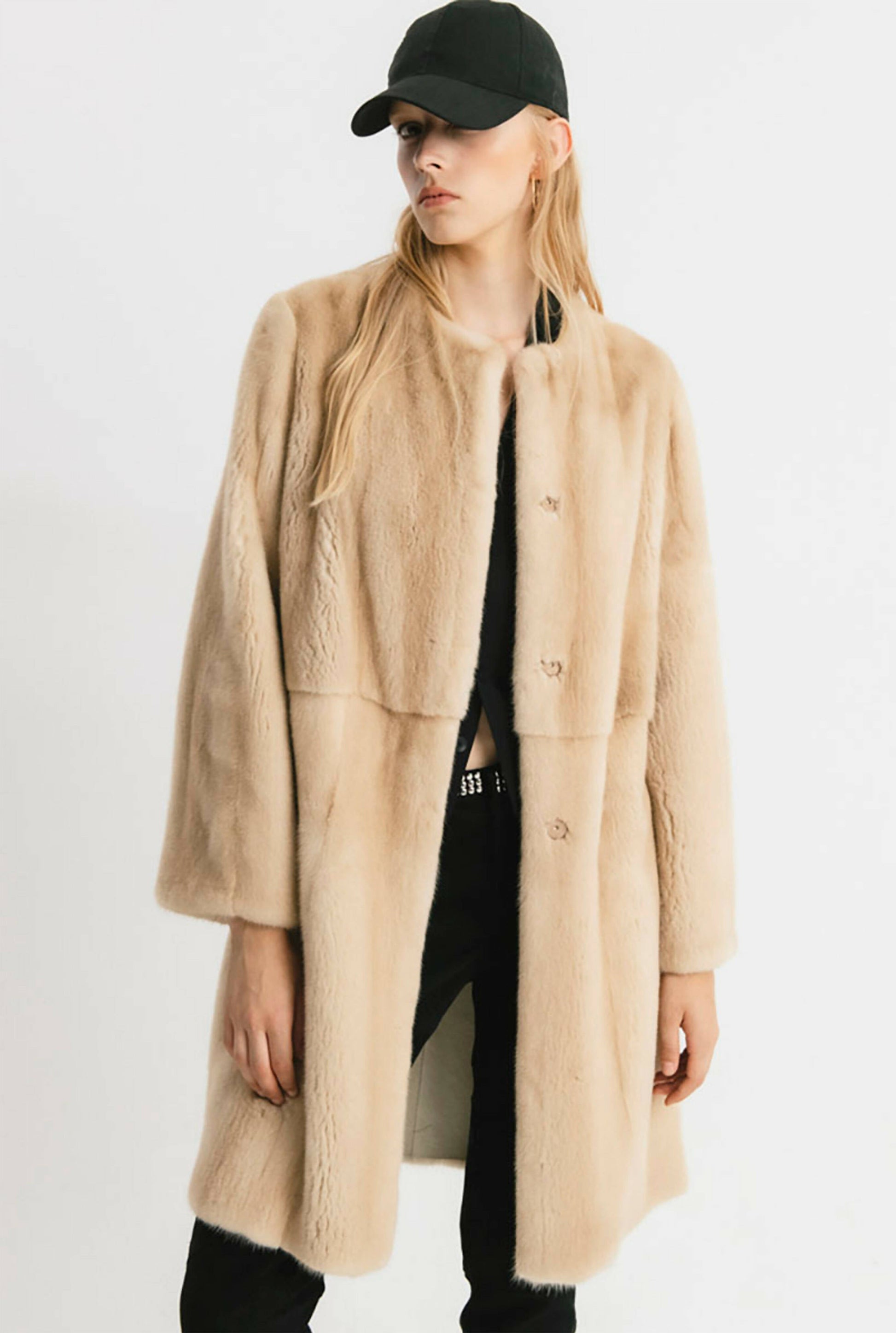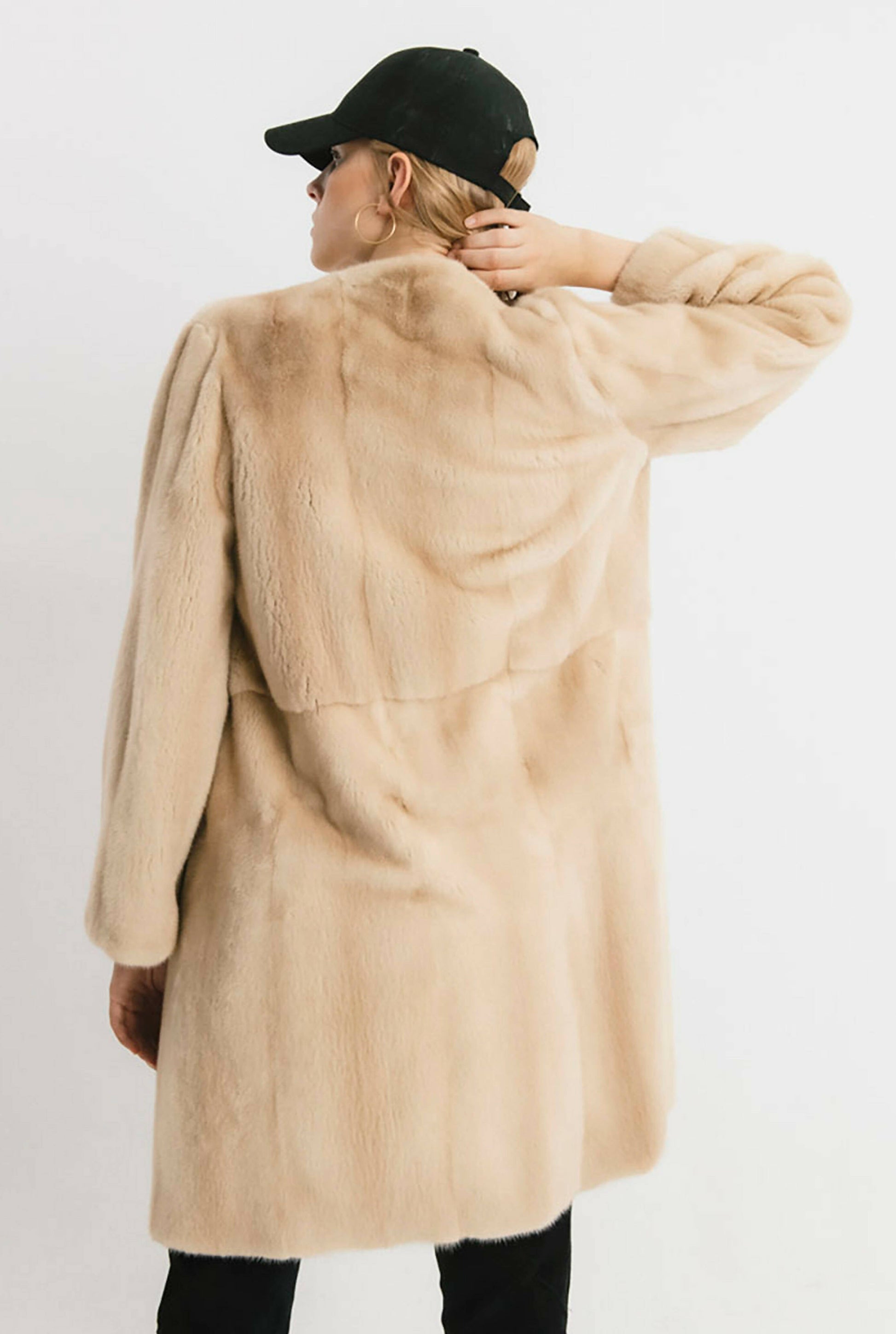 Abrigo de la firma Miguel Marinero en visón perla con cuello caja. Es una prenda cálida y muy combinable, para llevar tanto de día con ropa informal como de noche con vestidos de fiesta. Interior sin forro, para aportar ligereza y originalidad a la prenda. Cierre con pargos forrados al tono. Diseñado por Miguel Marinero