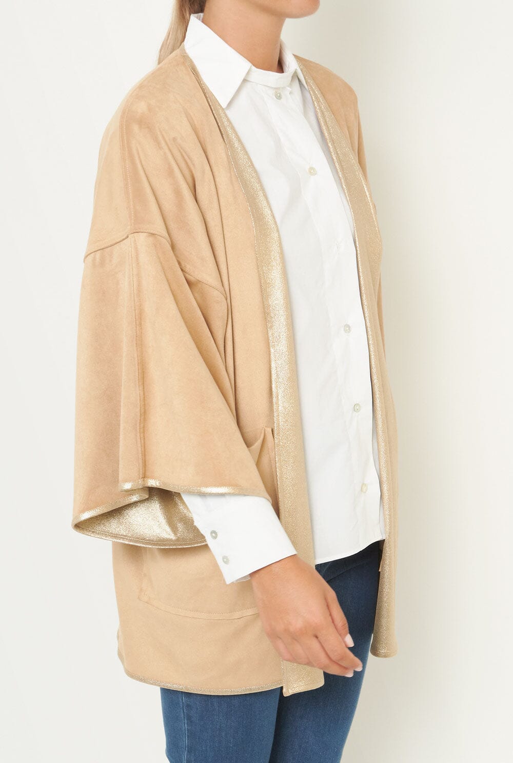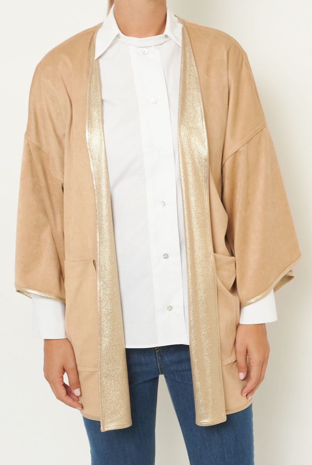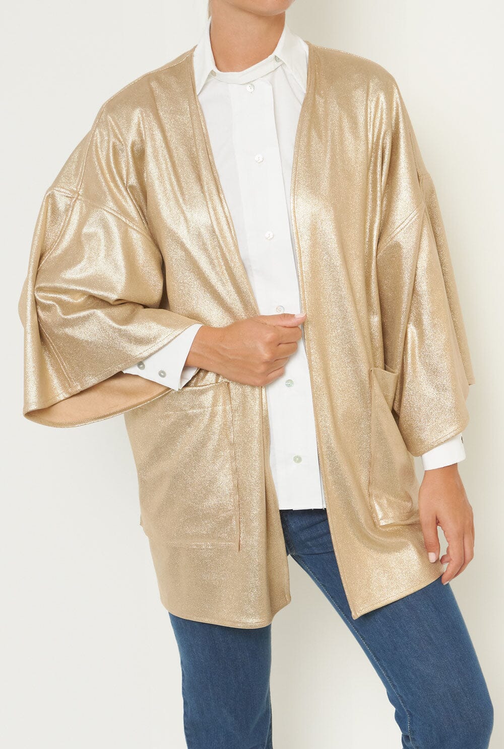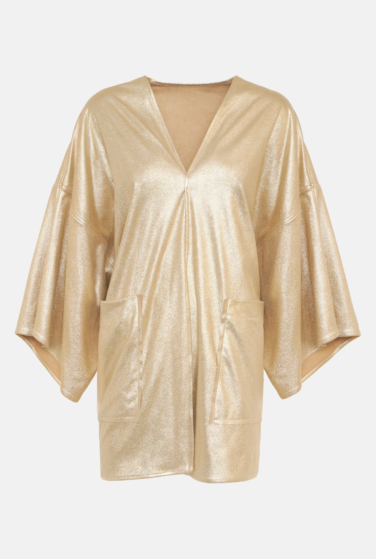 Abrigo cuadrado reversible con mangas cuadradas de anteline lamé dorado reversible.