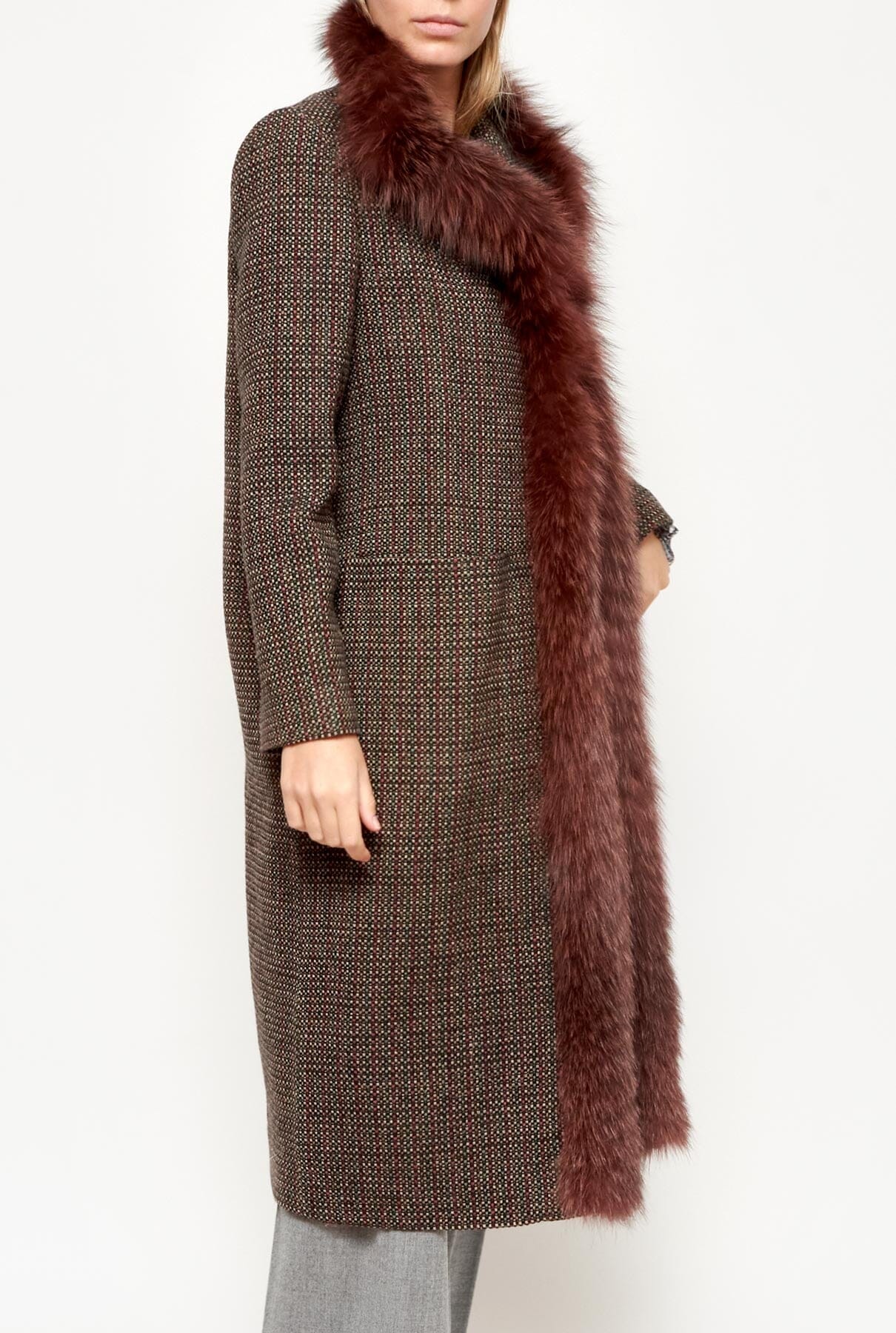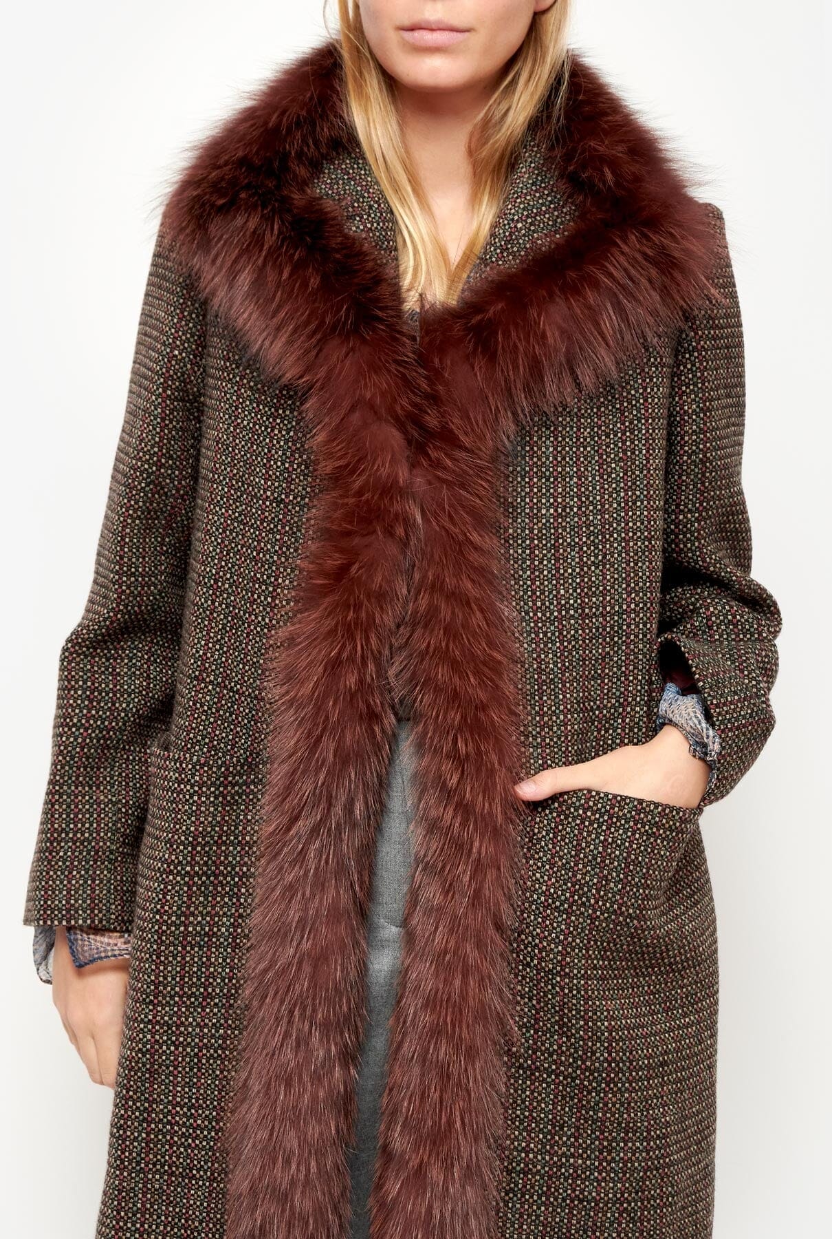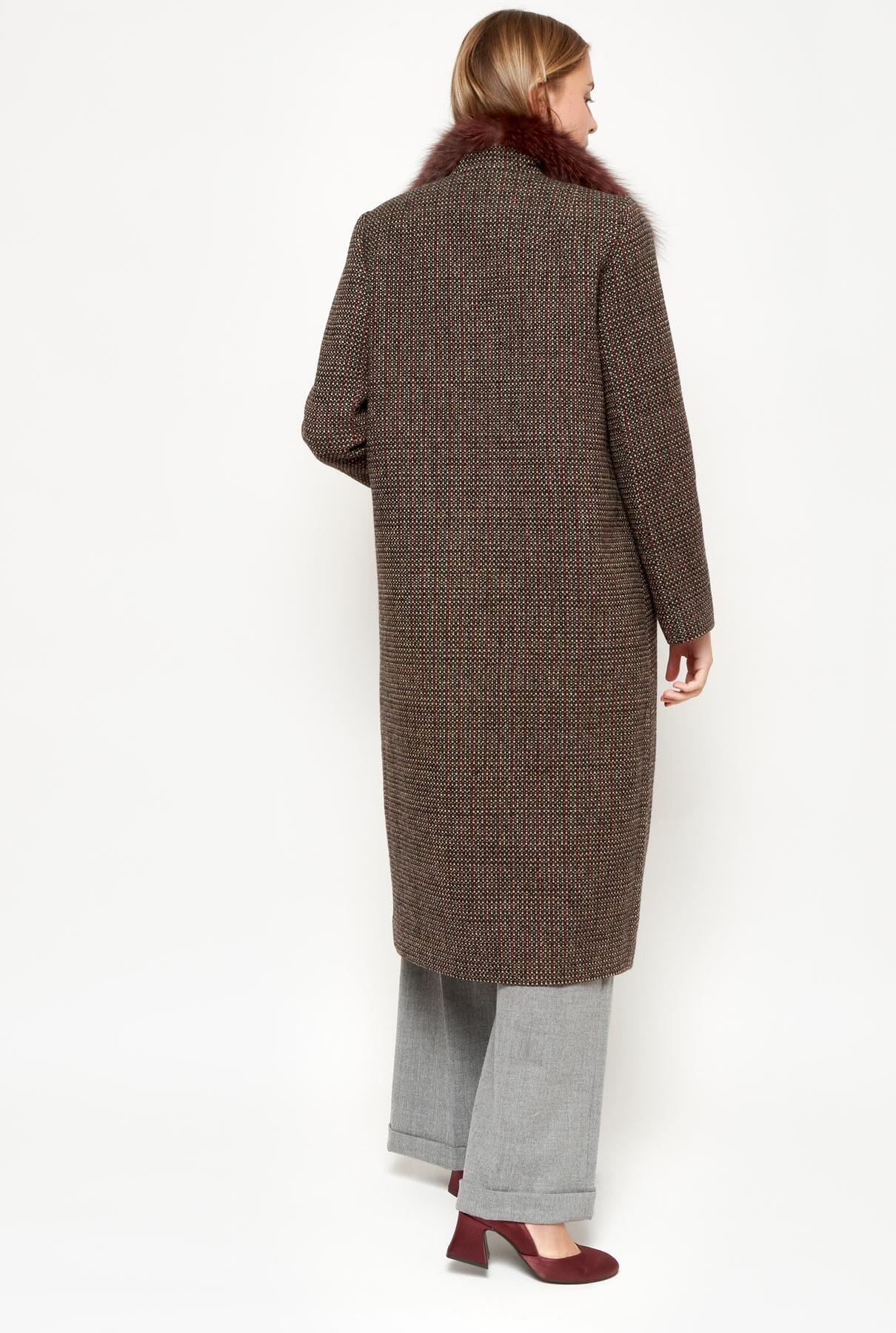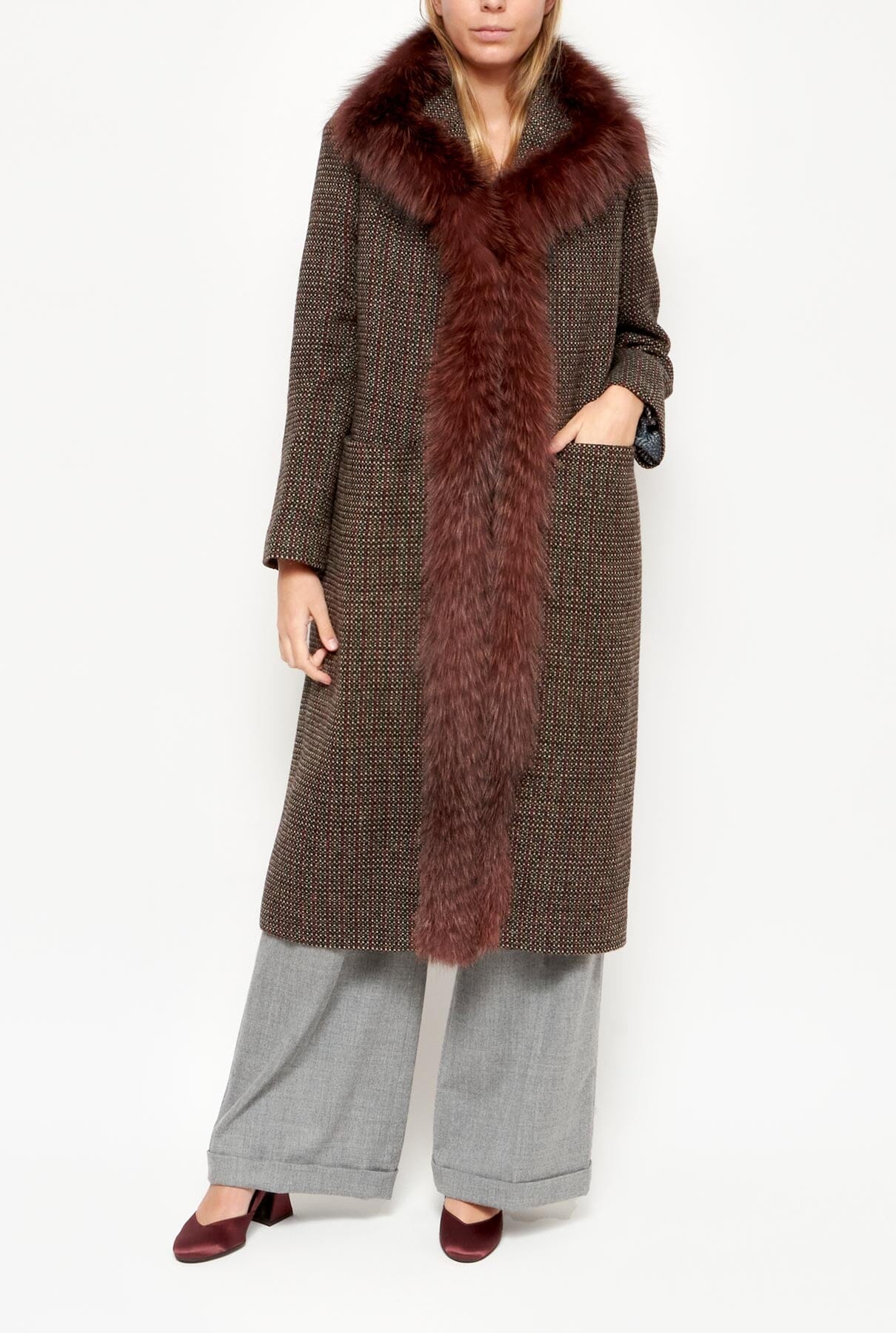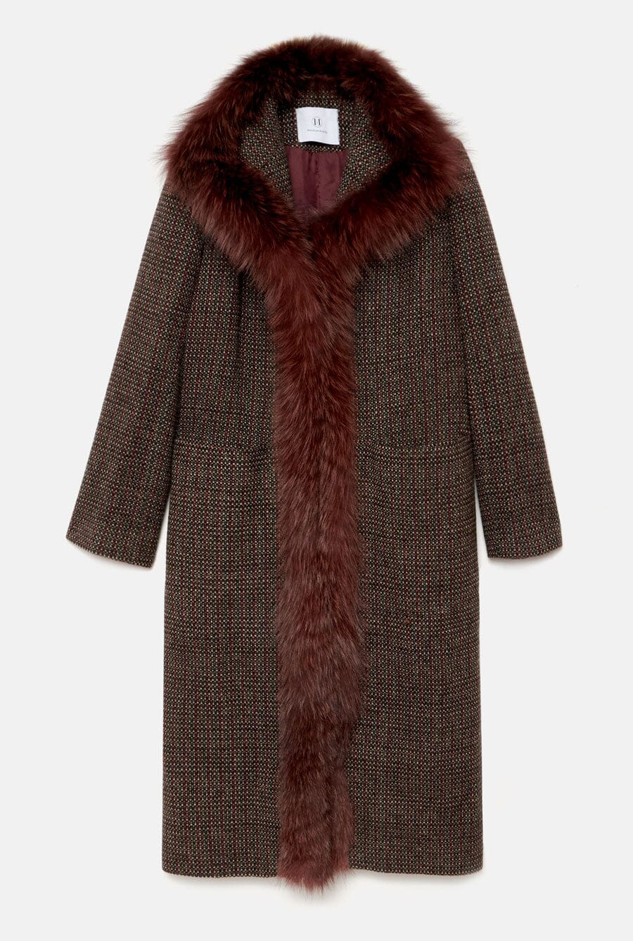Escudo de la firma Miguel Marinero. Abrigo largo marinero cruzado en lana merino marrón con detalle de pelo en cuello y vistas. Uno de los abrigos icónicos de la firma, cálido y envolvente, en un color neutro que se puede combinar