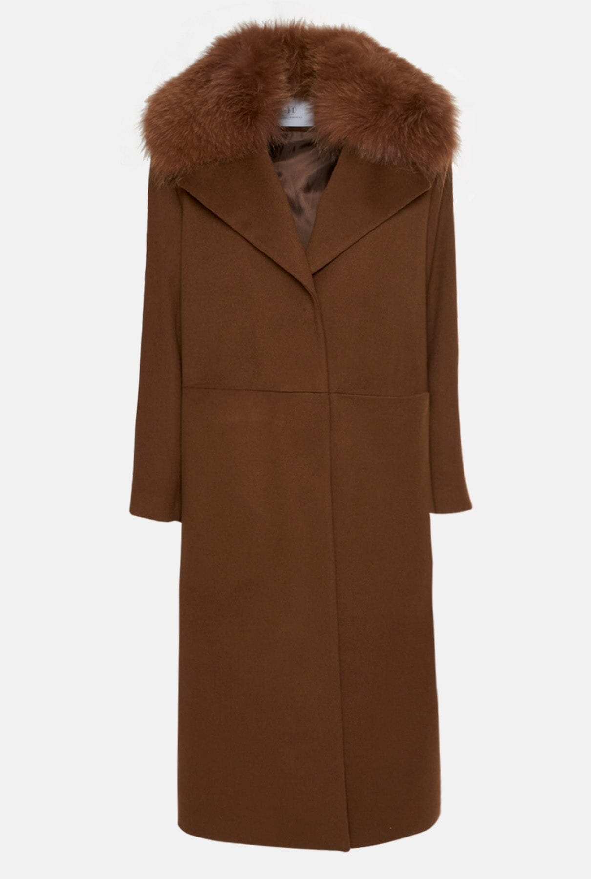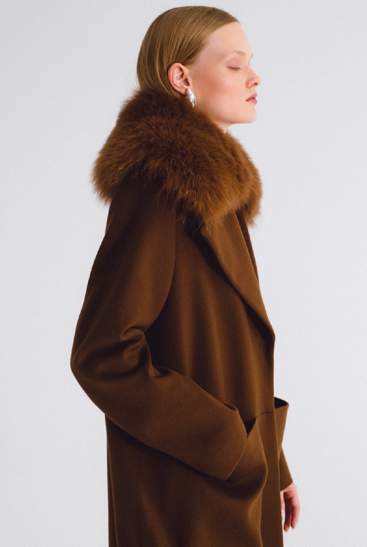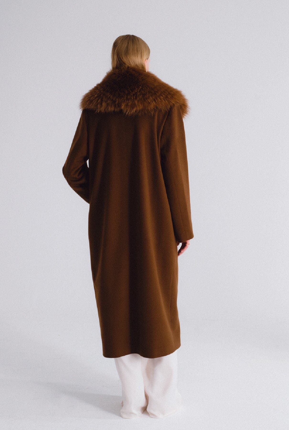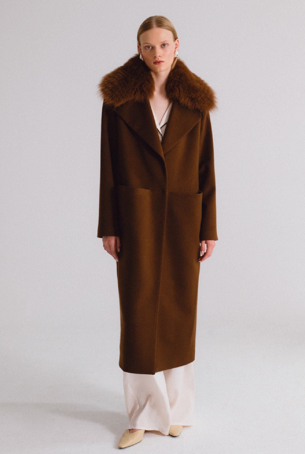 Abrigo largo y envolvente de Miguel Marinero en lana merino marrón con detalle de pelo desmontable en el cuello. Uno de los abrigos icónicos de la firma en el color de la temporada, cálido y envolvente, neutro y muy combinable con cualquier prenda del armario. El cuello de pelo es desmontable con botones, puedes quitarlo o cambiarlo por otro color. Se cierra con botones a presión.