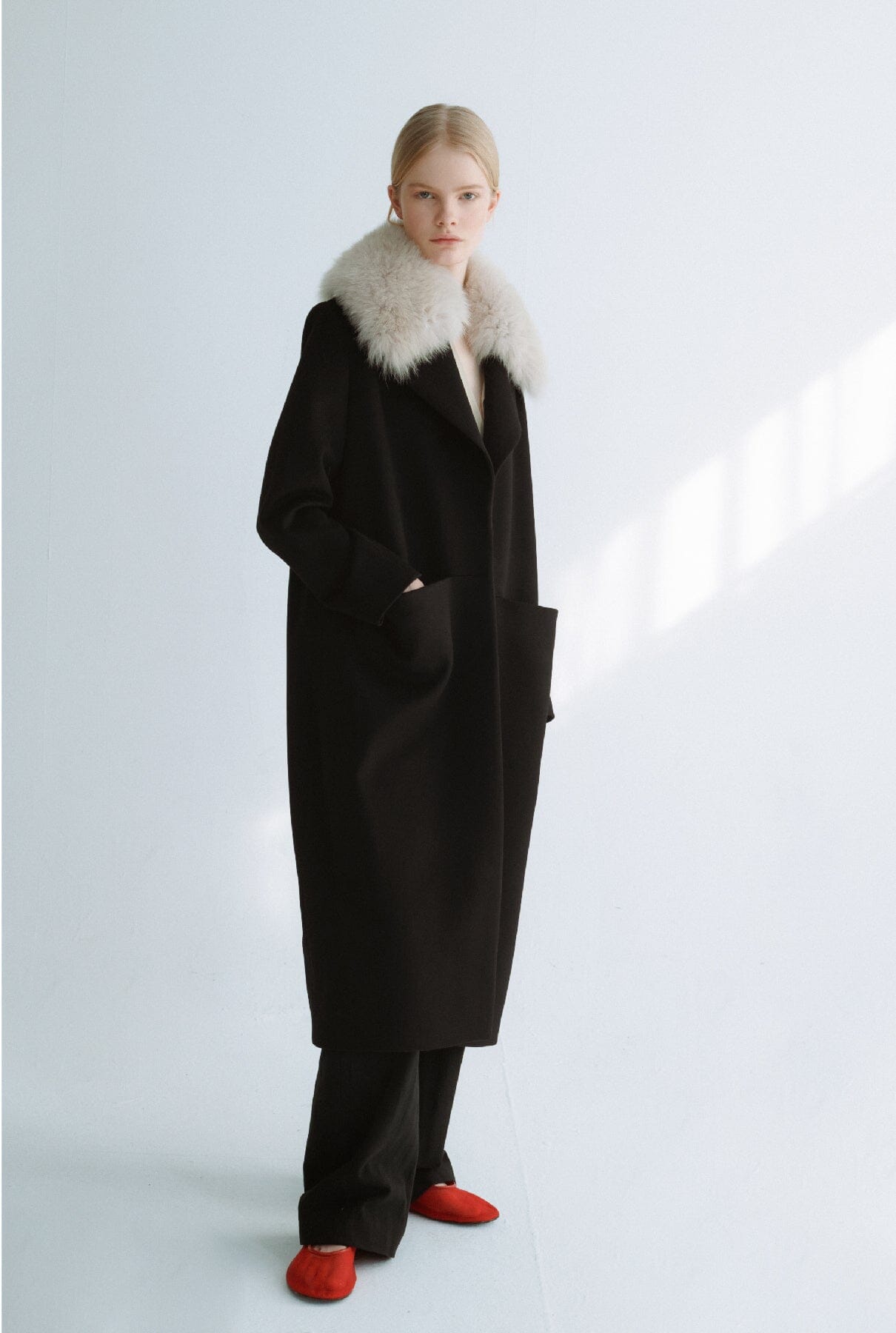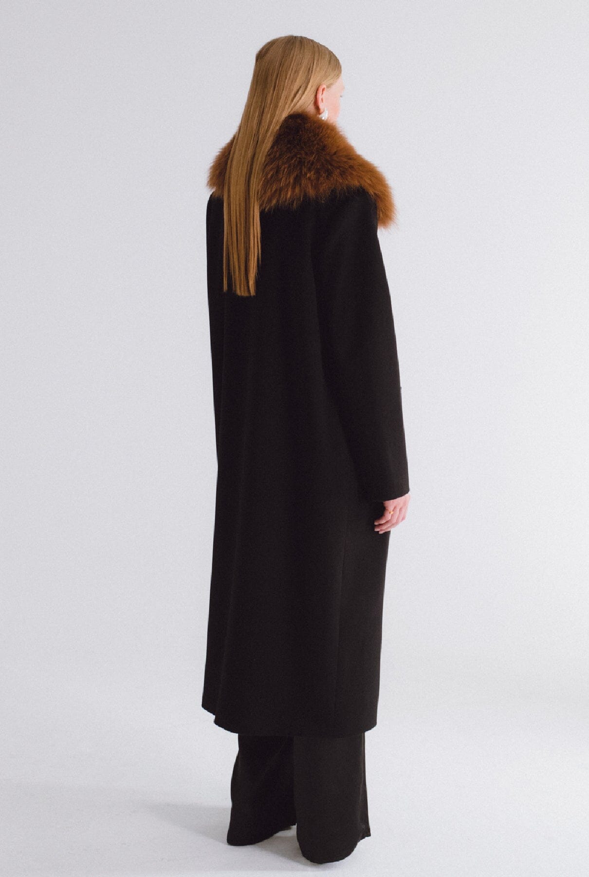 Abrigo largo y envolvente de Miguel Marinero en lana merino marrón con detalle de pelo desmontable en el cuello. Uno de los abrigos icónicos de la firma en color negro y cuello de pelo en el color de la temporada, cálido y envolvente, neutro y muy combinable con cualquier prenda del armario. El cuello de pelo es desmontable con botones, puedes quitarlo o cambiarlo por otro color. Se cierra con botones a presión.