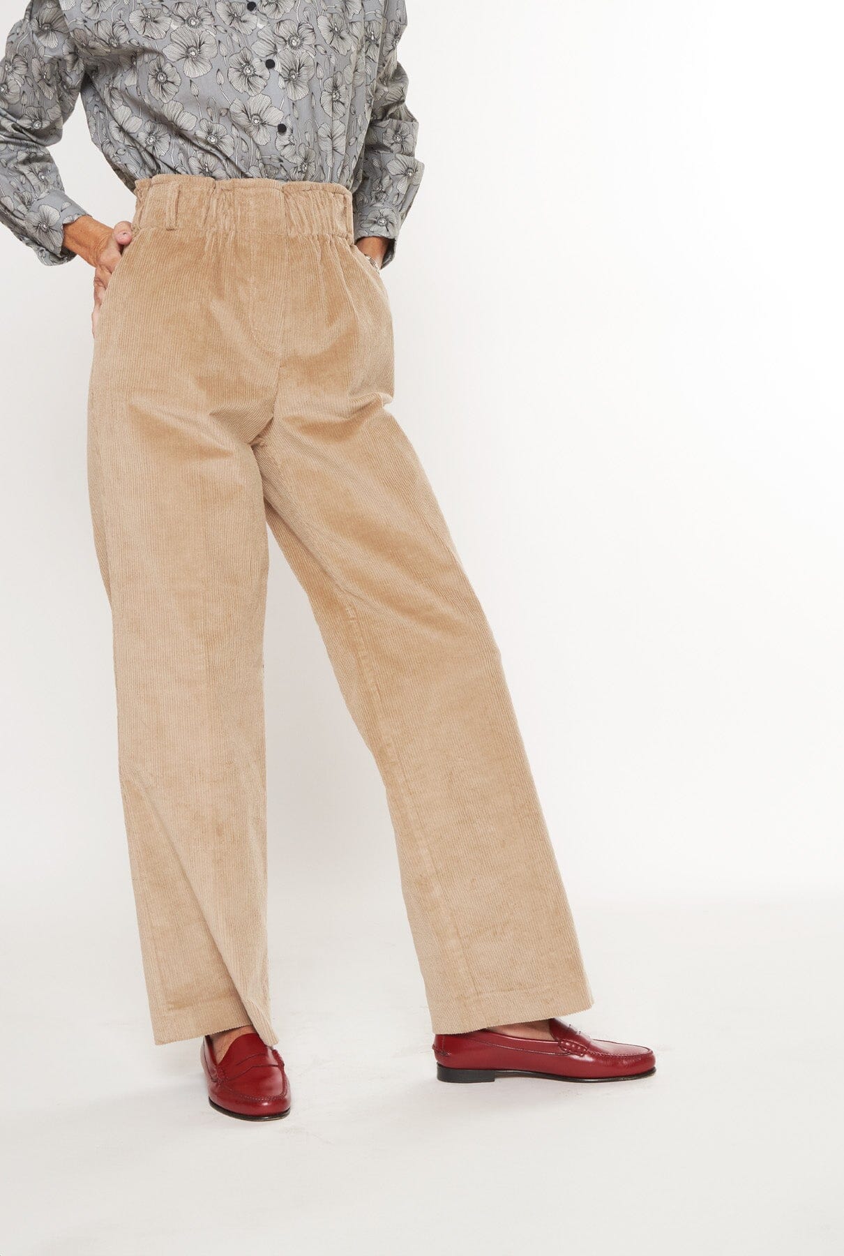 Pantalón de talle alto en pana ligeramente elástica. Cinturilla ancha con goma y trabillas para cinturón. Con bolsillos laterales.