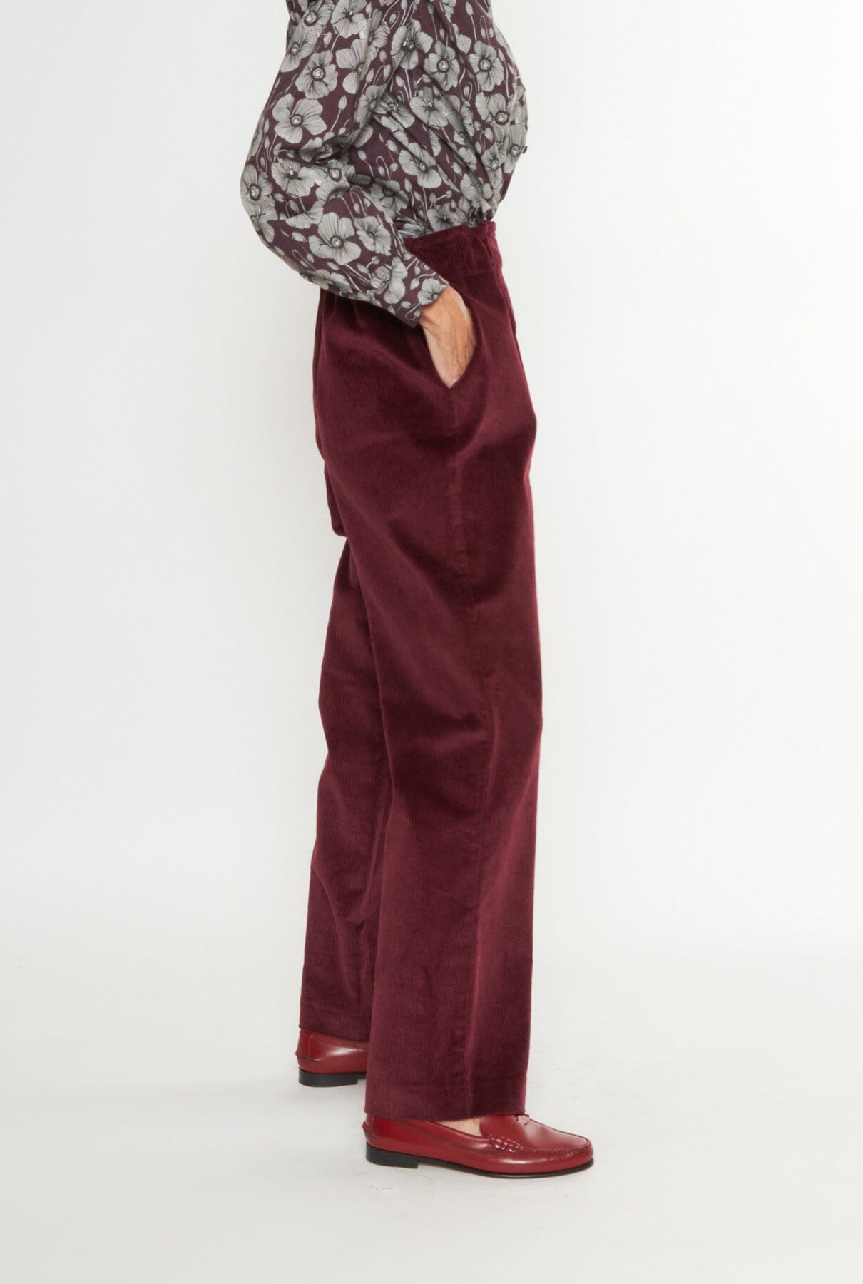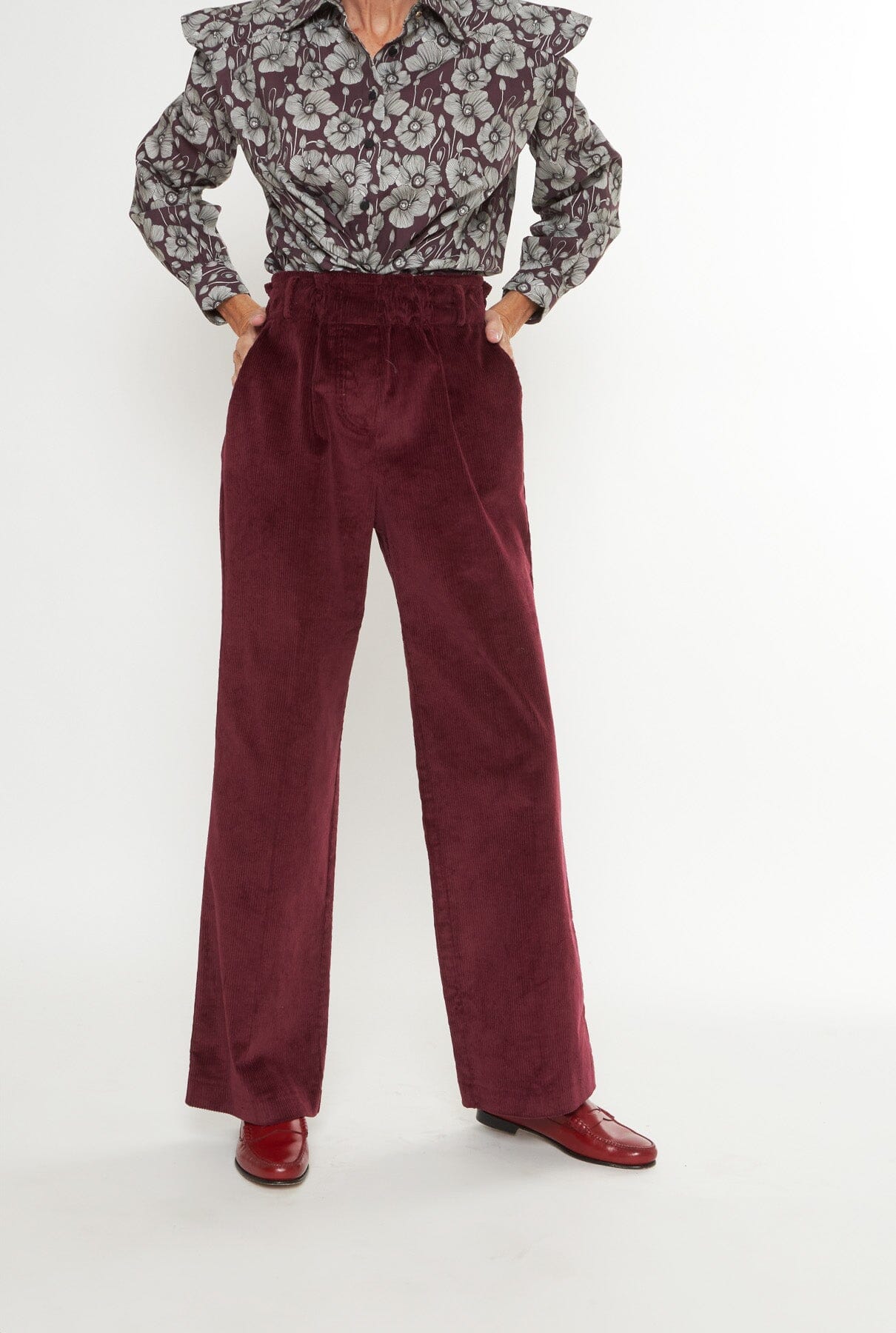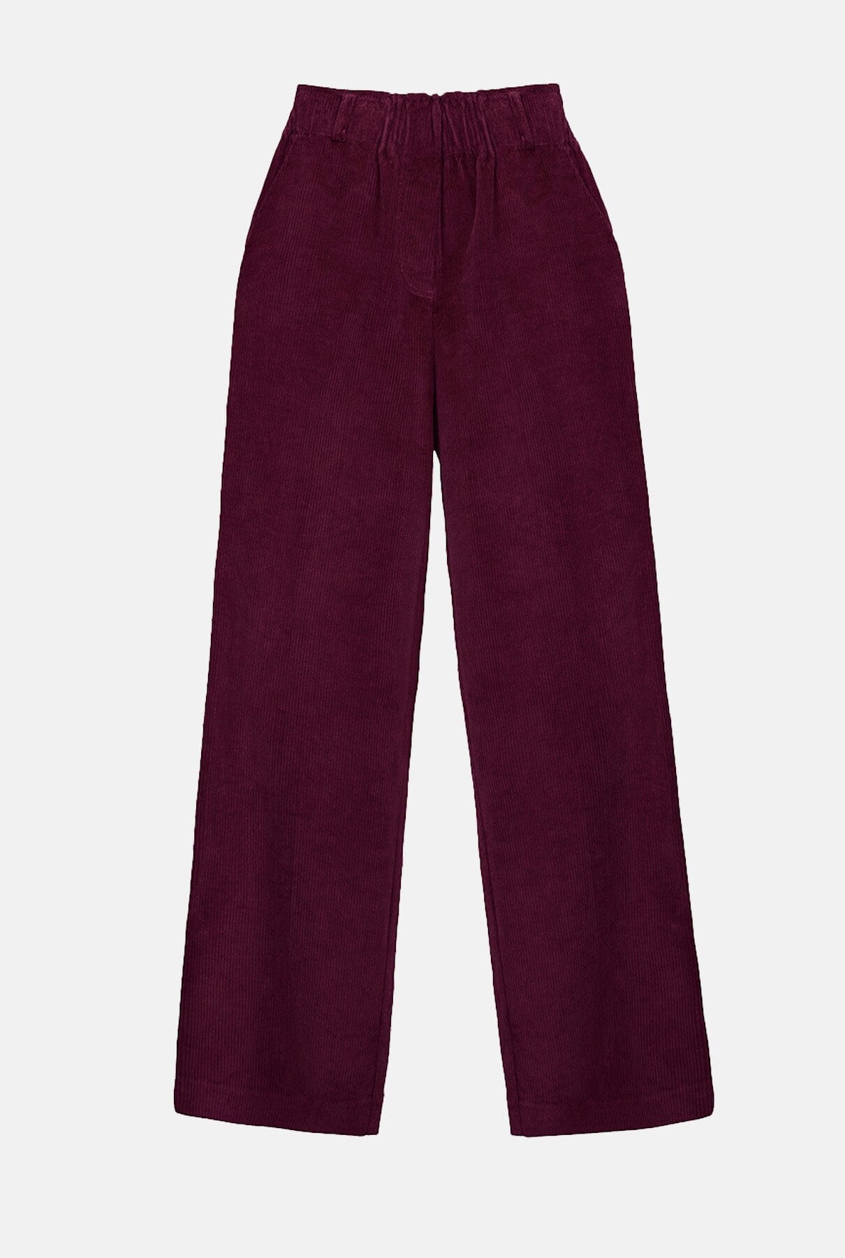Pantalón de talle alto en pana ligeramente elástica. Cinturilla ancha con goma y trabillas para cinturón. Con bolsillos laterales.
