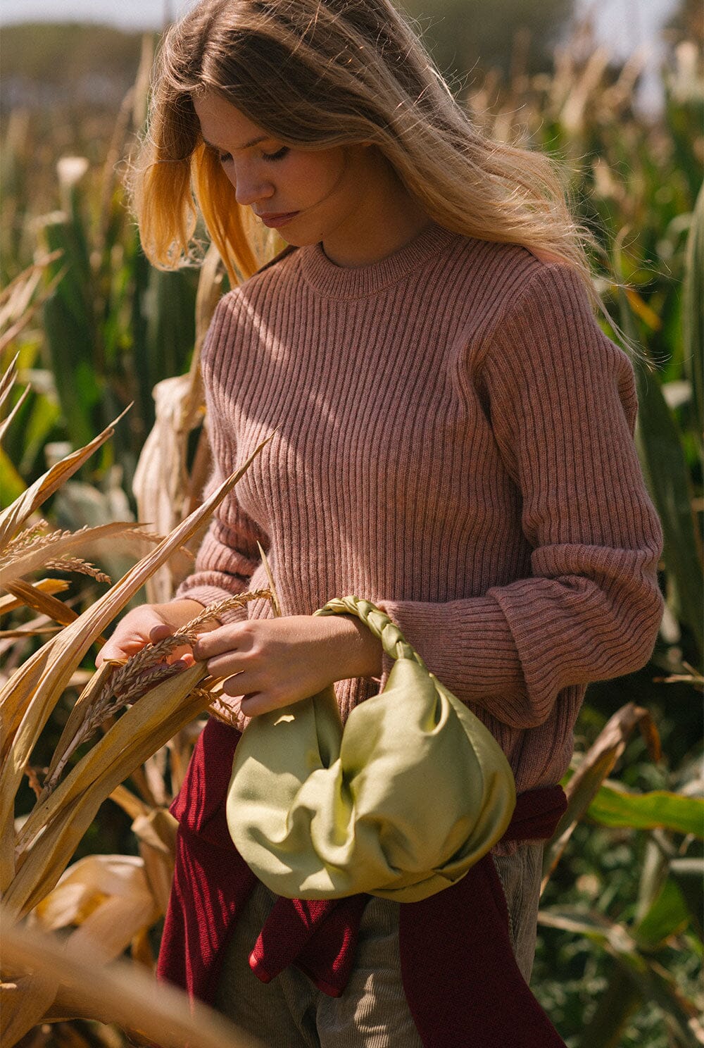 El suéter de punto acanalado Alejandra es un suéter clásico de cuello redondo en un intenso tono rosa claro jaspeado. Tiene elegantes mangas acampanadas y textura acanalada.