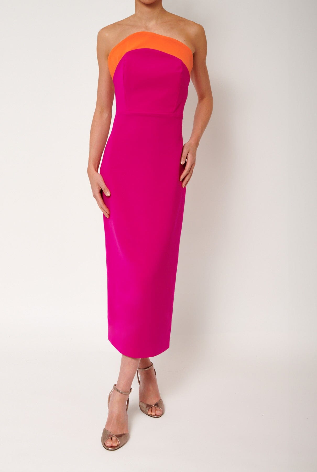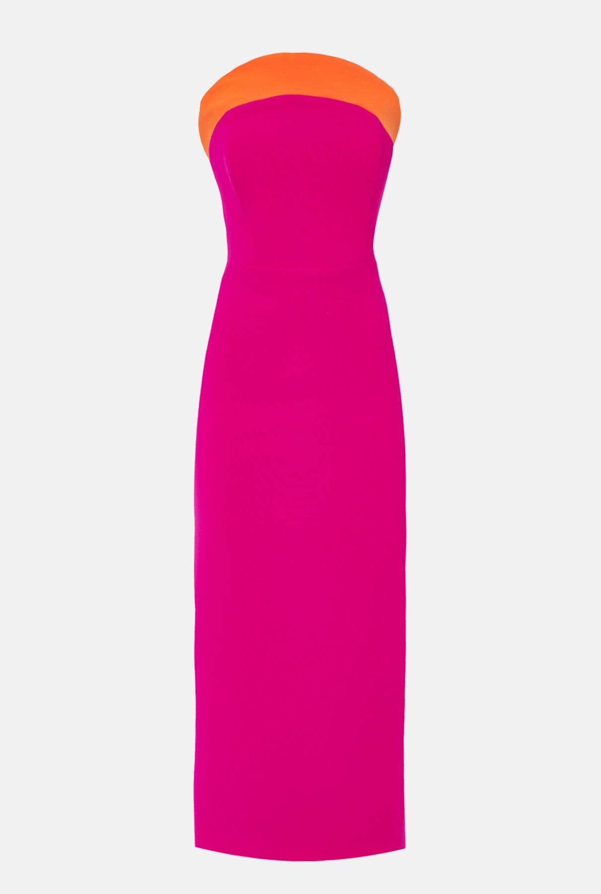 Vestido midi bicolor, con escote palabra de honor asimétrico. Falda con abertura trasera, forro y cremallera en la espalda. Disponible en tres colores. Hecho en España.