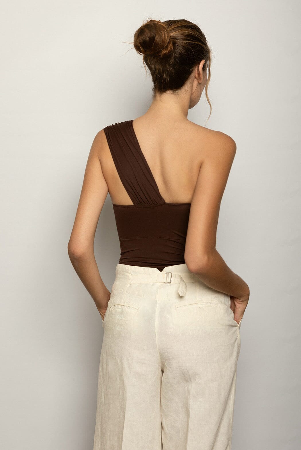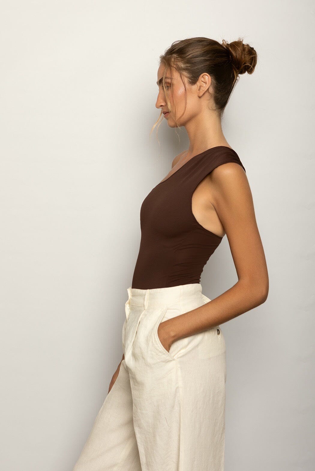 Este Body de licra color café con canalé y escote asimétrico para un look moderno y esculpido. La textura acanalada añade un sutil detalle, mientras que el tejido elástico ofrece un ajuste favorecedor y cómodo. Una prenda esencial minimalista con un toque contemporáneo.