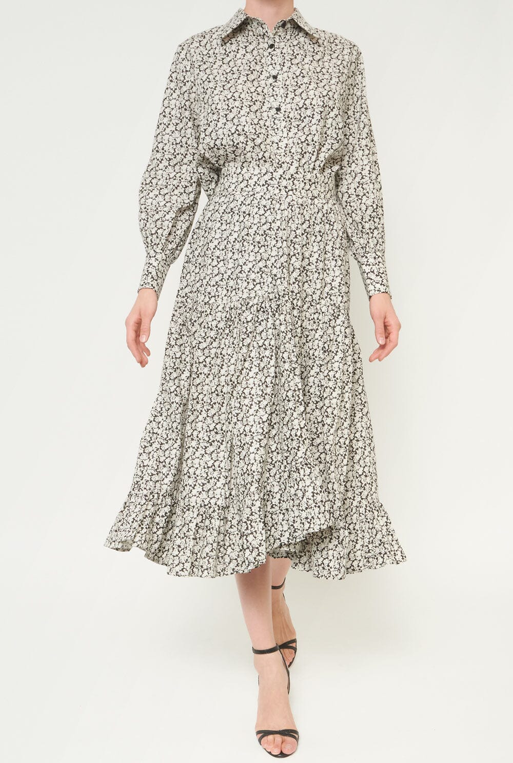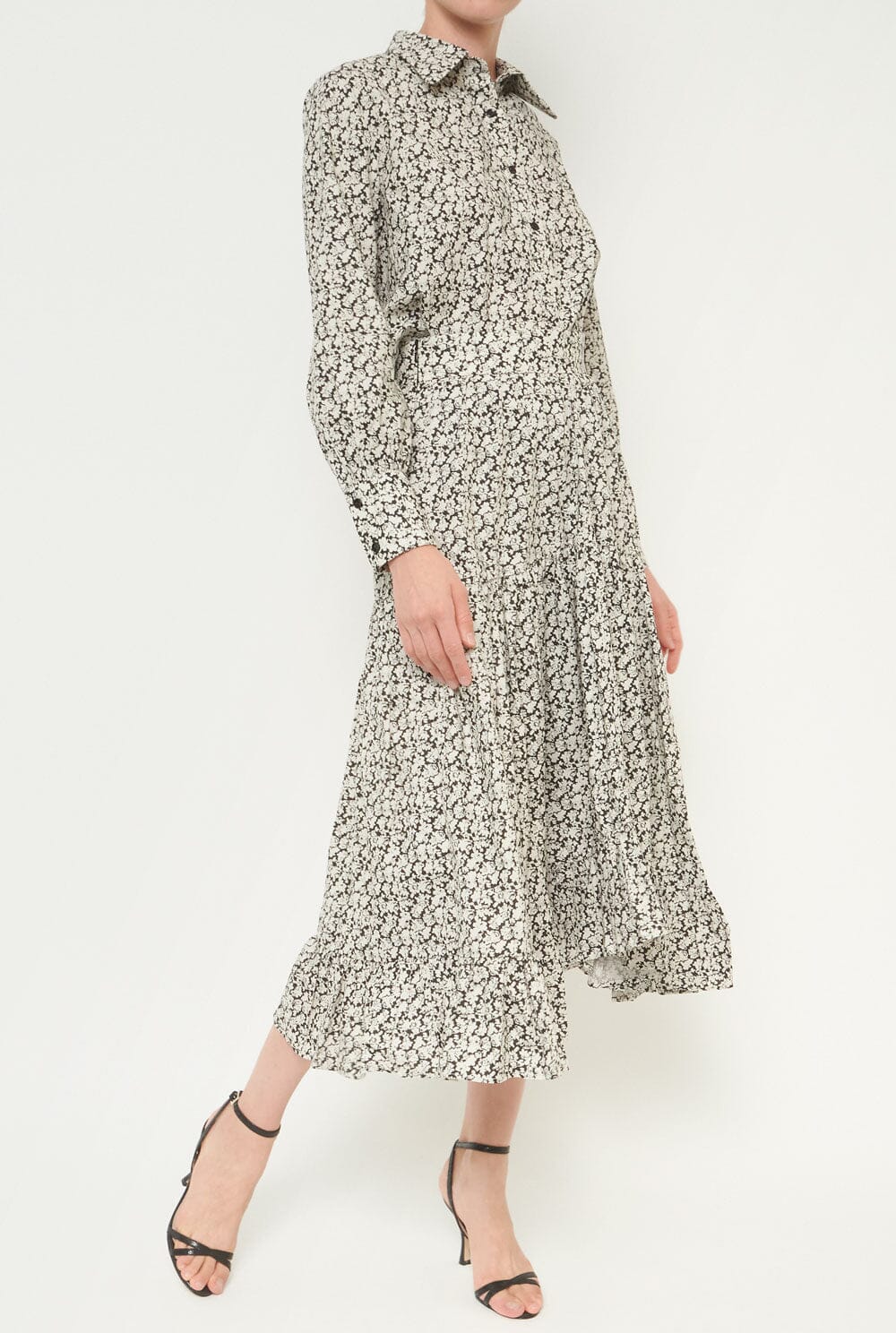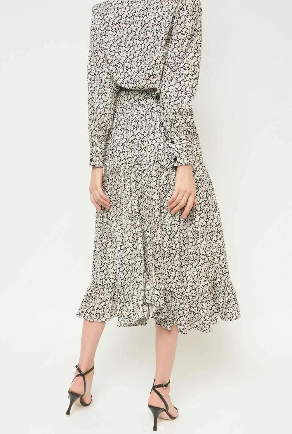 Falda midi asimétrica negra con flores liberty blancas. Hecho en España