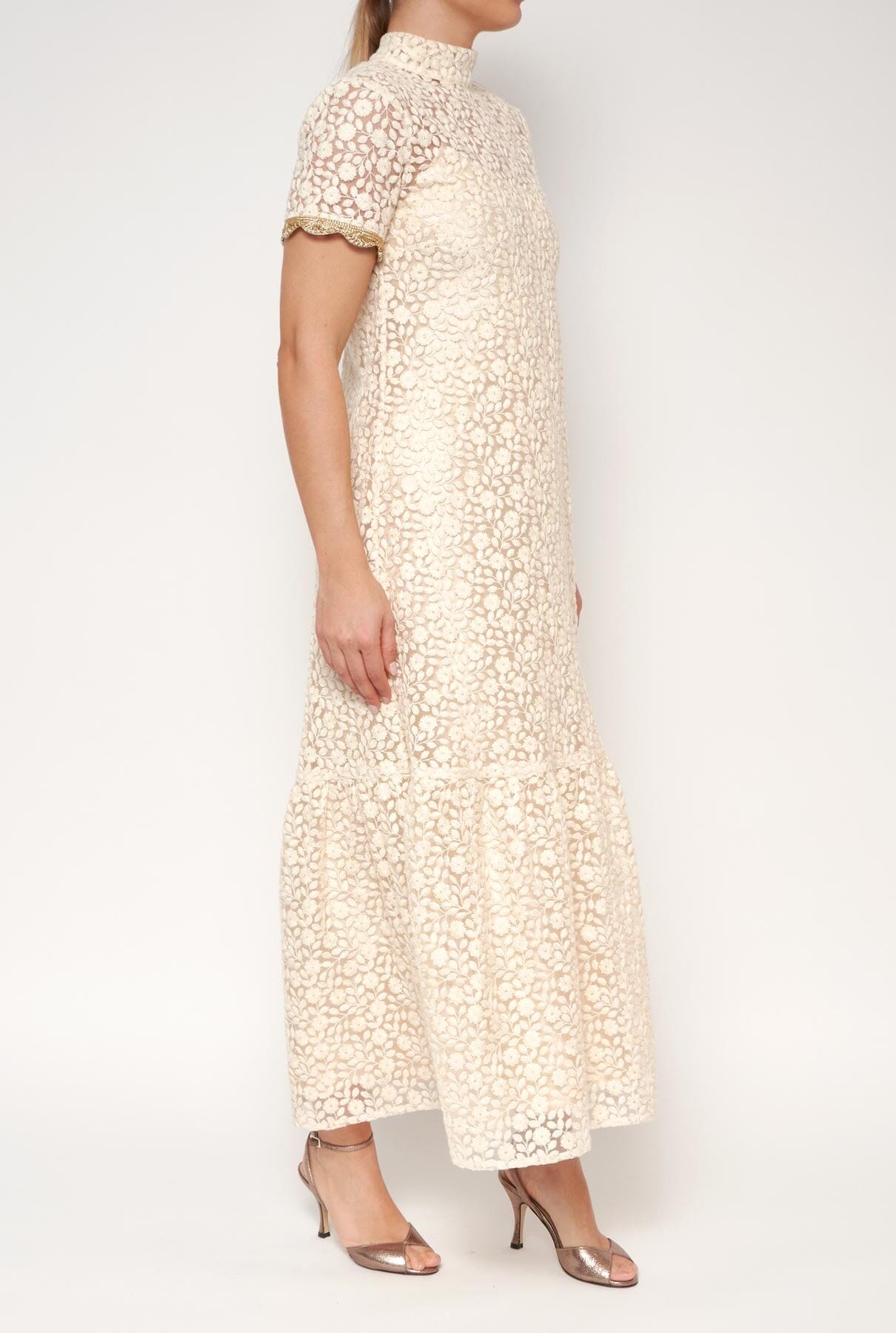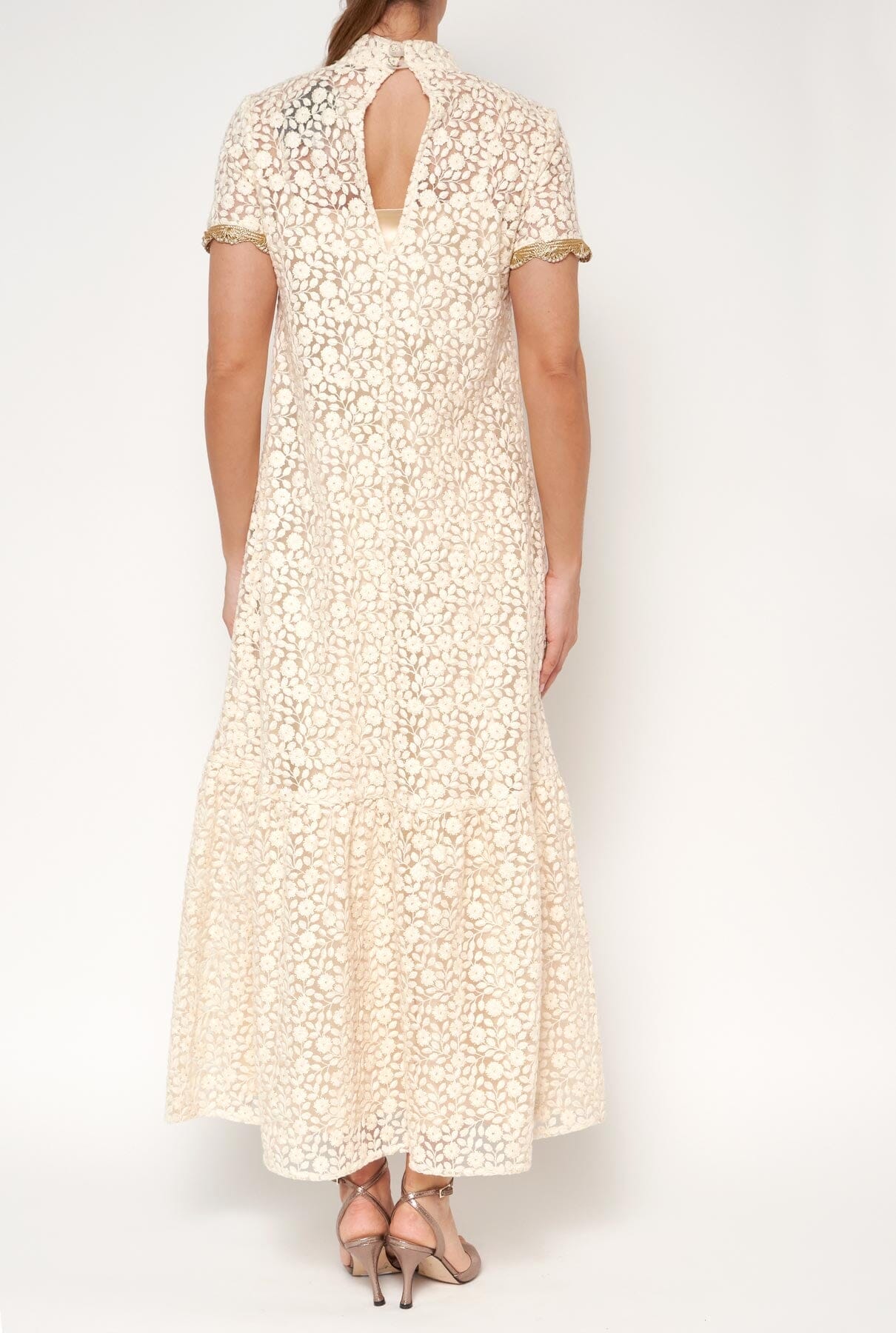 Diseño femenino y versátil que te hará sentir especial. Confeccionado en tul bordado con flores, con hilos y detalles dorados. Diseño fluido y semitransparente de cuello alto. Detalle de ribete dorado en manga. Bajo rematado en volante y cierre trasero con botón joya. Incluye un vestido lencero de satén beige.