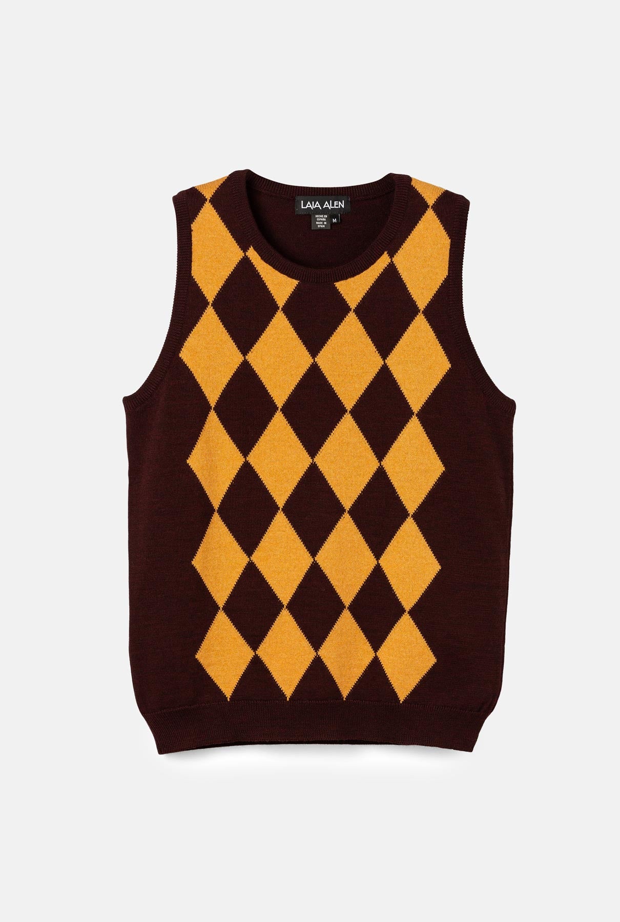 Nos encanta añadir motivos retro en nuestras colecciones de punto y este chaleco es un ejemplo. Este jersey está tejido con un patrón de rombos tradicional en la parte delantera. Use el suyo solo o en capas sobre una camisa blanca impecable. Diseñado por Laia Alen.