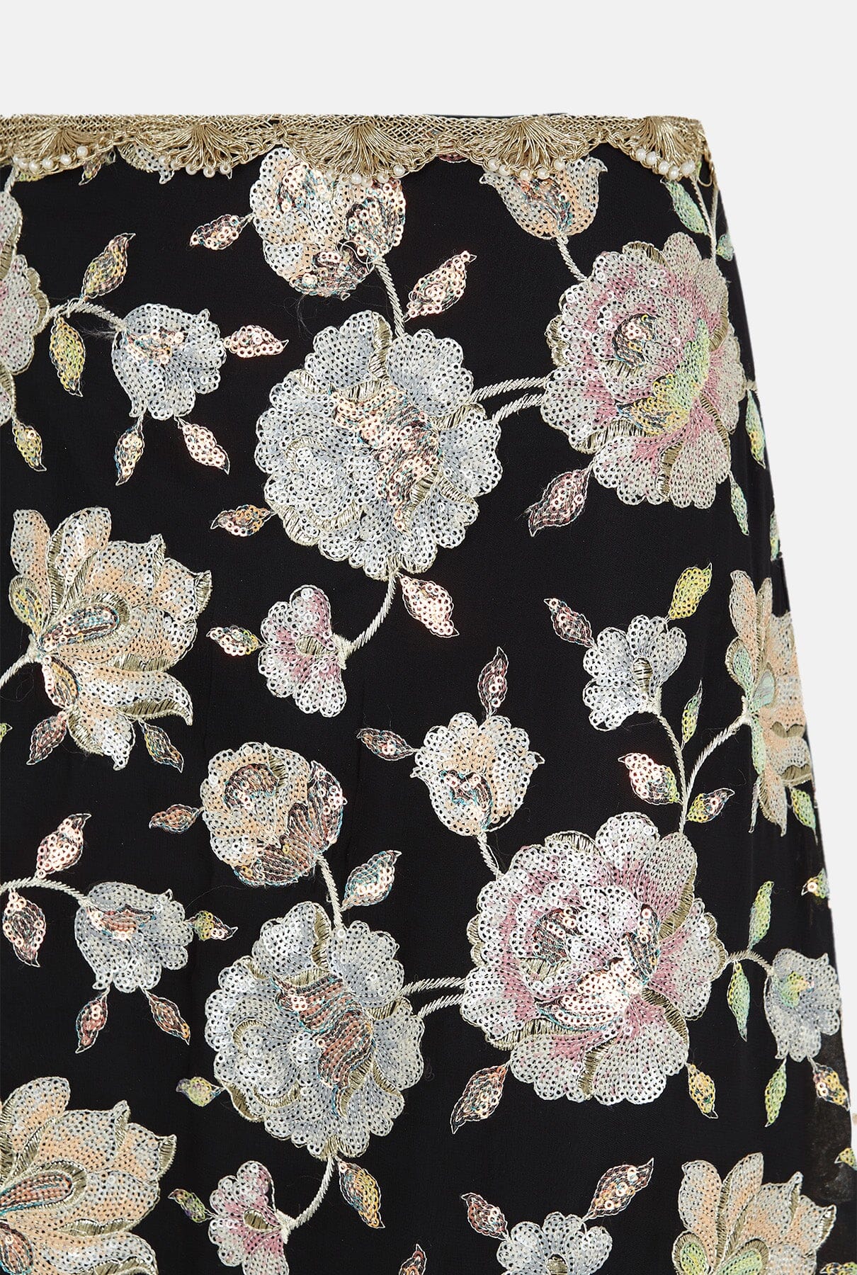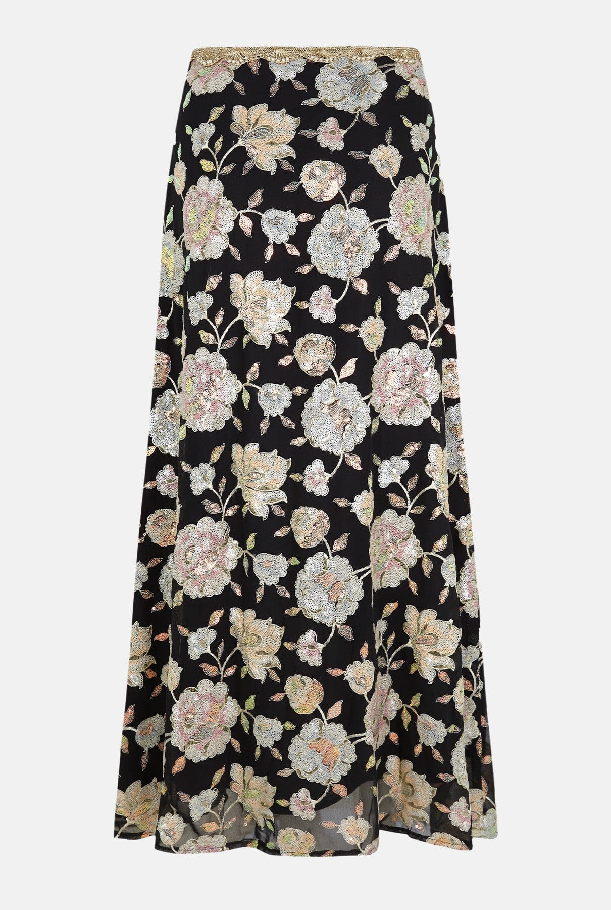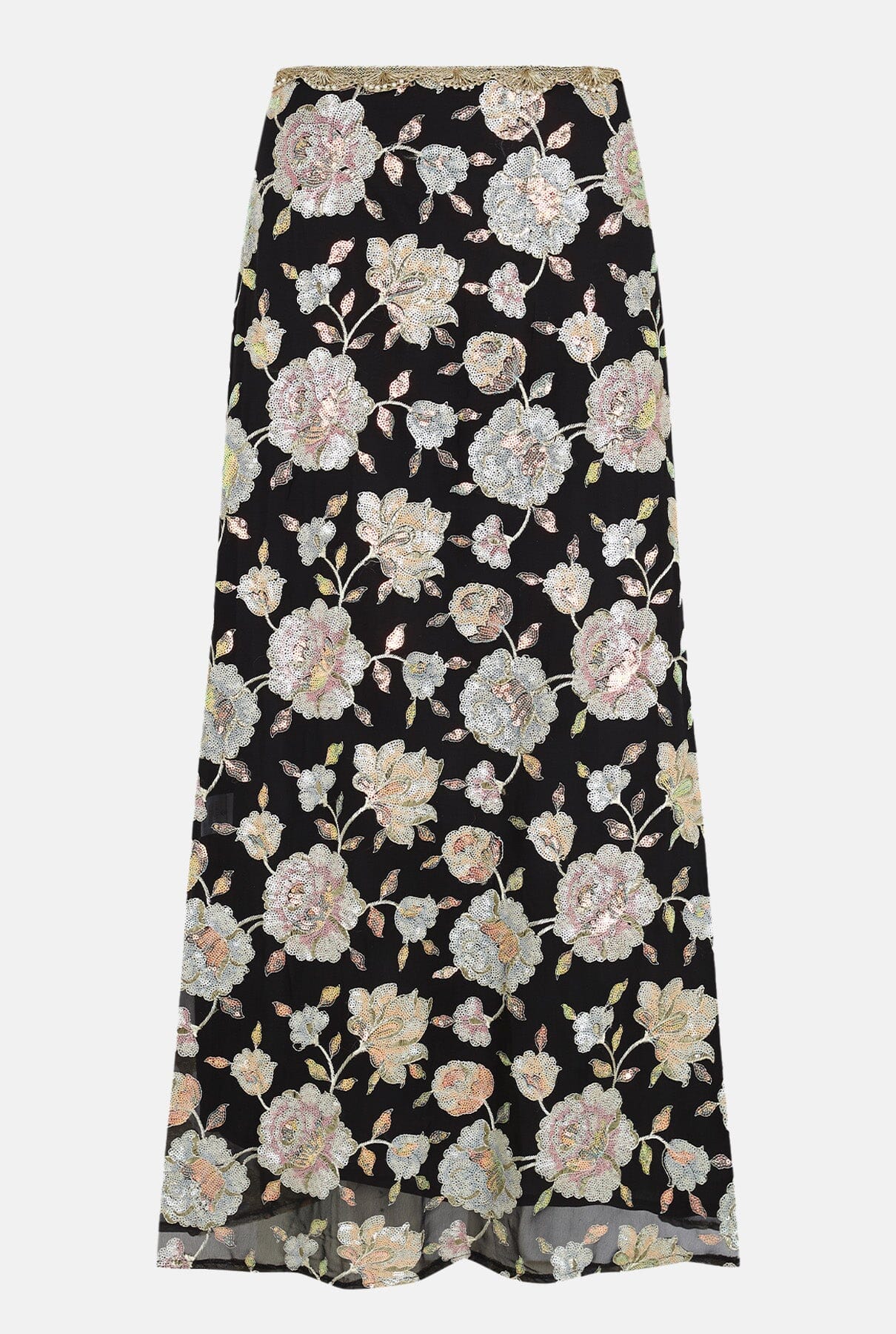 La falda larga ANAIS está confeccionada en georgette bordado con estampado floral y aplicaciones de lentejuelas. Talle alto con detalle de ribete dorado. Cierre trasero con cremallera oculta. Forrada.