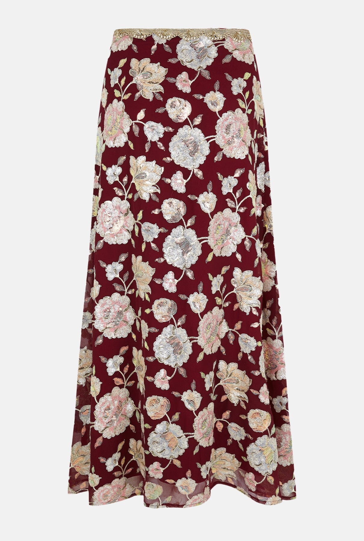 La falda larga ANAIS está confeccionada en georgette bordado con estampado floral y aplicaciones de lentejuelas. Talle alto con detalle de ribete dorado. Cierre trasero con cremallera oculta. Forrada.