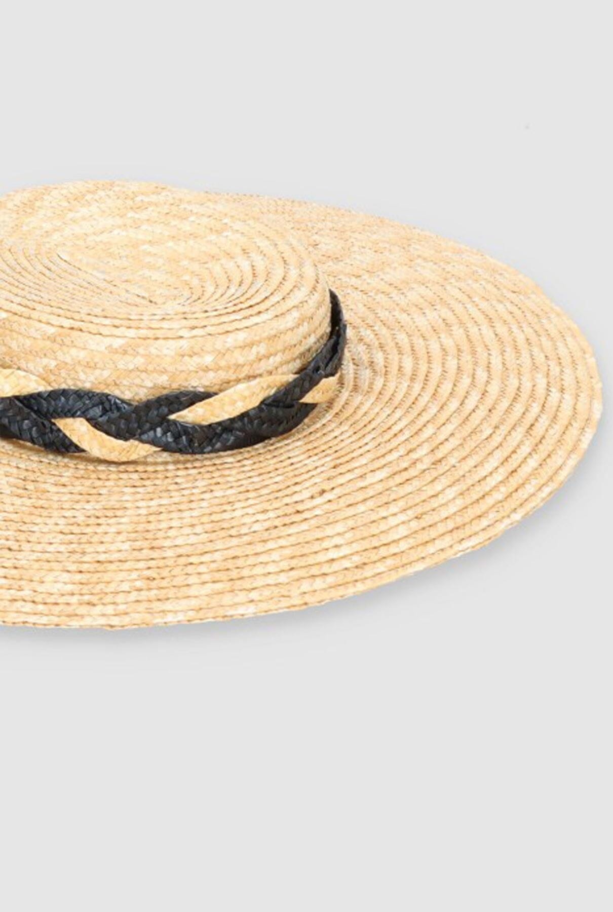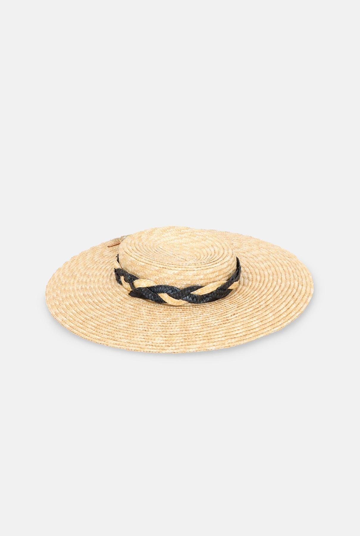 El sombrero andaluz de trenza está elaborado con paja de trigo. Tiene una copa baja y se sujeta a la cabeza con una diadema. Alrededor de la copa hay una fina trenza tejida a mano con fibras naturales. Ideal para looks de invitada.