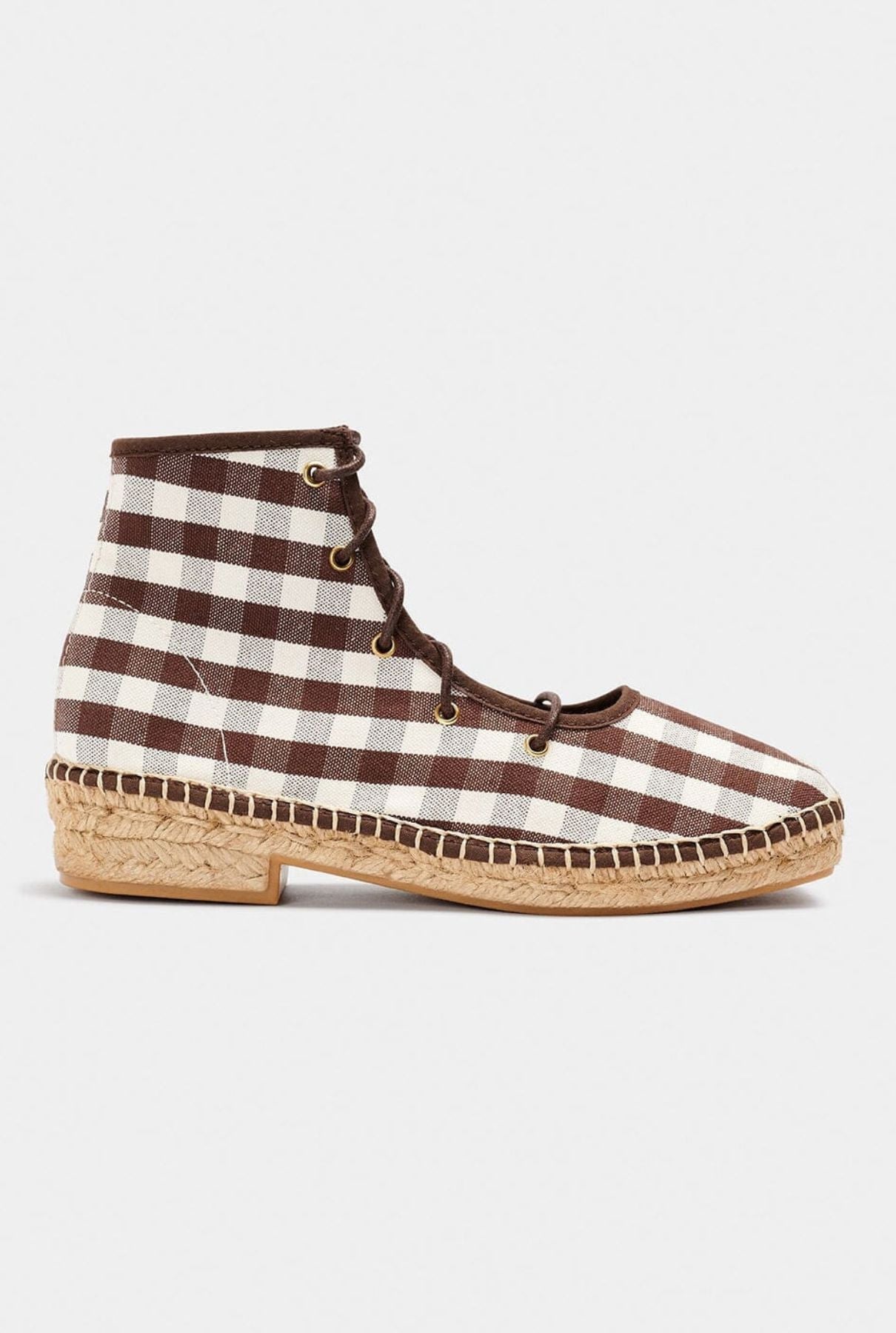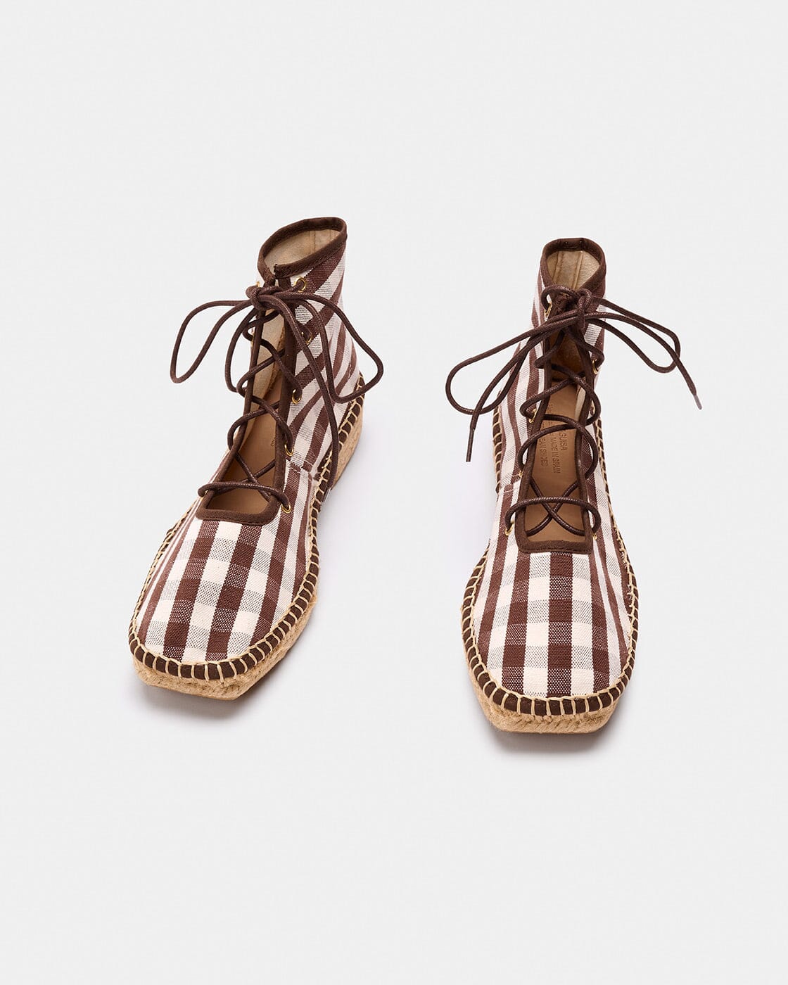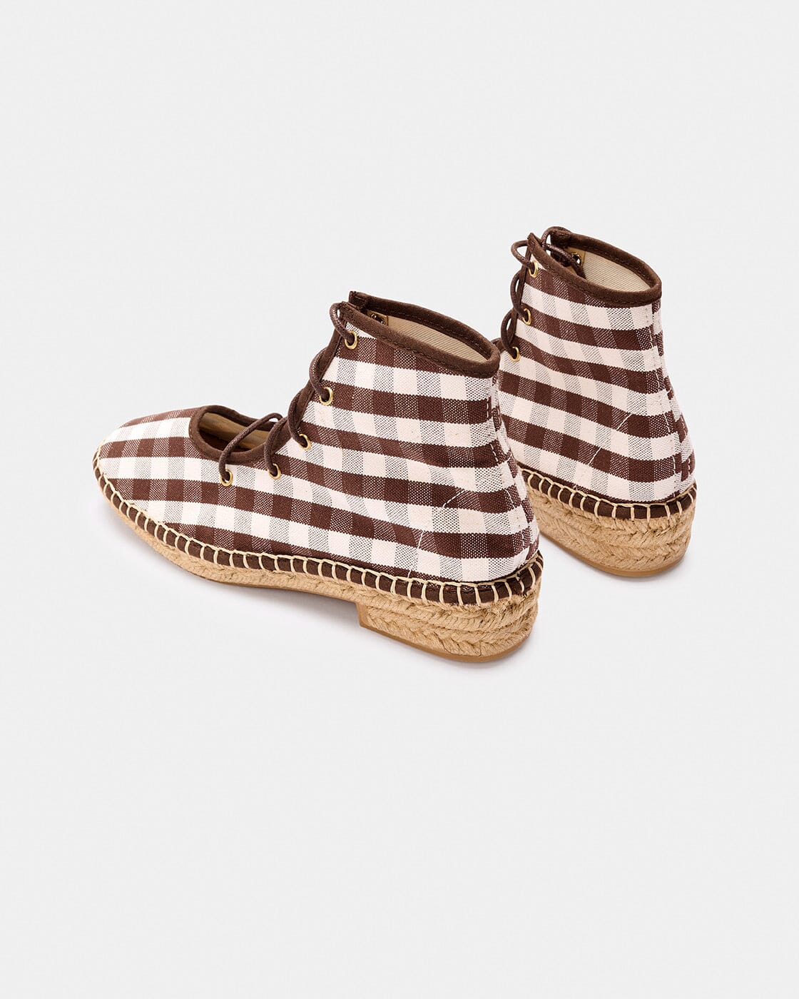 Annona es un botín abierto con cierre de cordones. La caña mide 10 cm y los cortes son de tela con forro de algodón. La suela está acolchada con espuma y forrada con piel de vacuno natural para una mejor transpiración del pie. La suela, con puntera cuadrada, está hecha con un sencillo trenzado de yute. Tiene un pequeño tacón y una suela de goma antideslizante. La altura total es de 3,5 cm.