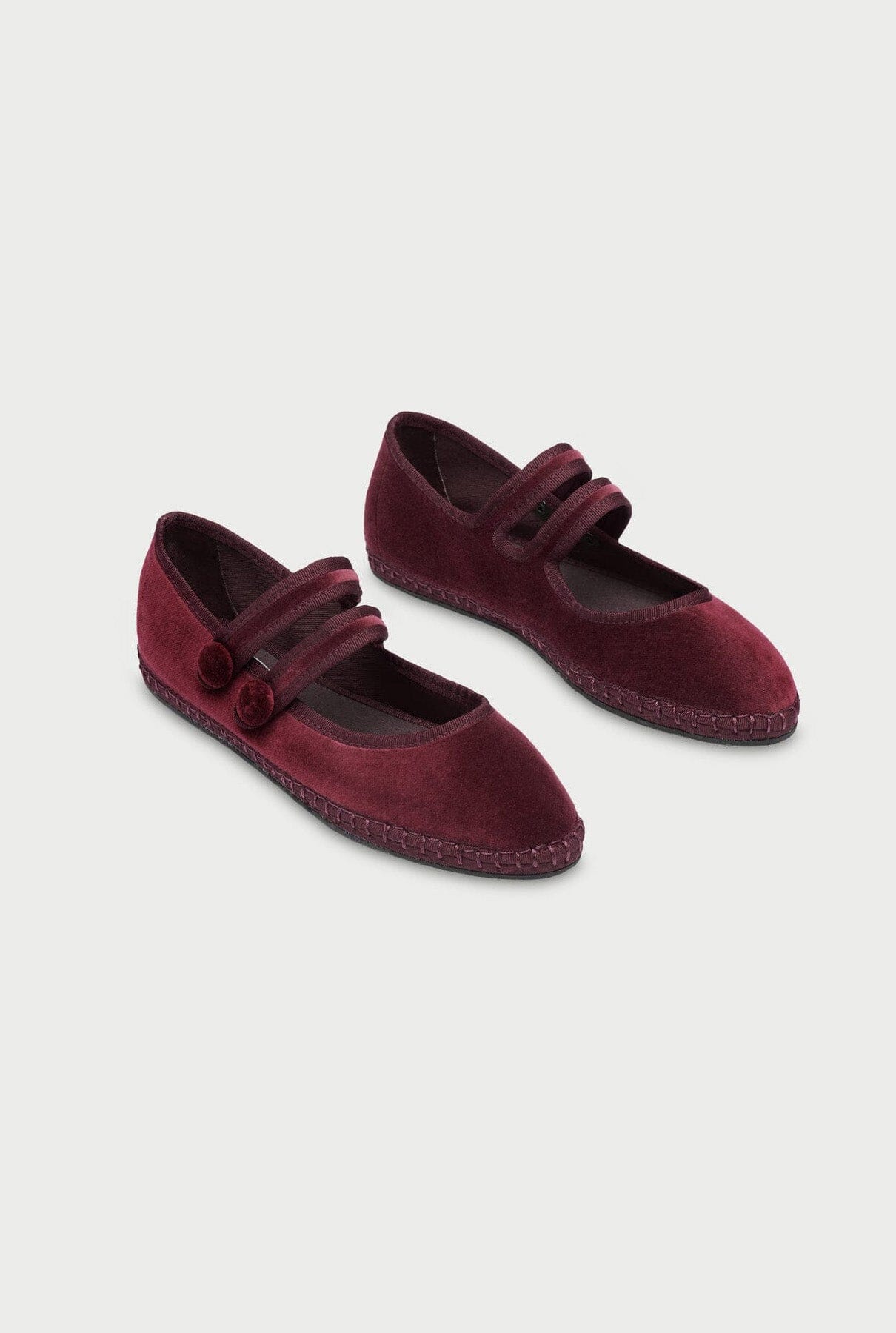 Mary Jane de terciopelo en color burdeos con vivo burdeos y botón de doble presión como cierre.