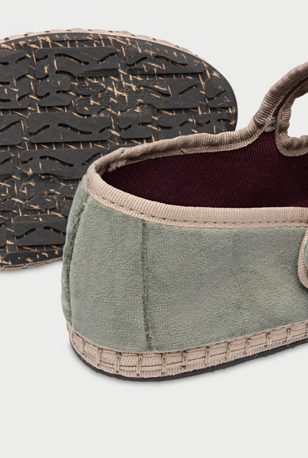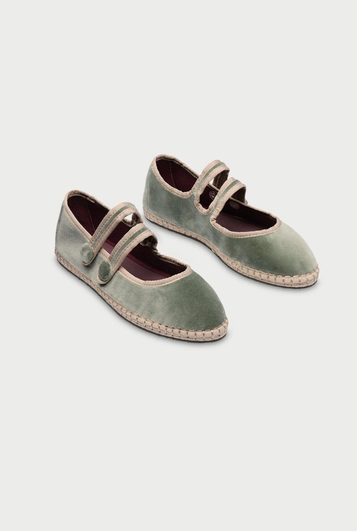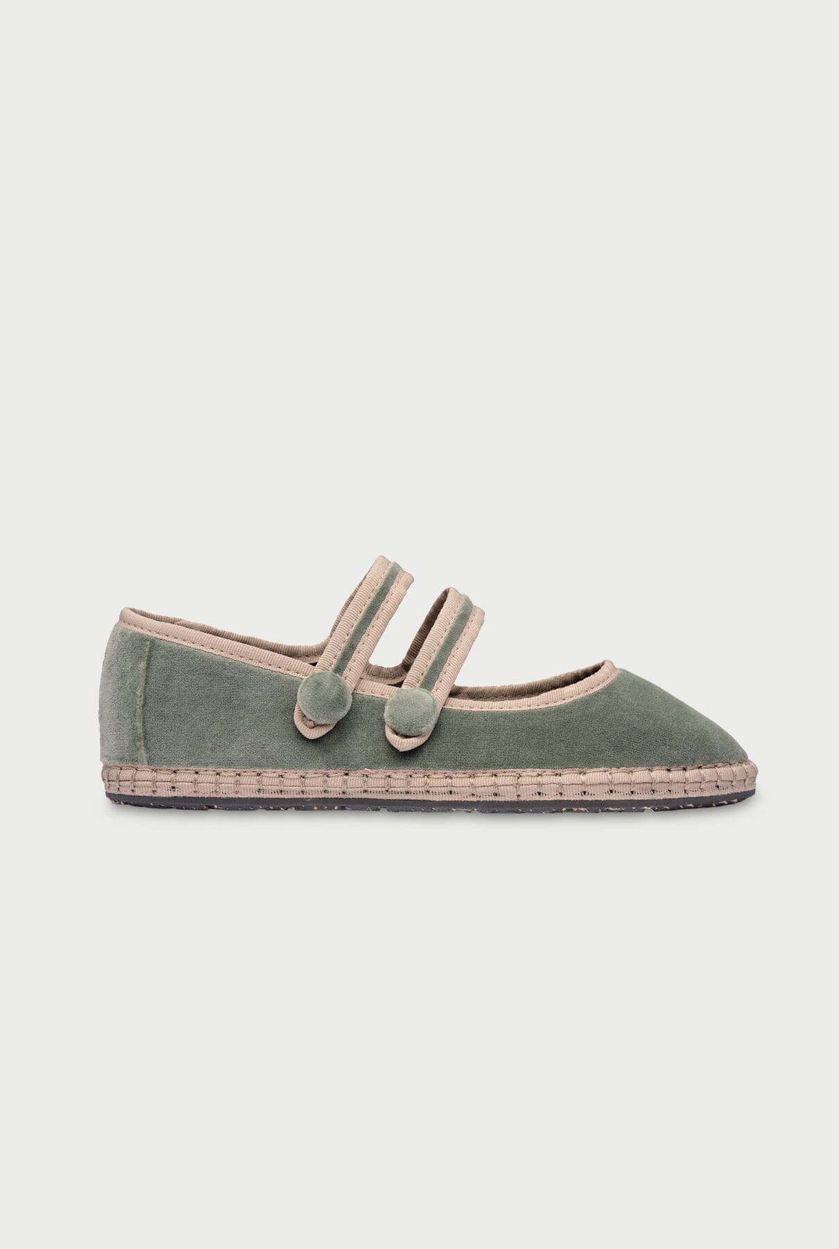 Mary Jane de terciopelo en color verde claro con ribete en beige claro y botón de doble presión como cierre.