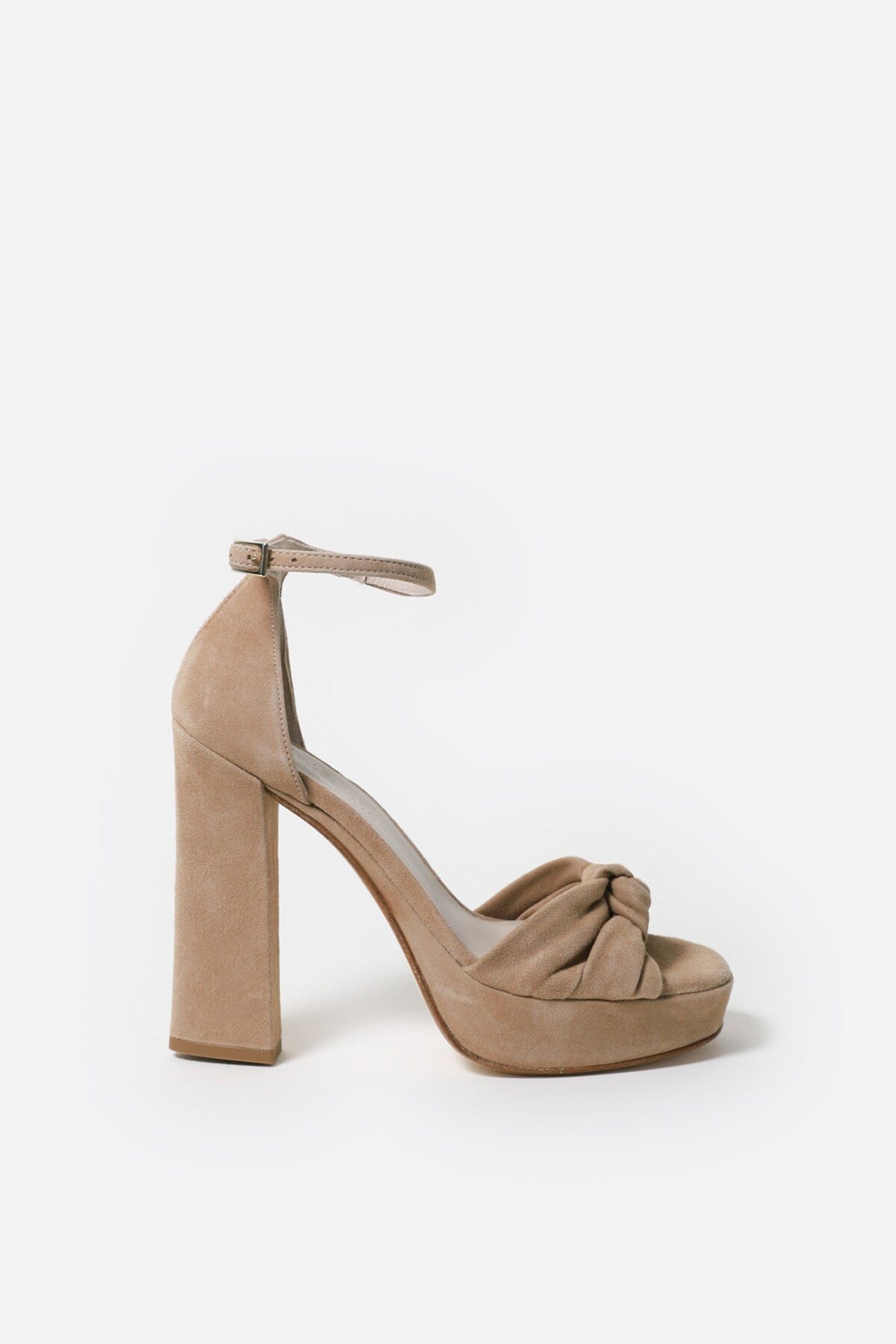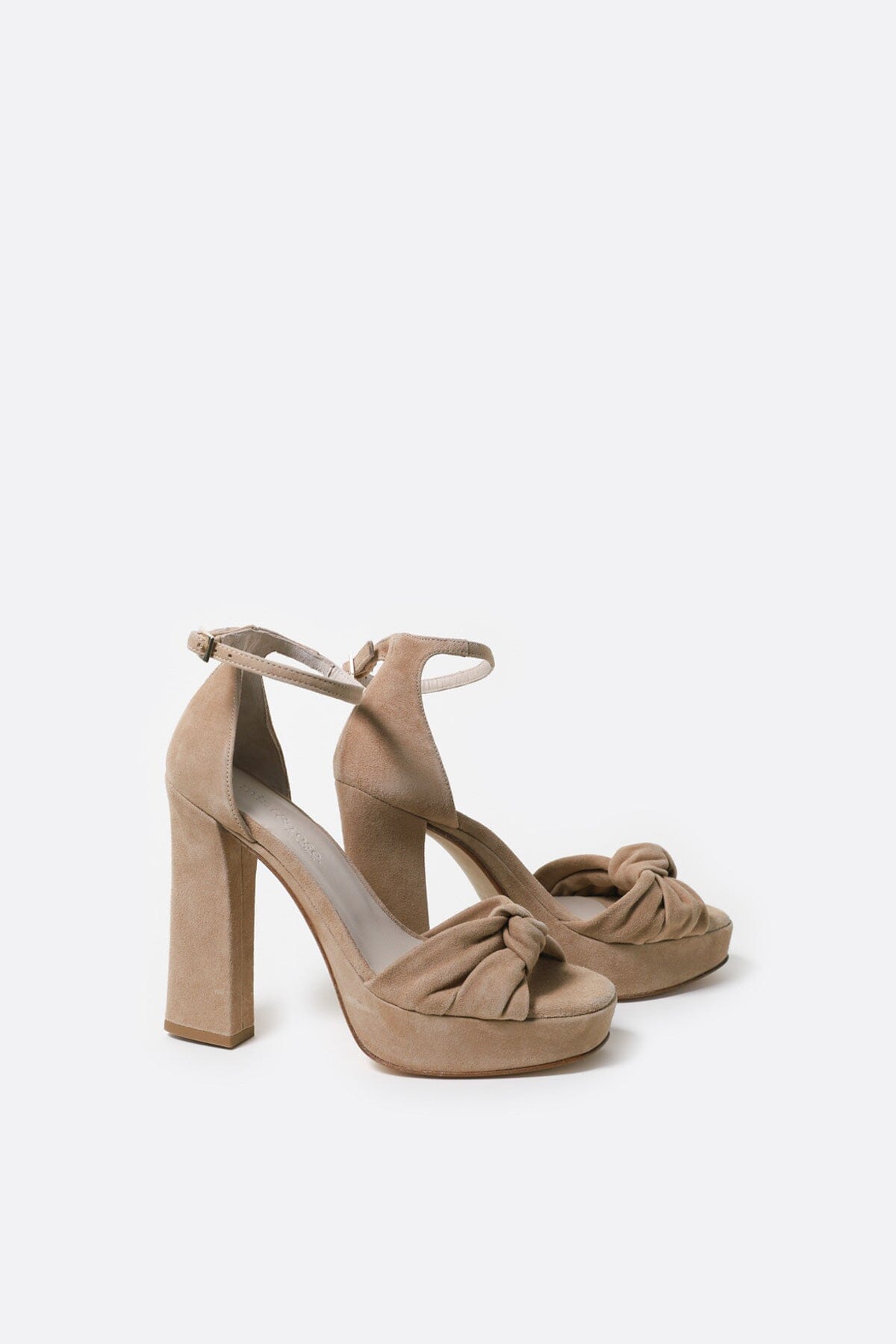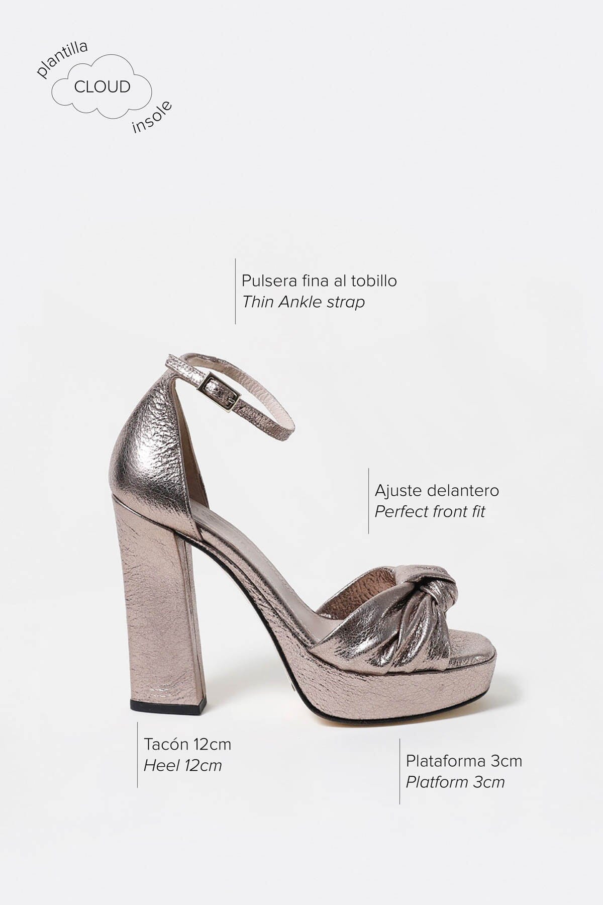 Cloud cushioned insole. The tight heel and knotted front strap ensure perfect support, and the thin ankle strap lengthens the legs. Their heel is 12 cm (including the 3 cm front platform).