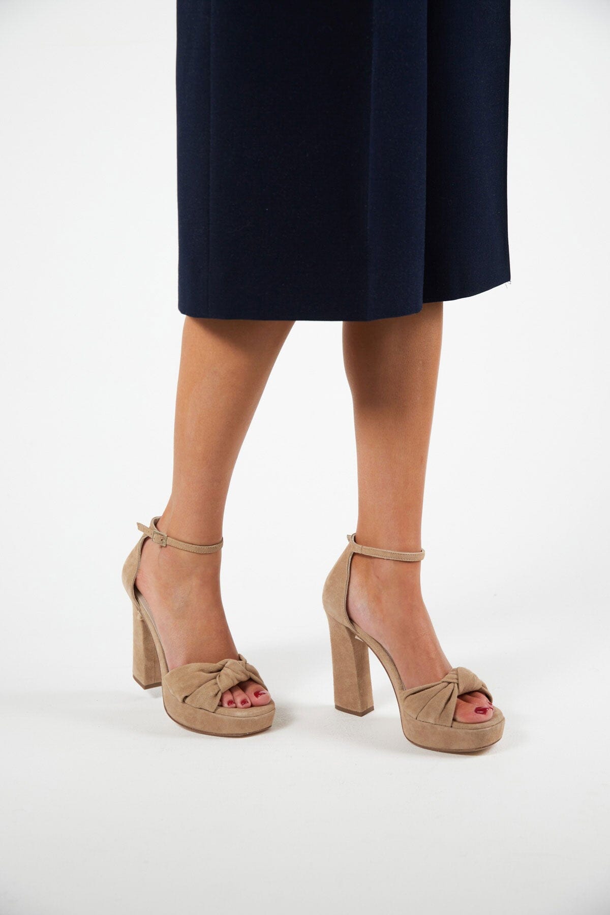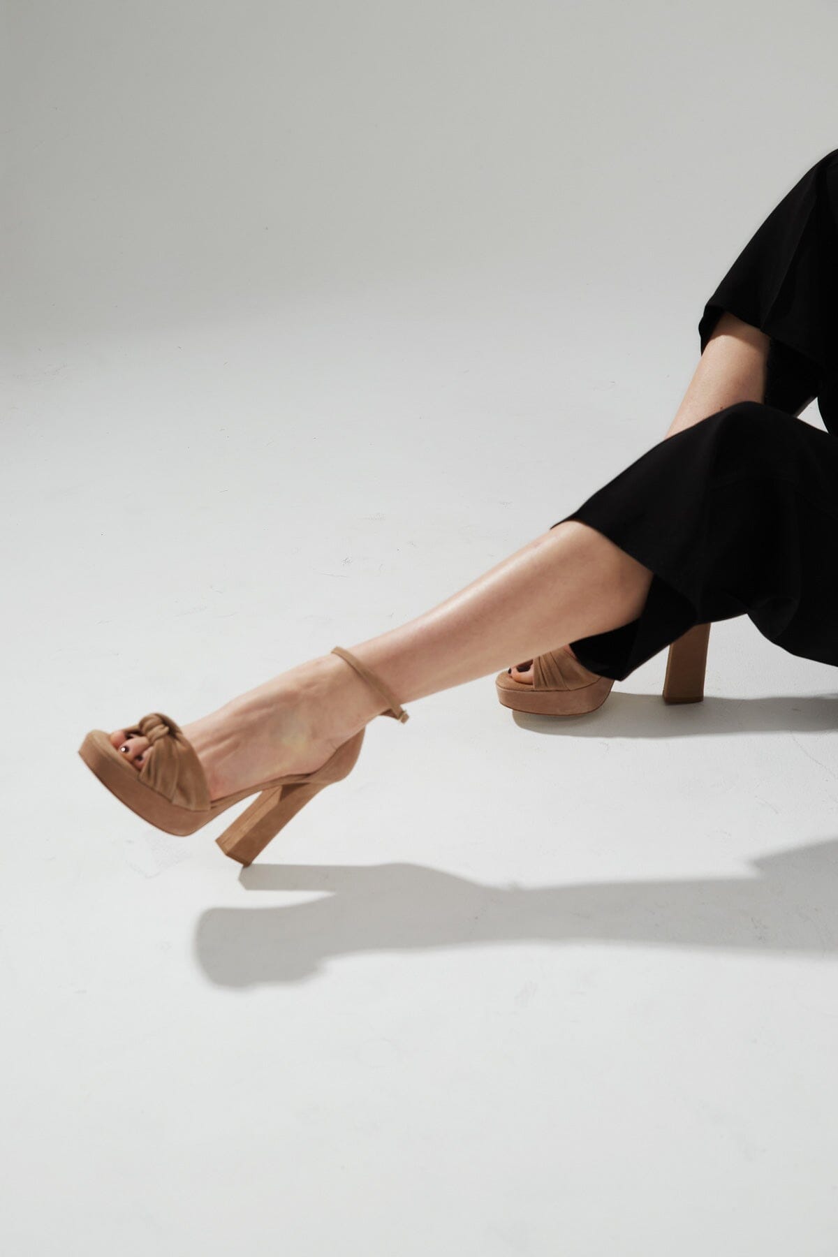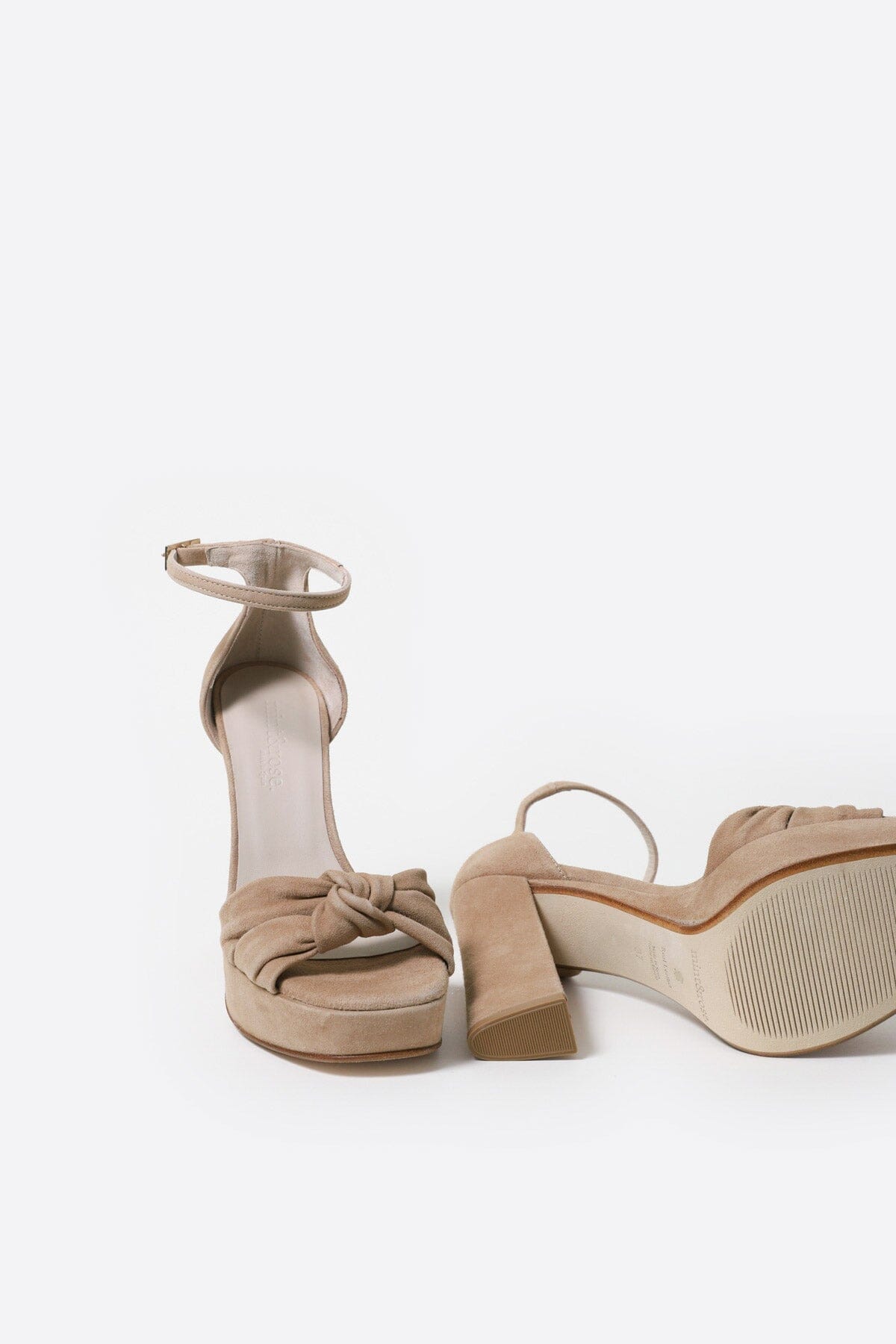 Cloud cushioned insole. The tight heel and knotted front strap ensure perfect support, and the thin ankle strap lengthens the legs. Their heel is 12 cm (including the 3 cm front platform).