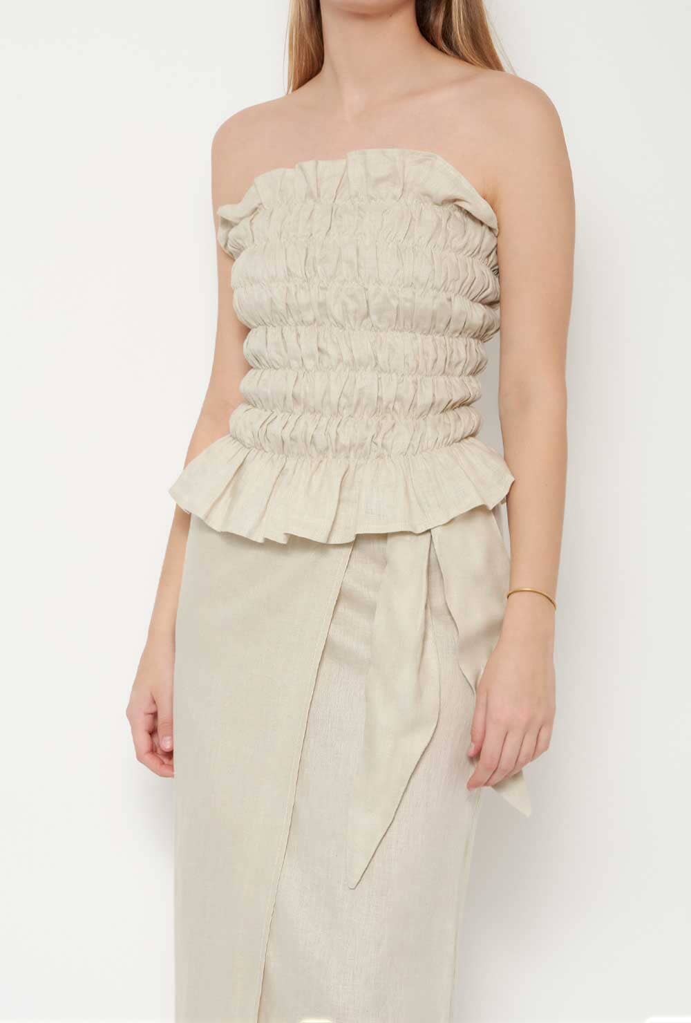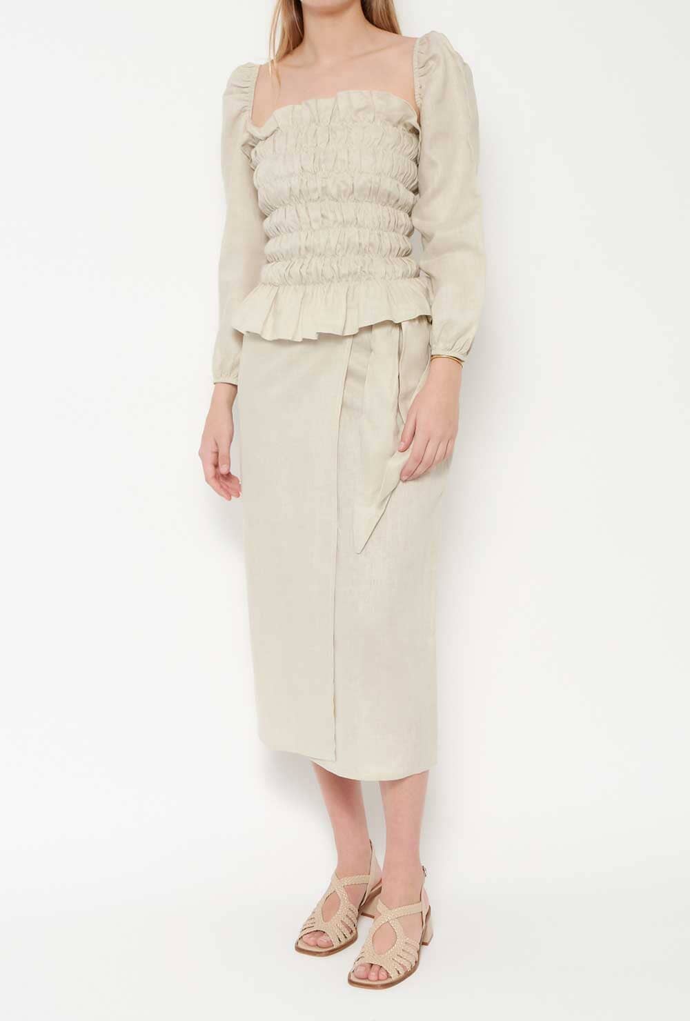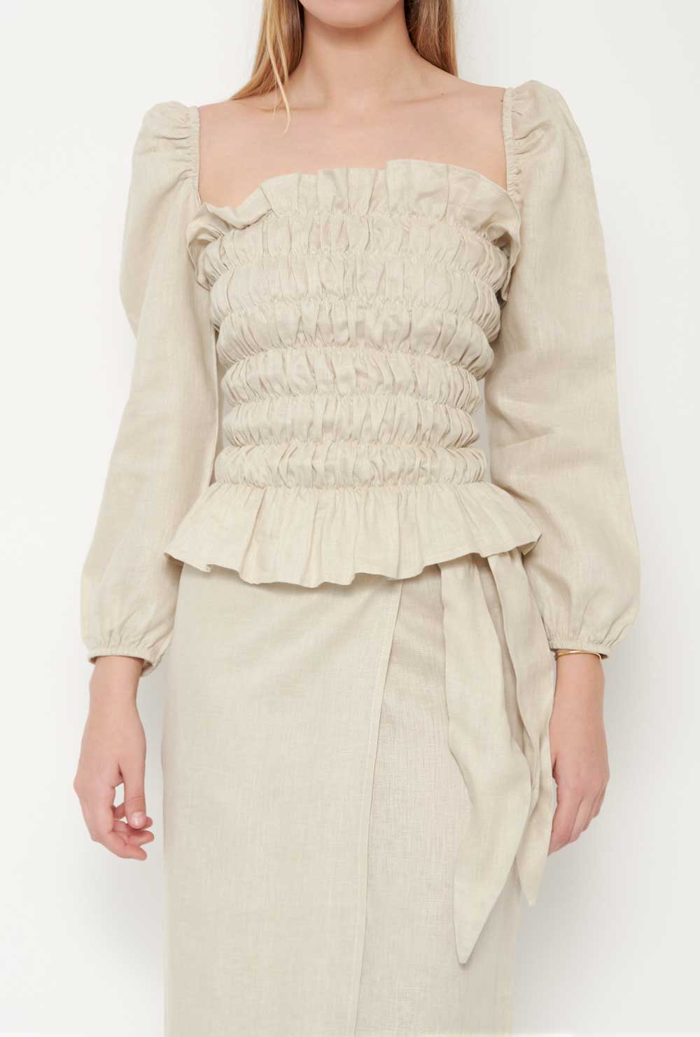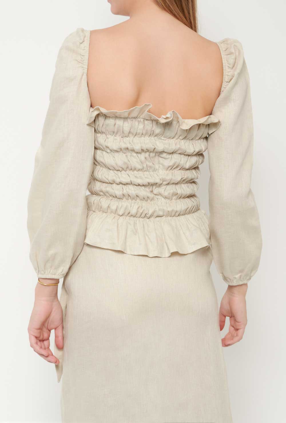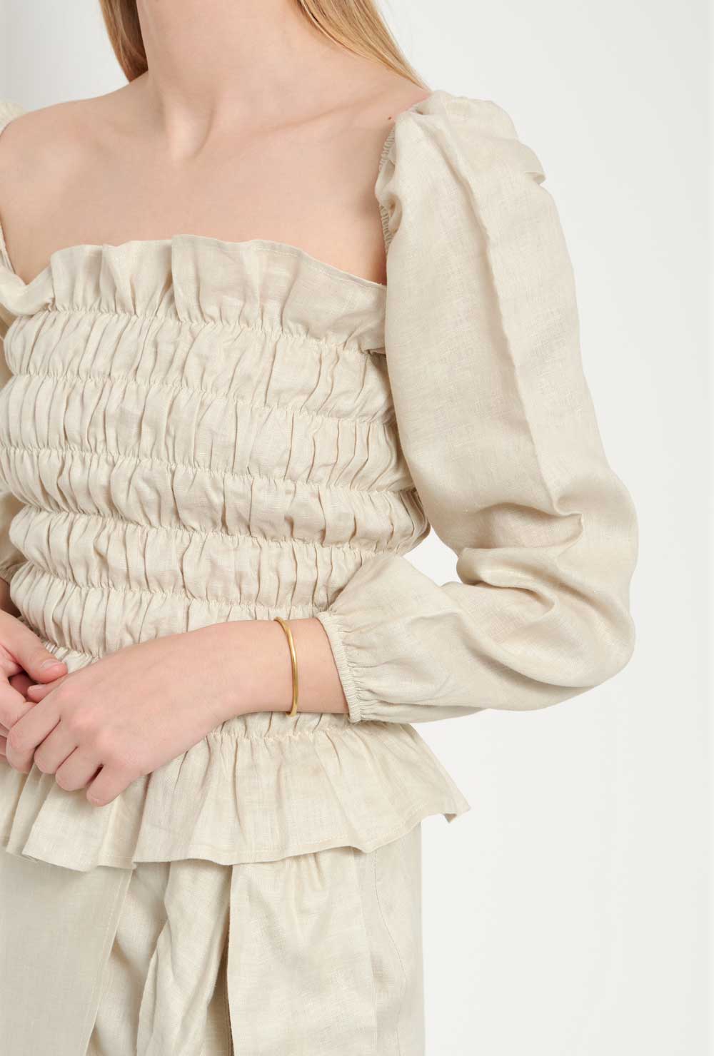 Top de lino fruncido. Las mangas se quitan fácilmente con un botón. Lavar a mano, planchar a baja temperatura, no secar en secadora, no usar lejía. Diseñado por Alava Brand