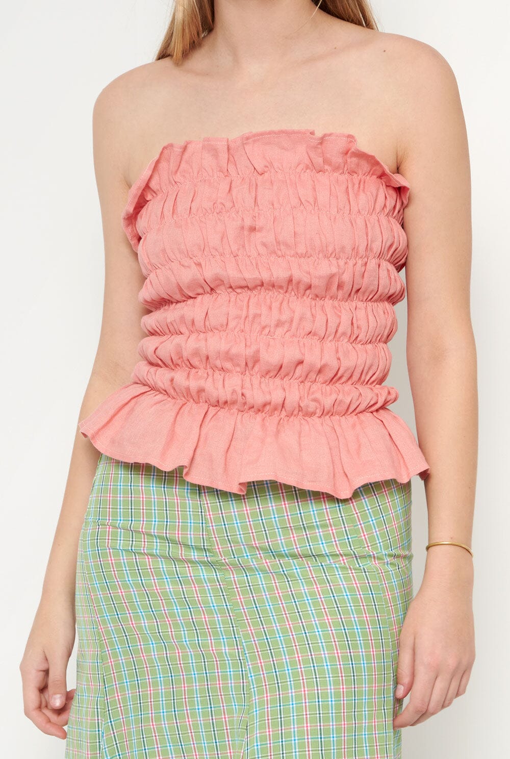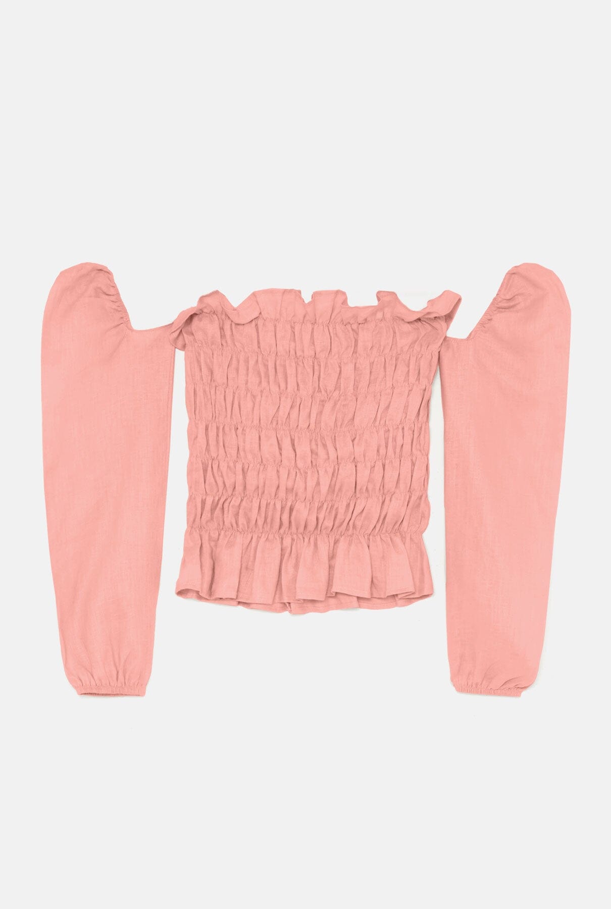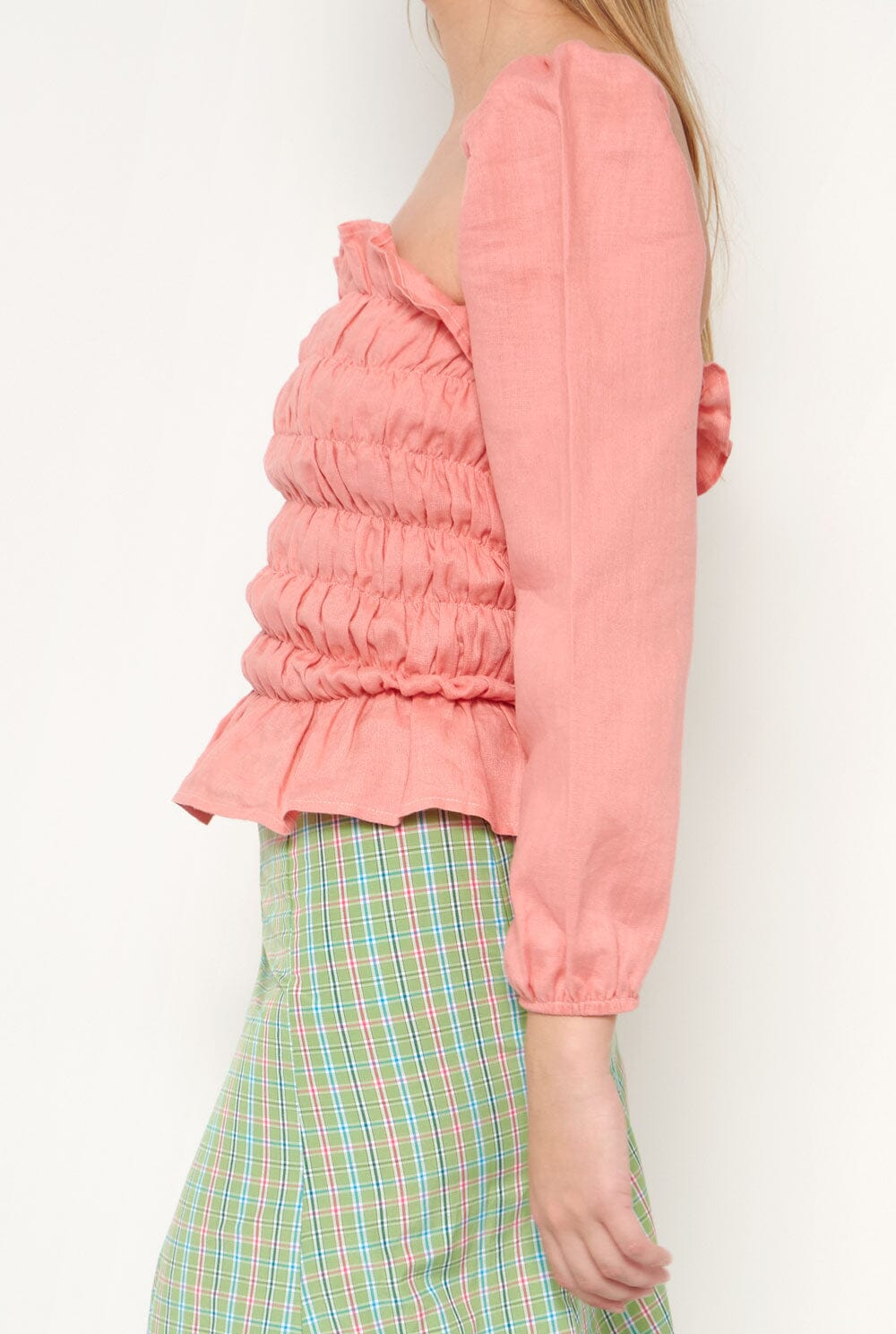 Top de lino fruncido. Las mangas se quitan fácilmente con un botón. Lavar a mano, planchar a baja temperatura, no secar en secadora, no usar lejía. Diseñado por Alava Brand
