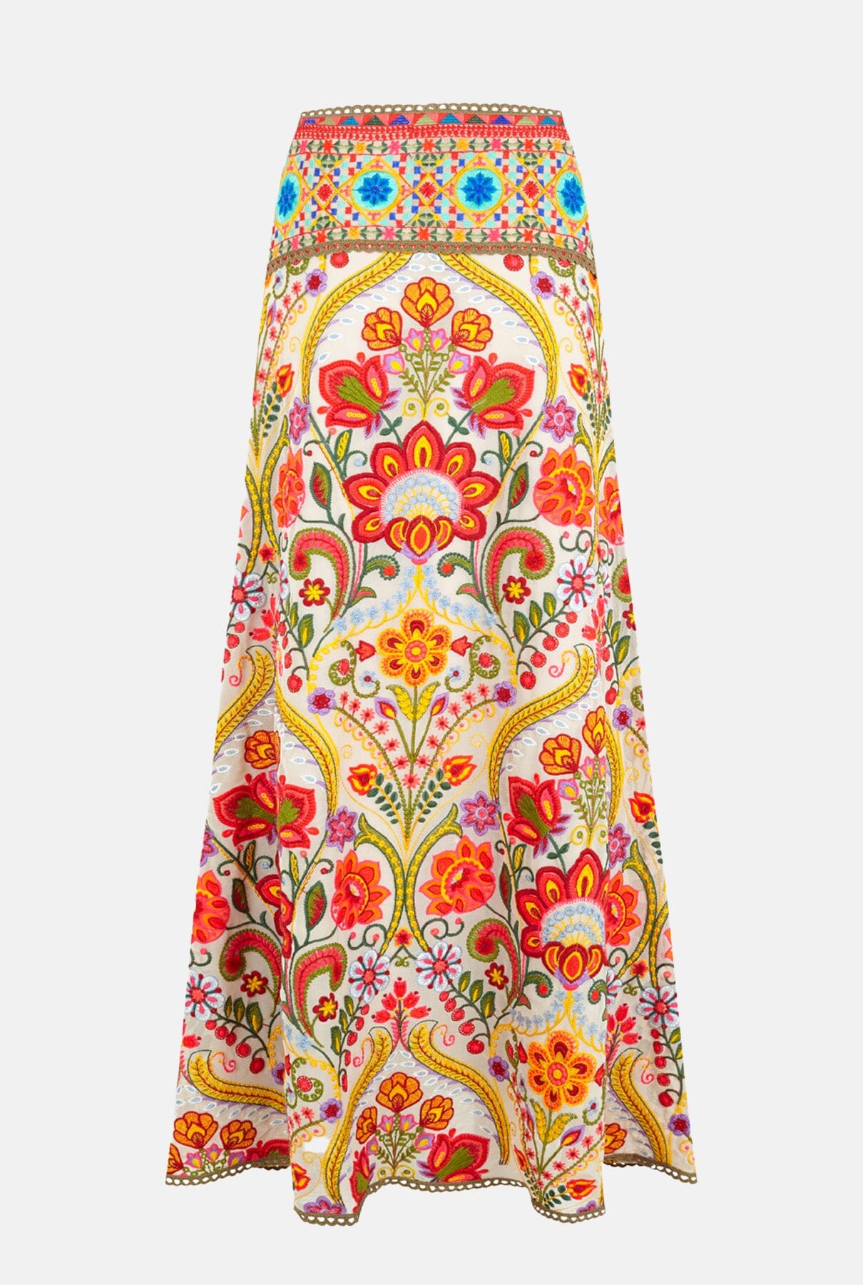 La falda AZALEA está confeccionada en un original georgette bordado con flores con hilos de algodón que te hará sentir especial. Diseño de tiro alto y detalle en cintura. Cierre lateral con cremallera oculta en costura. Detalle de pasamanería a tono. Forrada.