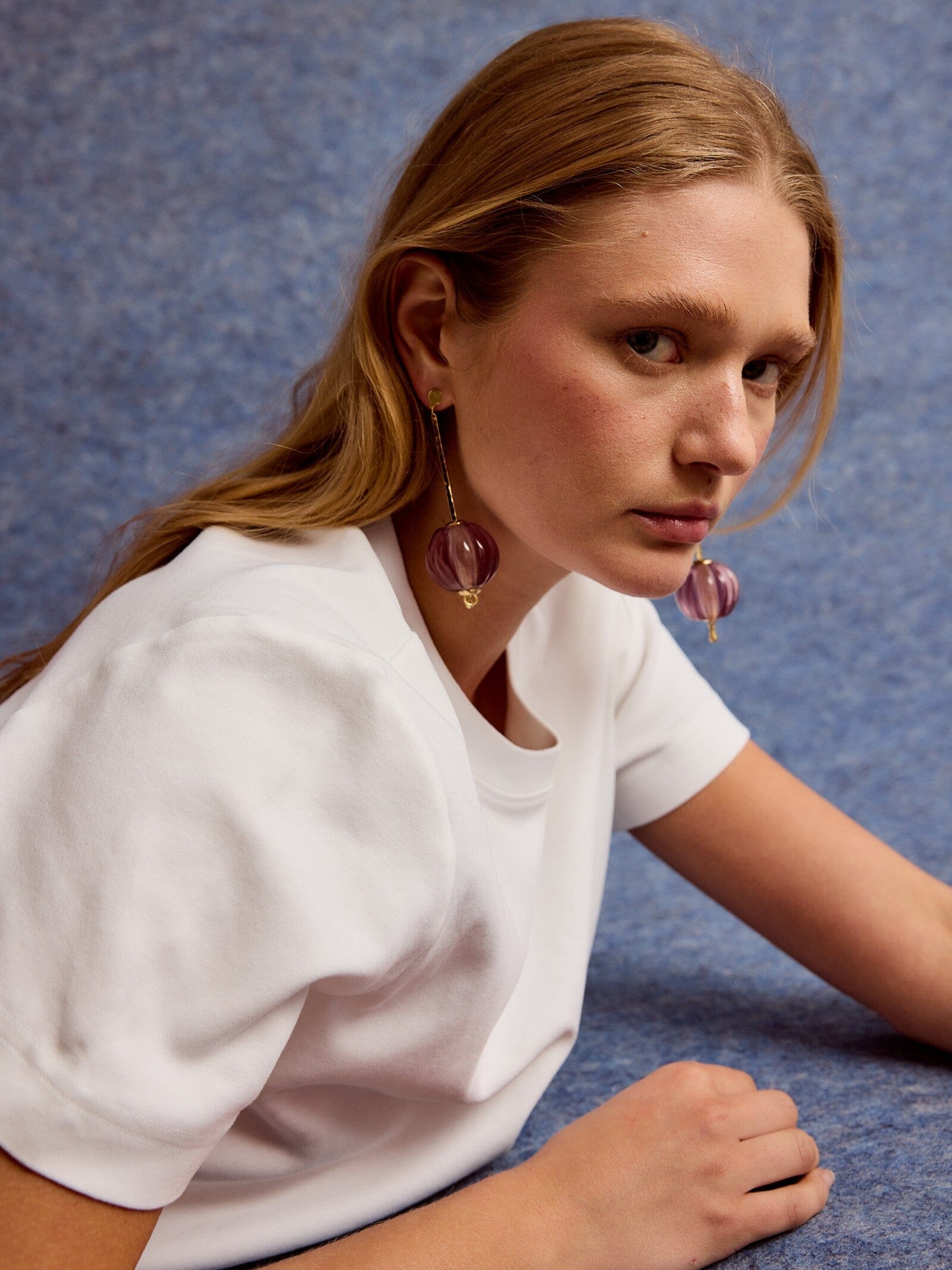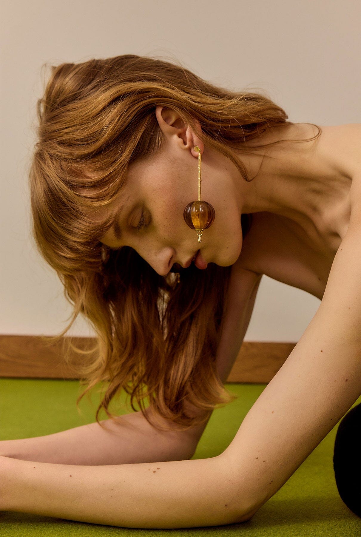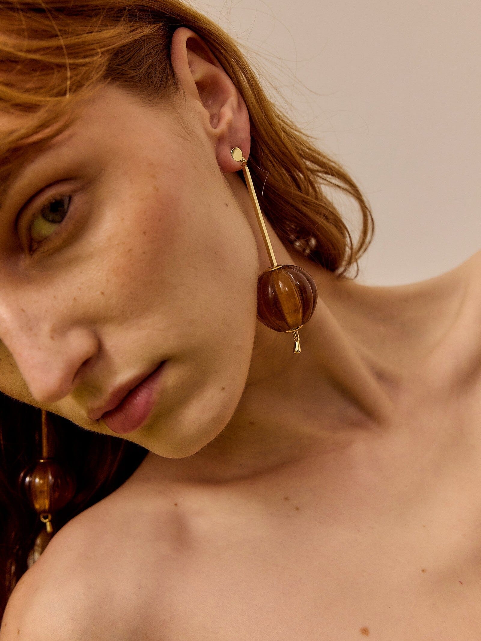 Earrings made with a thin gold plated brass bar and a resin ball at the end. Button type clasp.