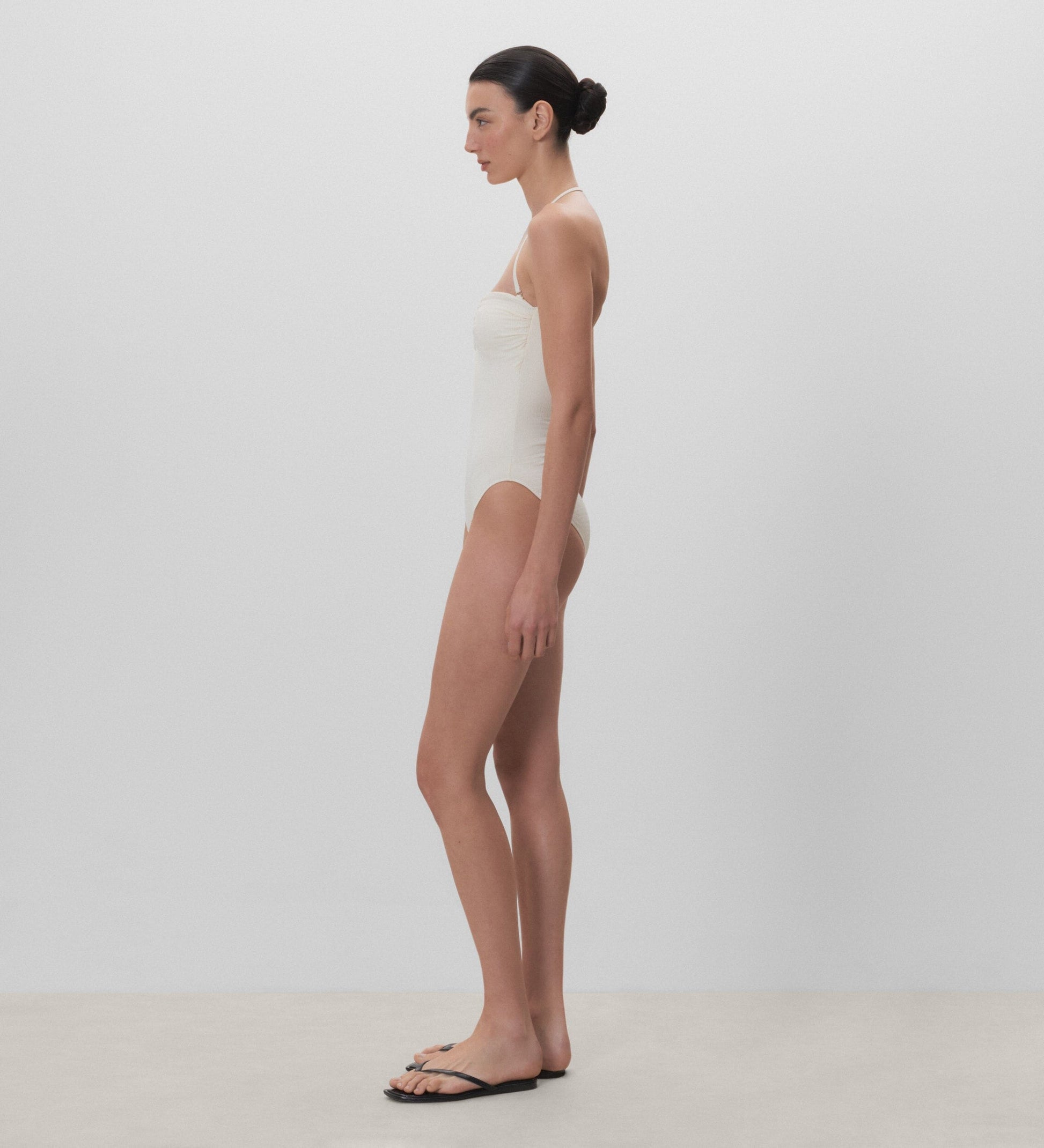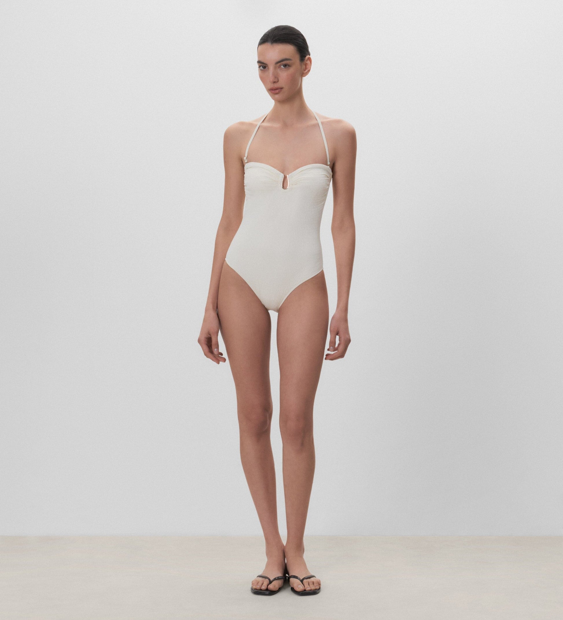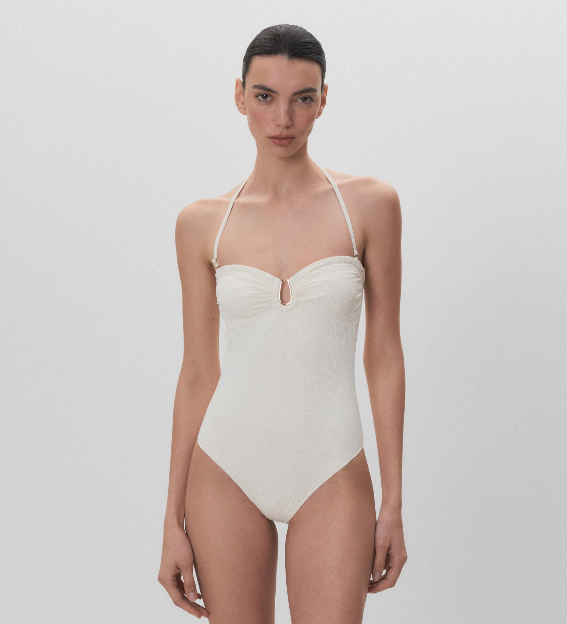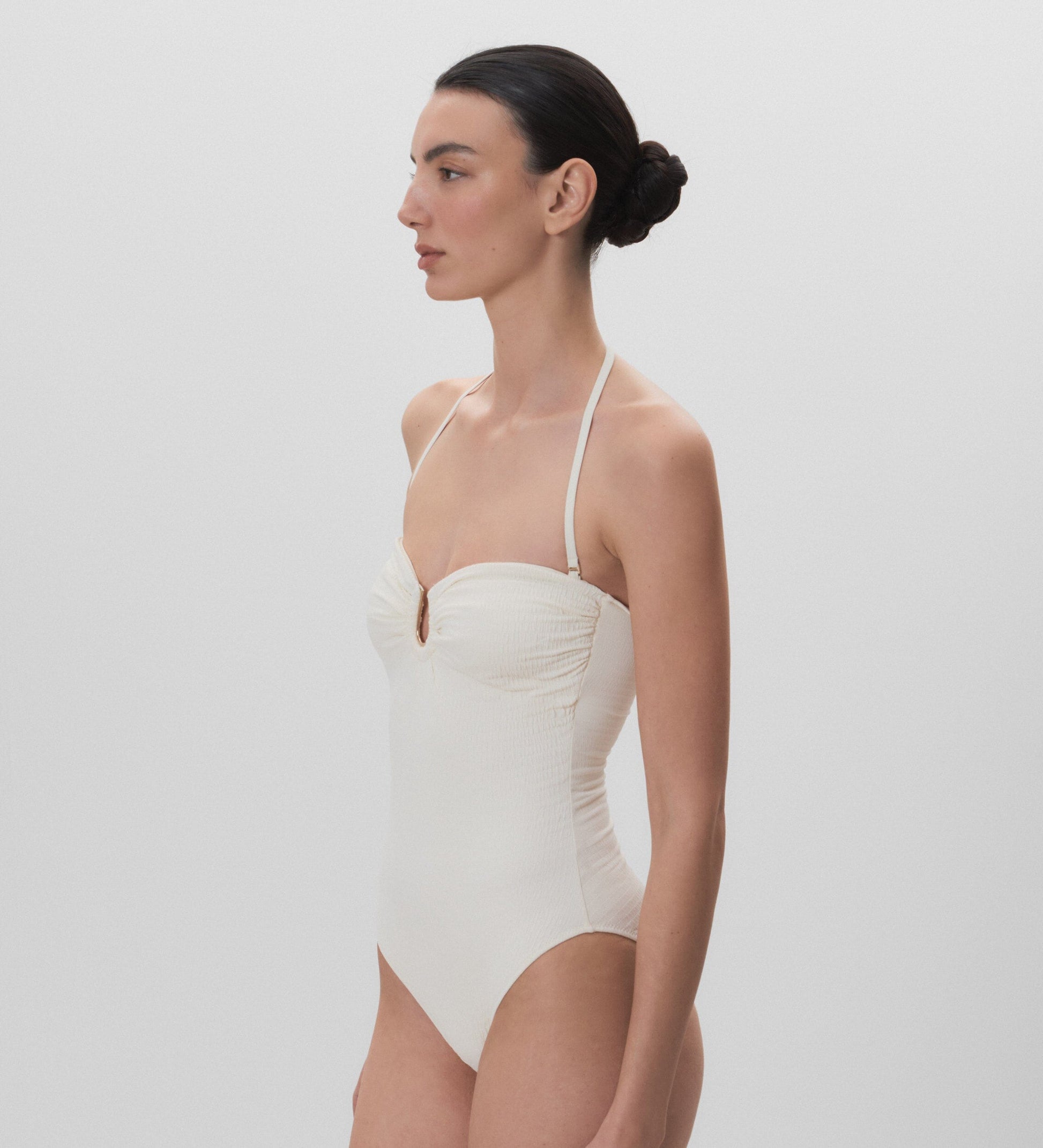 Traje de baño bandeau con tirantes extraíbles. Cuenta con una banda antideslizante en el interior para una mejor sujeción. Las copas están fruncidas y separadas por una hebilla en U con acabado dorado. Licra elástica de color liso con un sutil brillo.