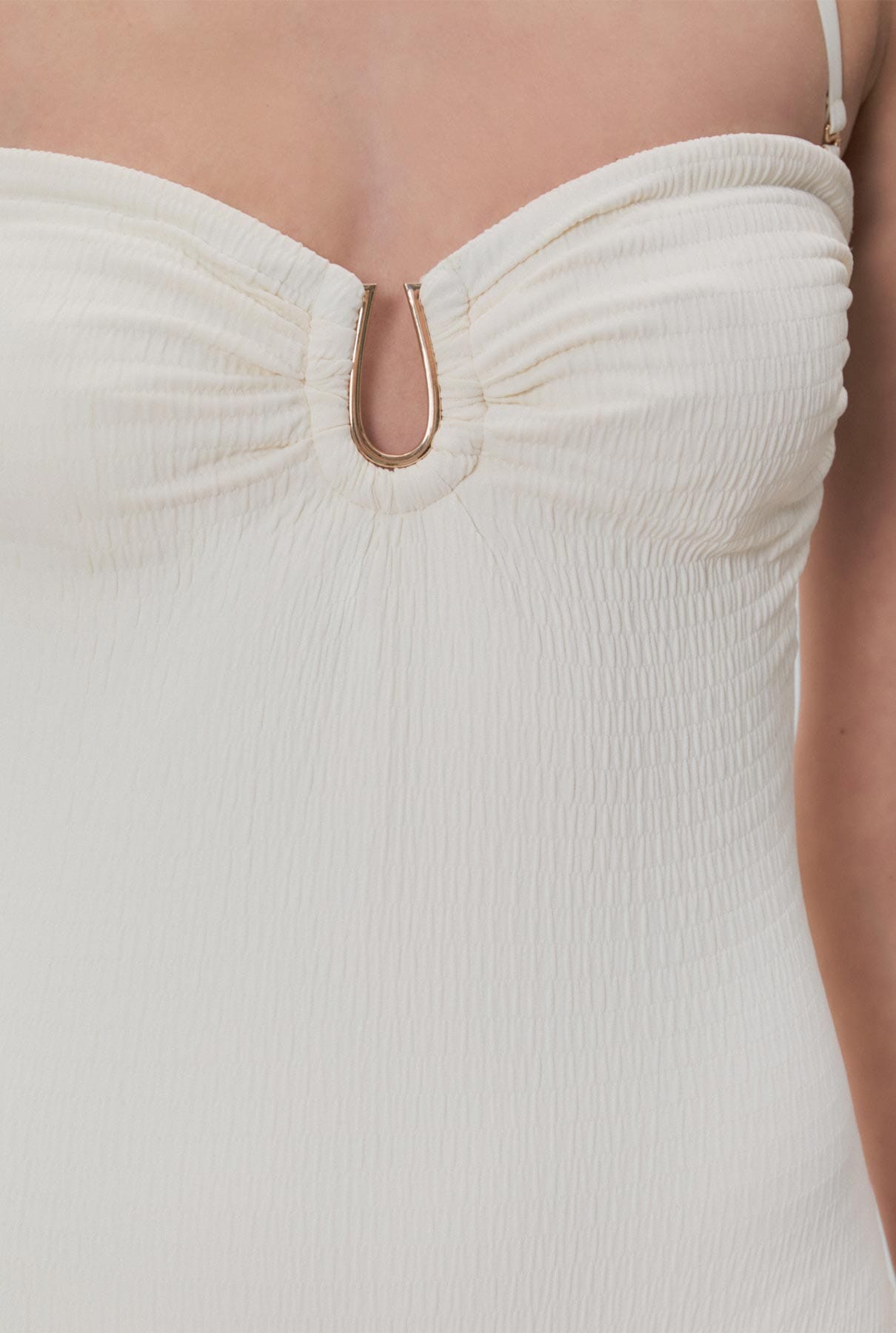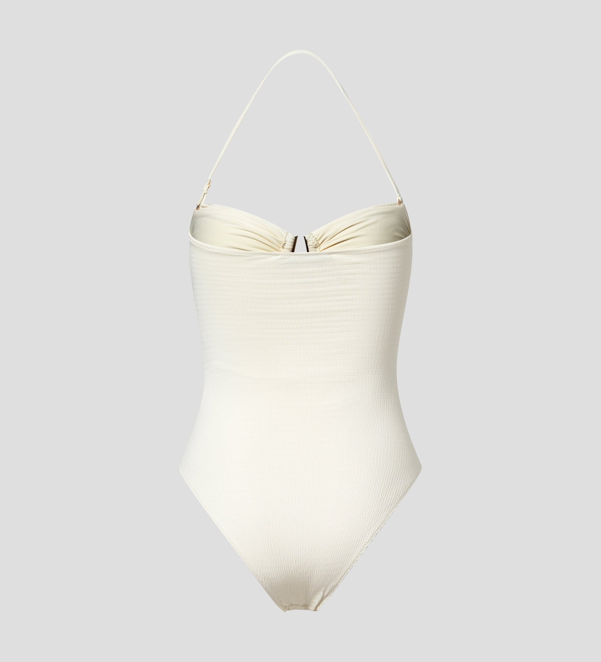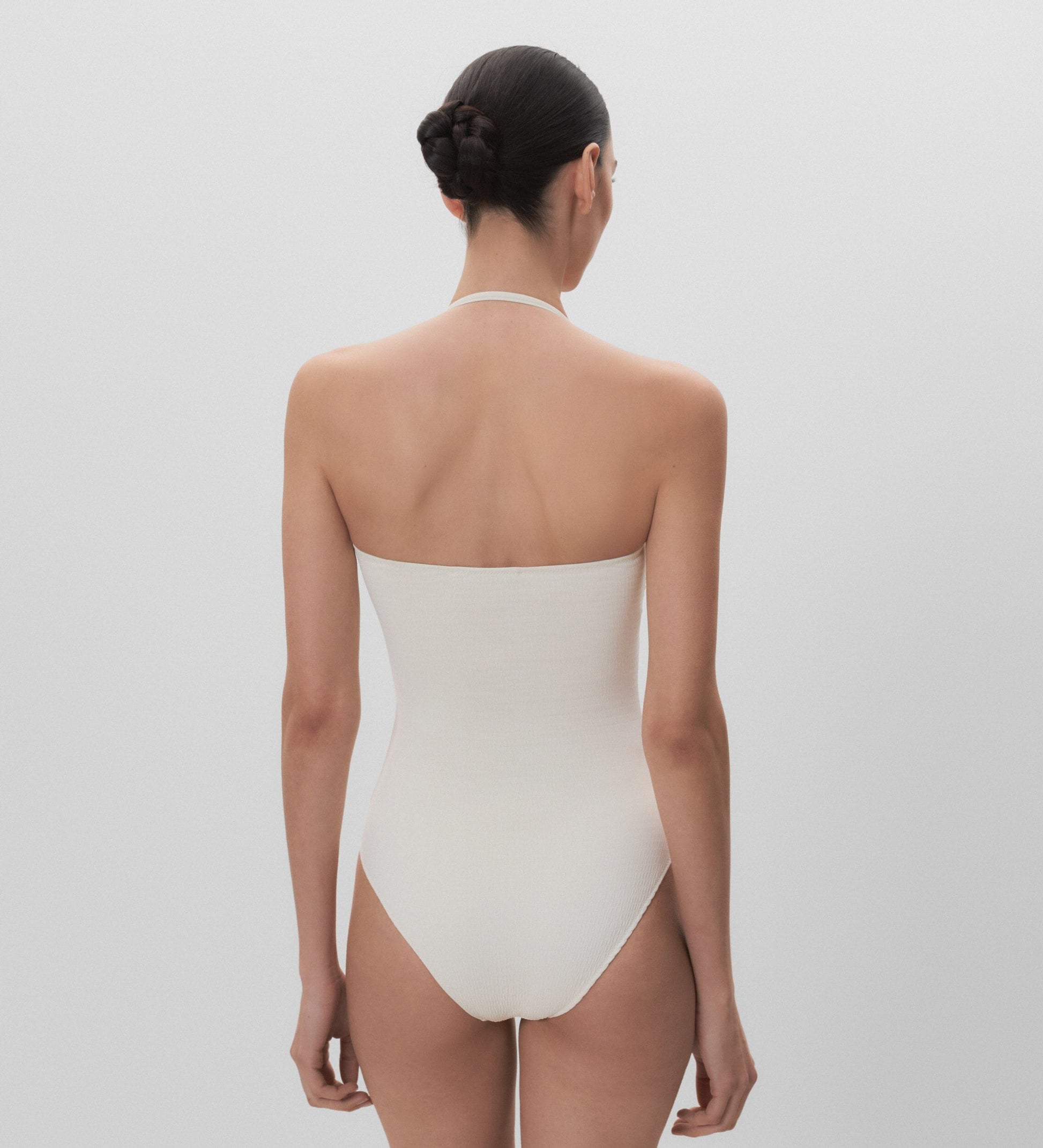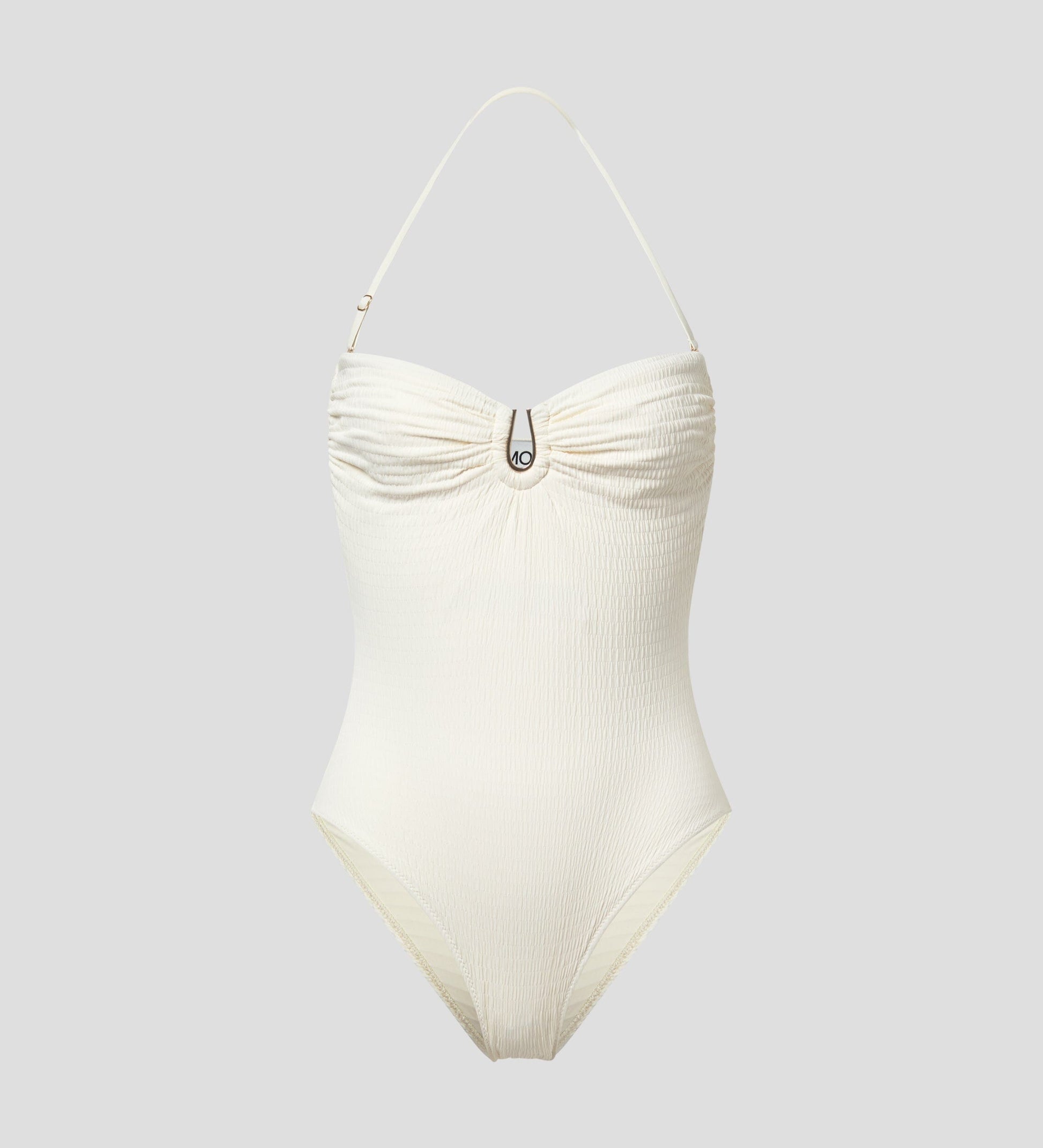 Traje de baño bandeau con tirantes extraíbles. Cuenta con una banda antideslizante en el interior para una mejor sujeción. Las copas están fruncidas y separadas por una hebilla en U con acabado dorado. Licra elástica de color liso con un sutil brillo.