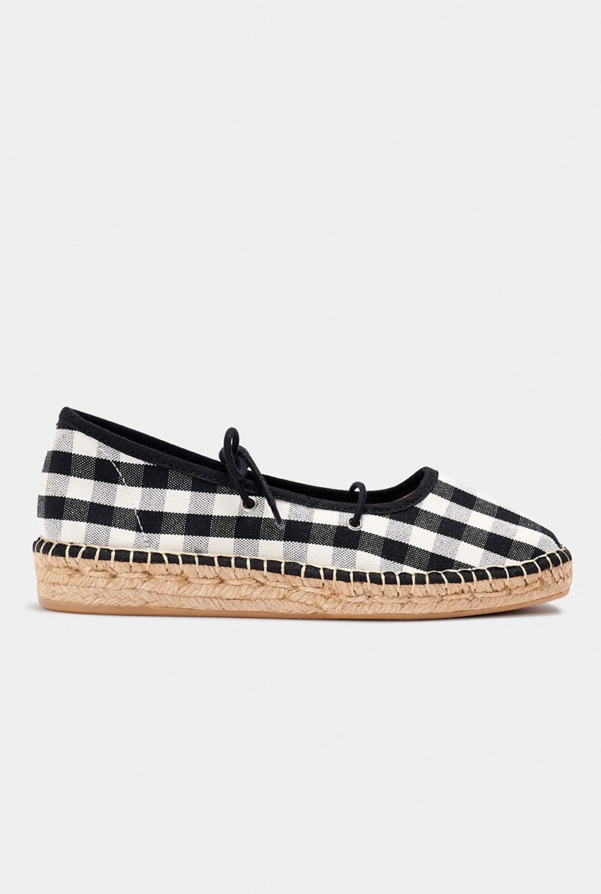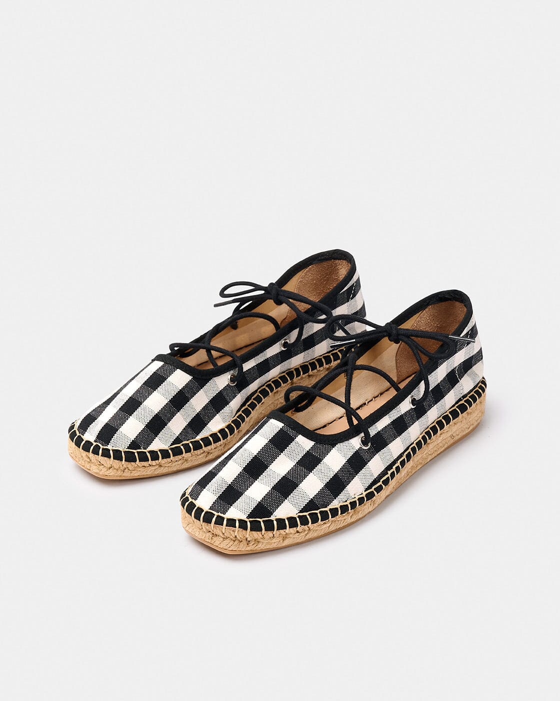 Basella es un zapato cerrado con cordones en el empeine. La parte superior es de tela con forro de algodón. La suela está acolchada con espuma y forrada con piel de vacuno natural para una mejor transpiración del pie. La suela, con puntera cuadrada, está hecha con un sencillo trenzado de yute, una pequeña cuña para mayor comodidad y una suela de goma antideslizante. La altura total es de 3 cm.