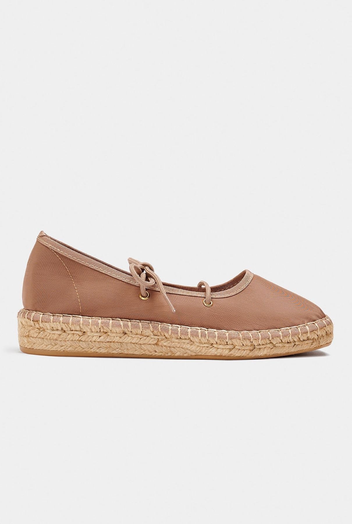 Basella es un zapato cerrado con cordones en el empeine. La parte superior es de tela con forro de algodón. La suela está acolchada con espuma y forrada con piel de vacuno natural para una mejor transpiración del pie. La suela, de punta cuadrada, está hecha con un sencillo trenzado de yute, una pequeña cuña para mayor comodidad y una suela de goma antideslizante. La altura total es de 3 cm.