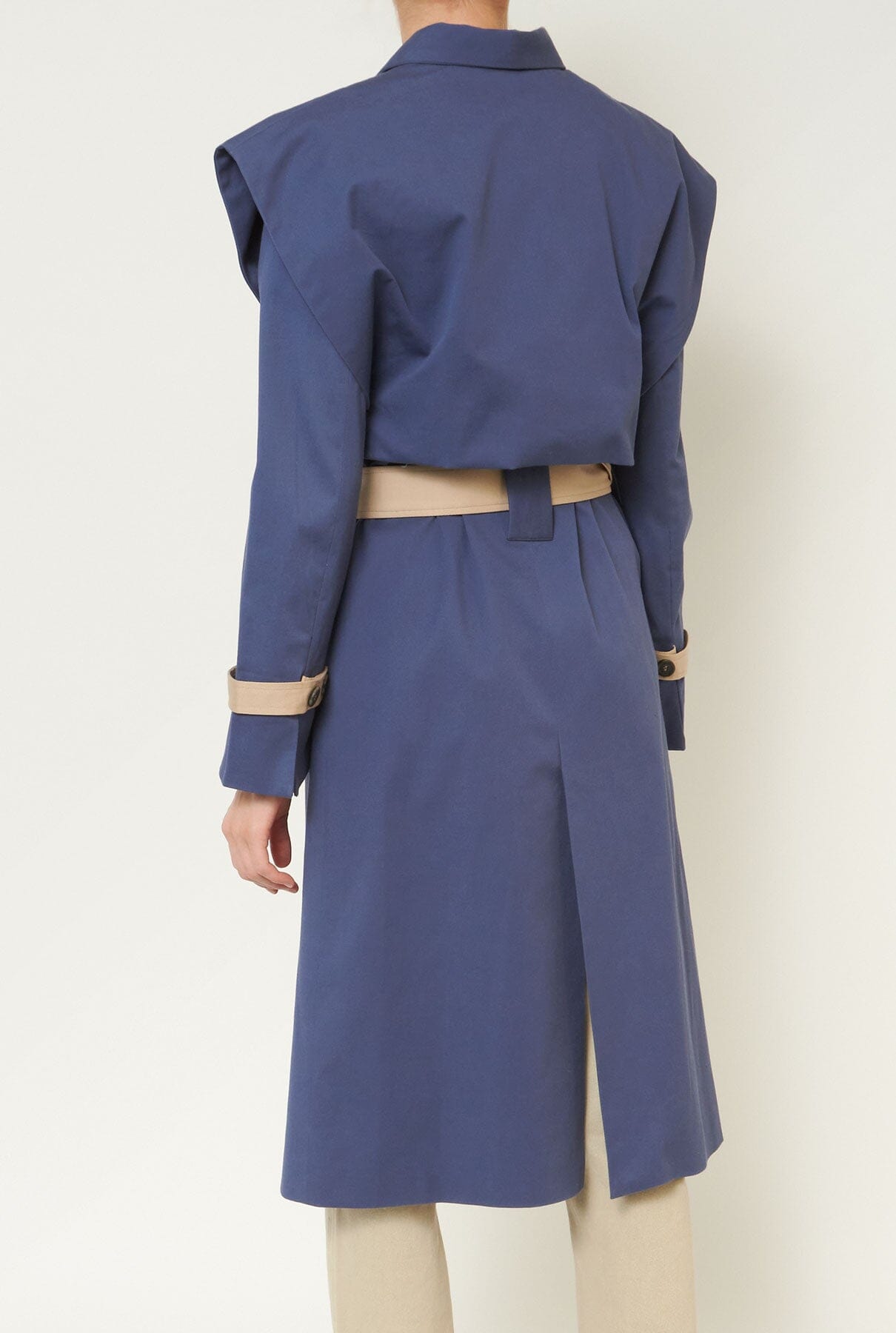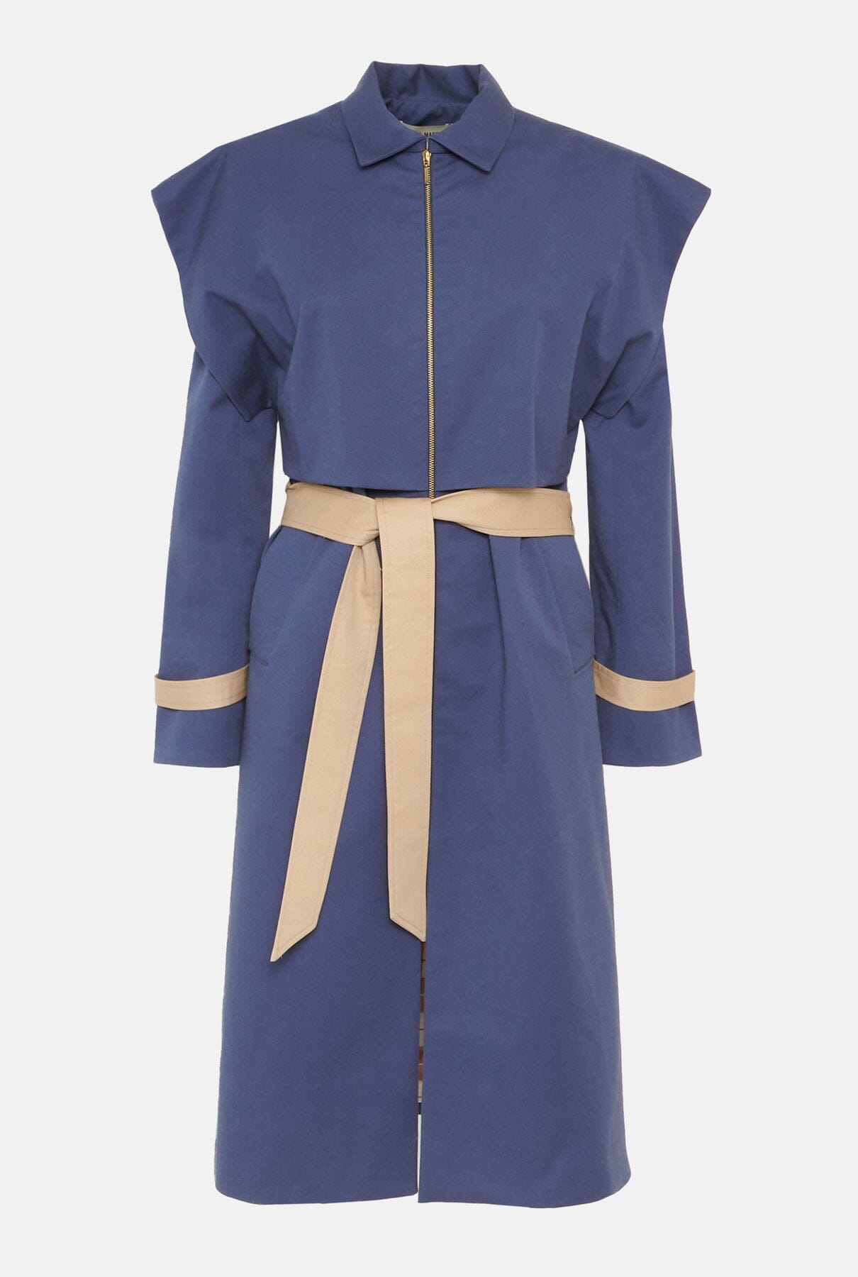 Gabardina impermeable confeccionada en algodón y elastano. El cuello se puede llevar como cuello alto o con solapa. Bolsillos delanteros. Trabilla para cinturón y trabillas en puños en color contraste. Cierre frontal con cremallera dorada vista. Forro en tejido de algodón con estampado de cuadros combinados.