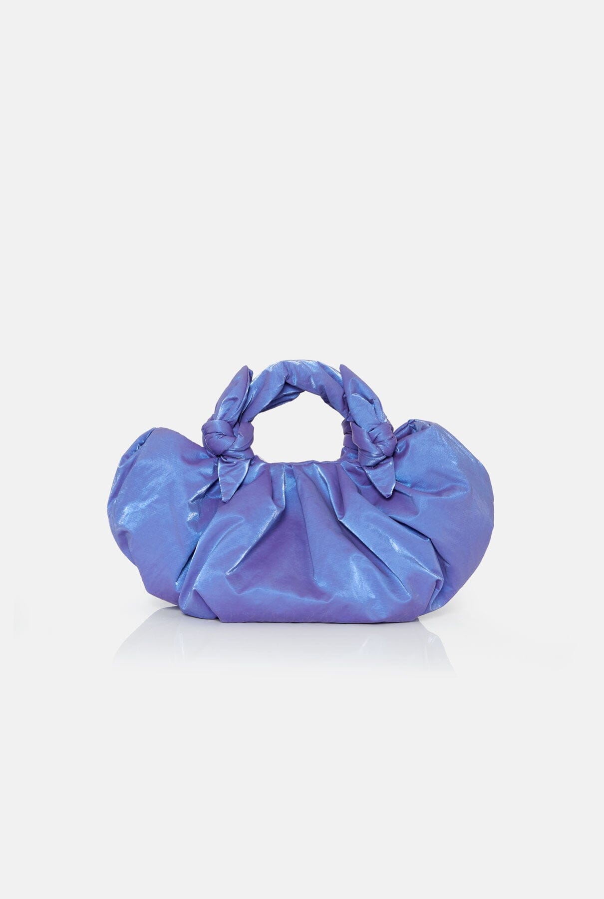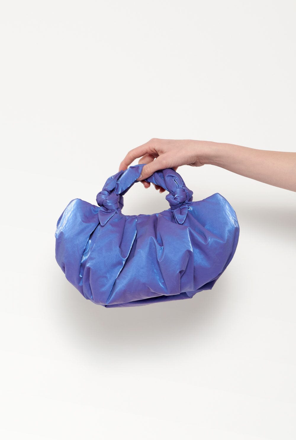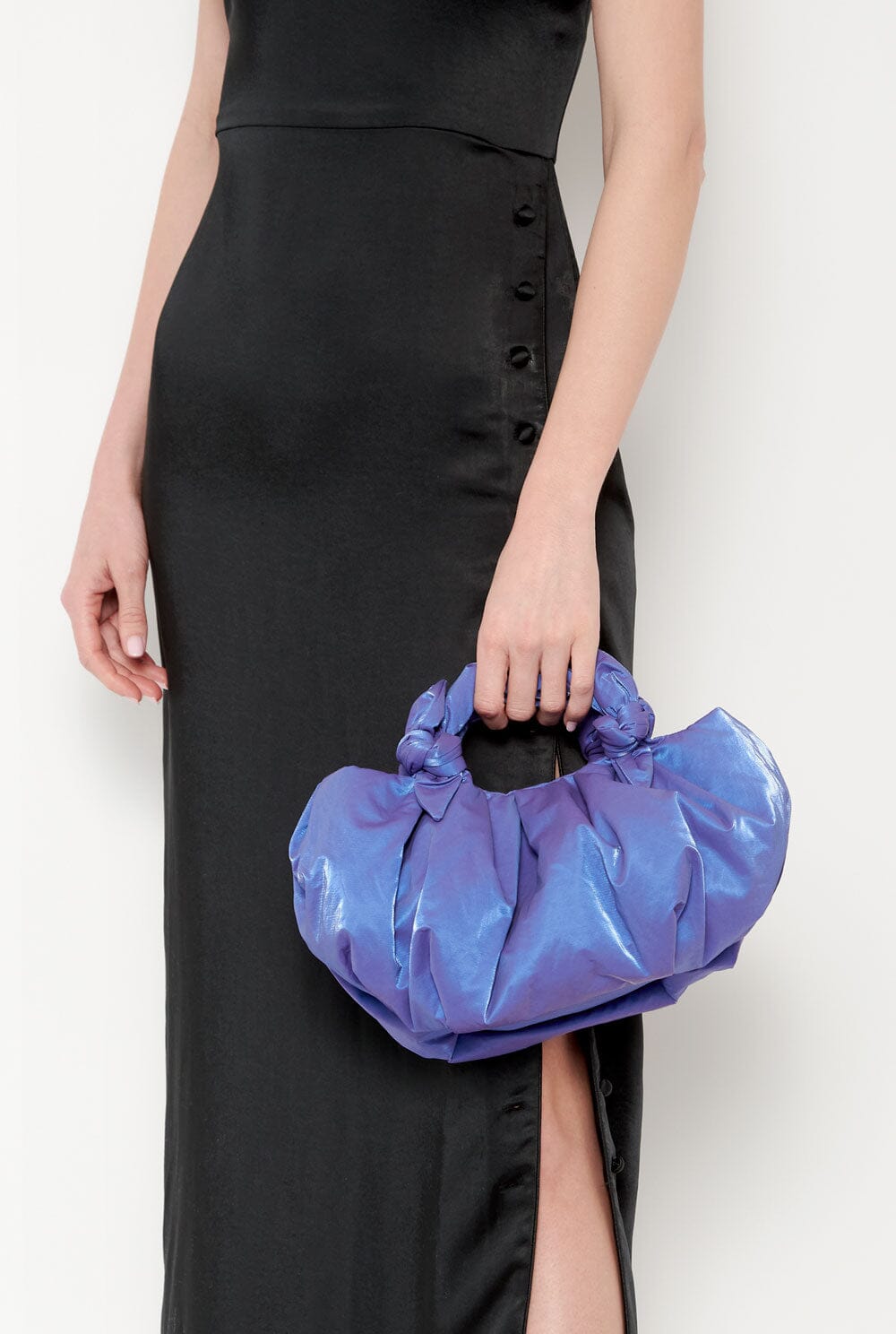 El bolso Bernatta está confeccionado en tejido lustroso y brillante. Es una pochette suave con asas anudadas y cierre de botón.