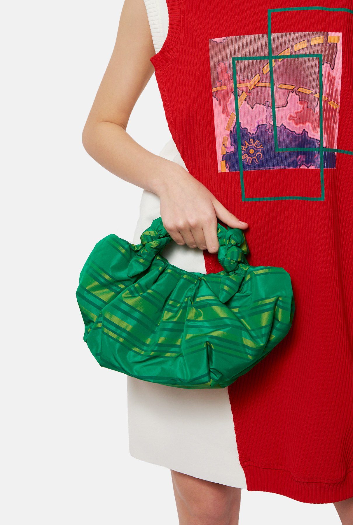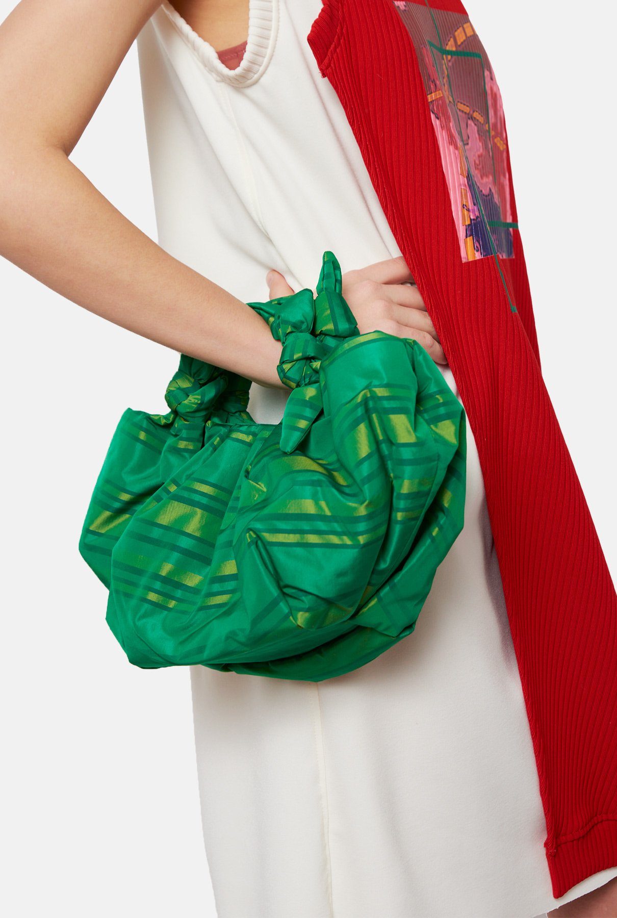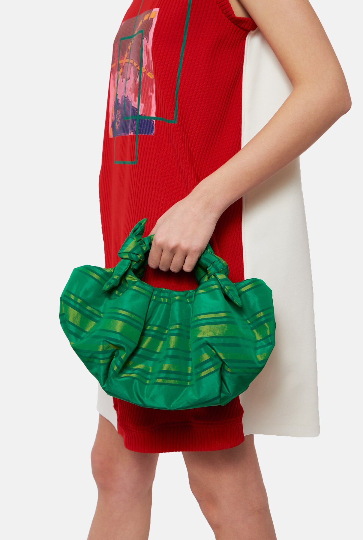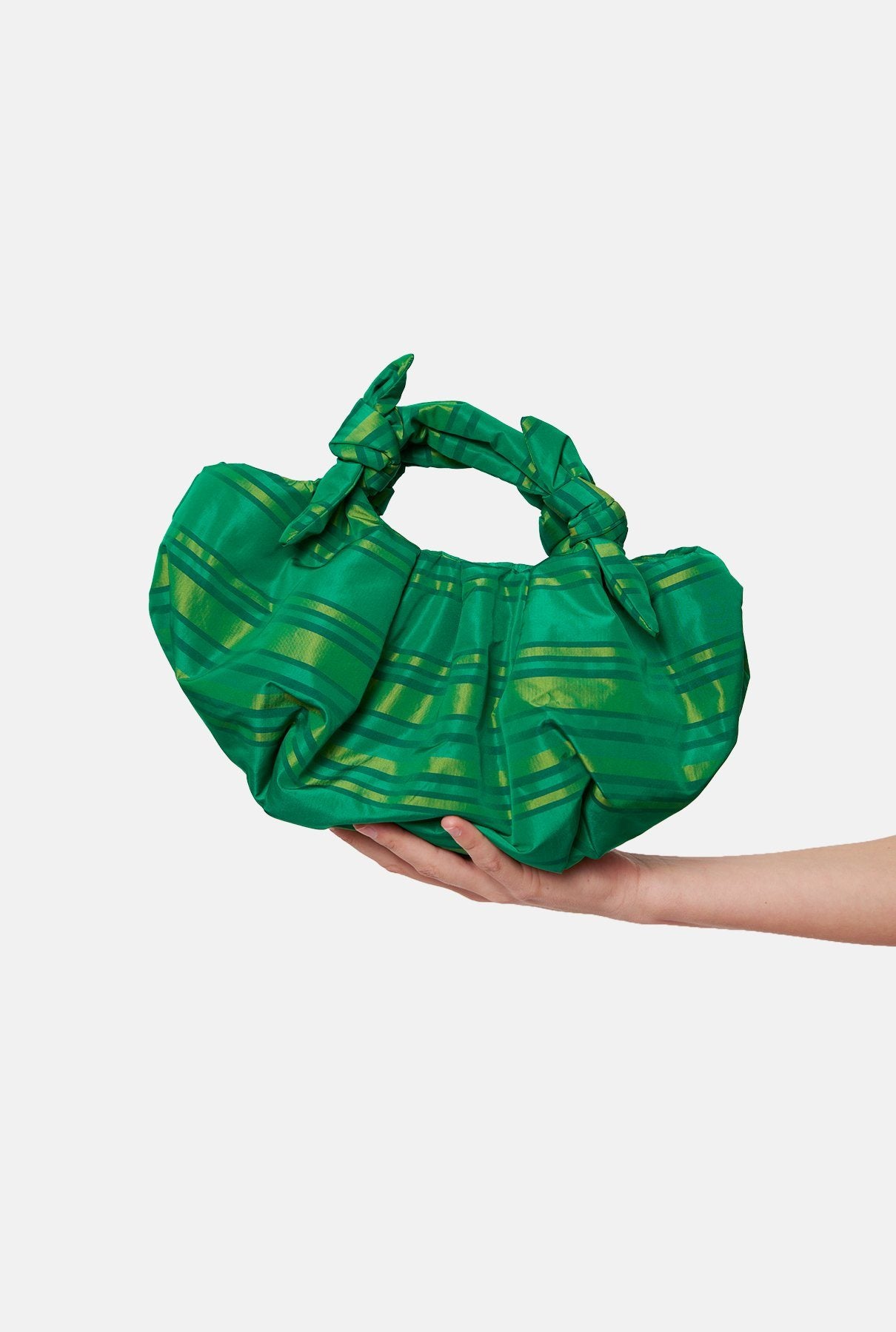 El bolso Bernatta está confeccionado con estampado de rayas bordado con efecto satén de seda. Es un pochette suave con asas anudadas y cierre de botón. Este bolso está fabricado en España con tejidos del icónico proveedor de tejidos de Barcelona: Gratacós. Diseñado por Laia Alen