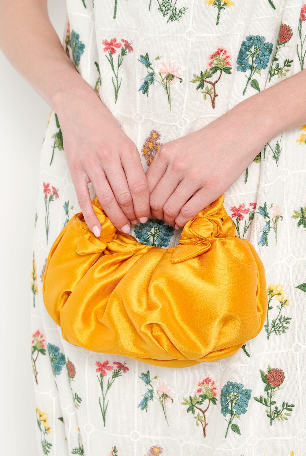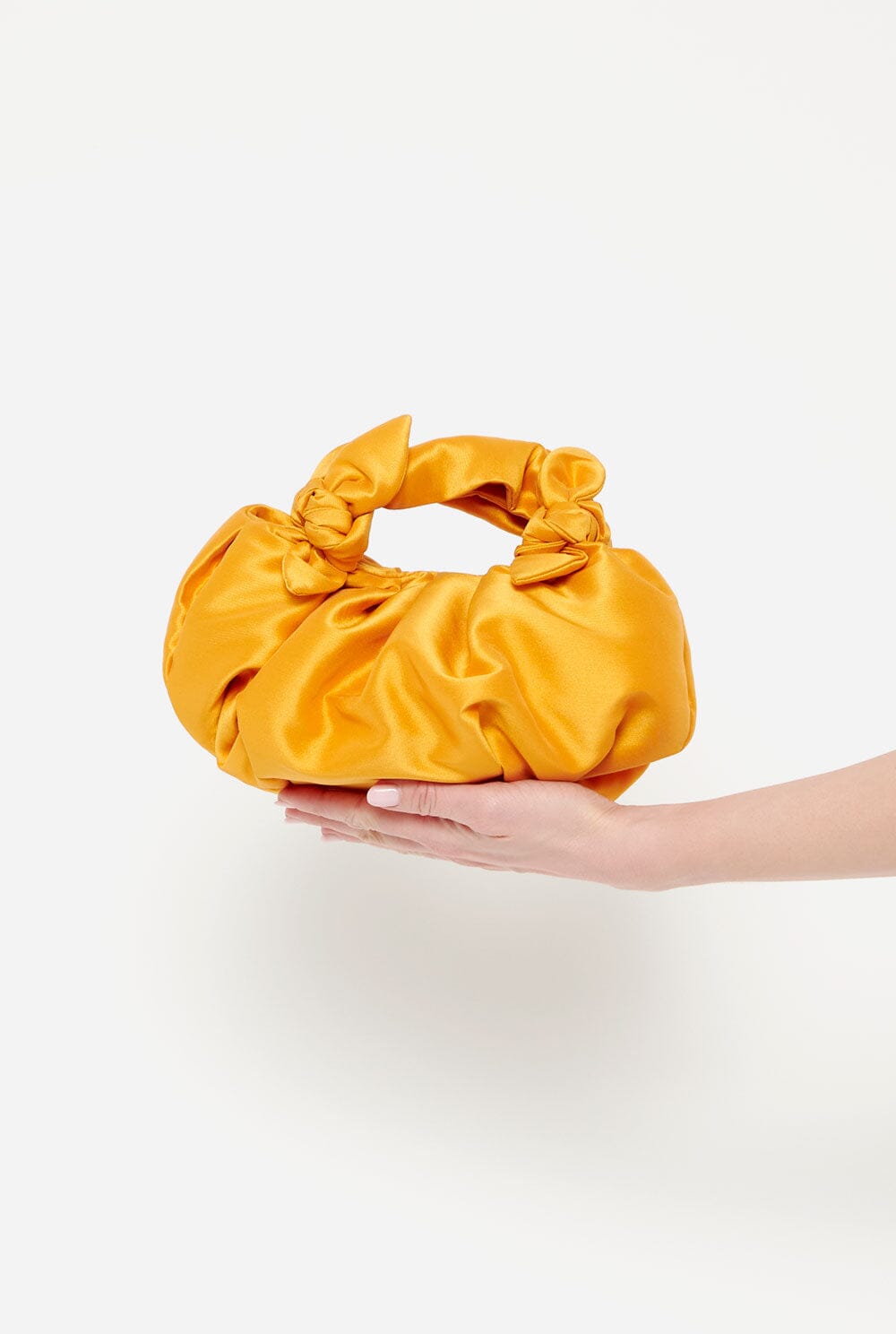 El bolso Bernatta Banana Yellow está confeccionado en satén de seda lustroso y suave. Es un bolso de mano suave con asas anudadas y cierre de botón. Este bolso está fabricado en España con telas de un proveedor de telas español icónico.