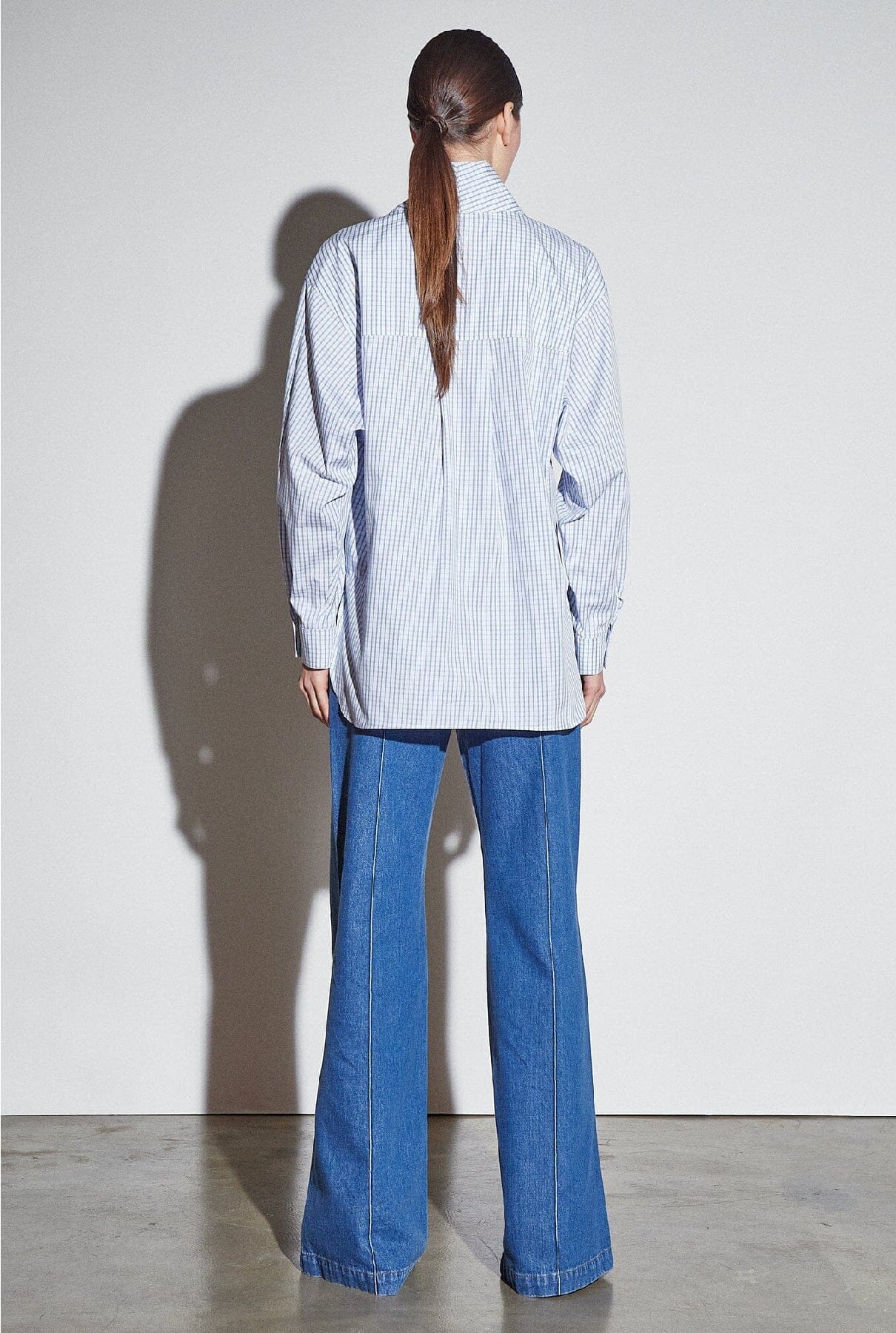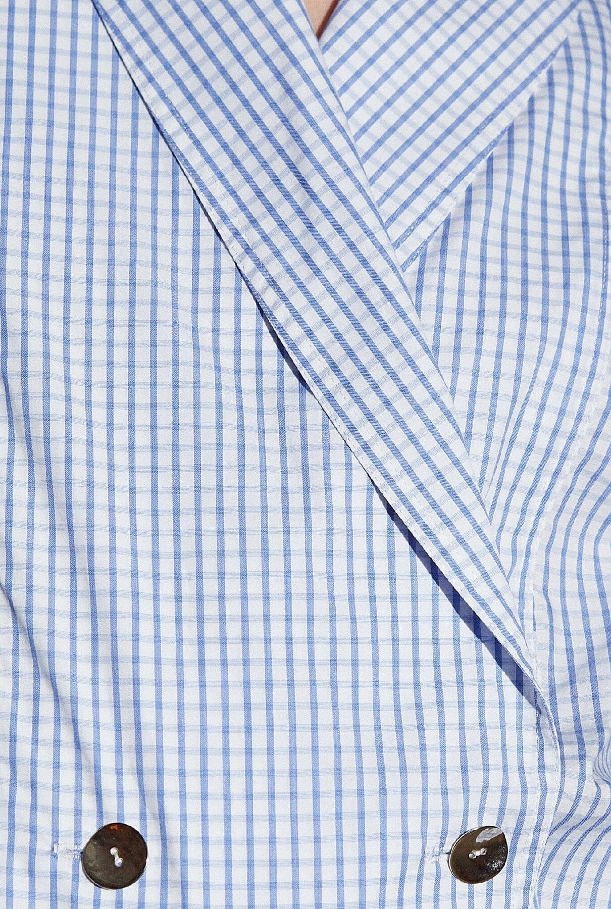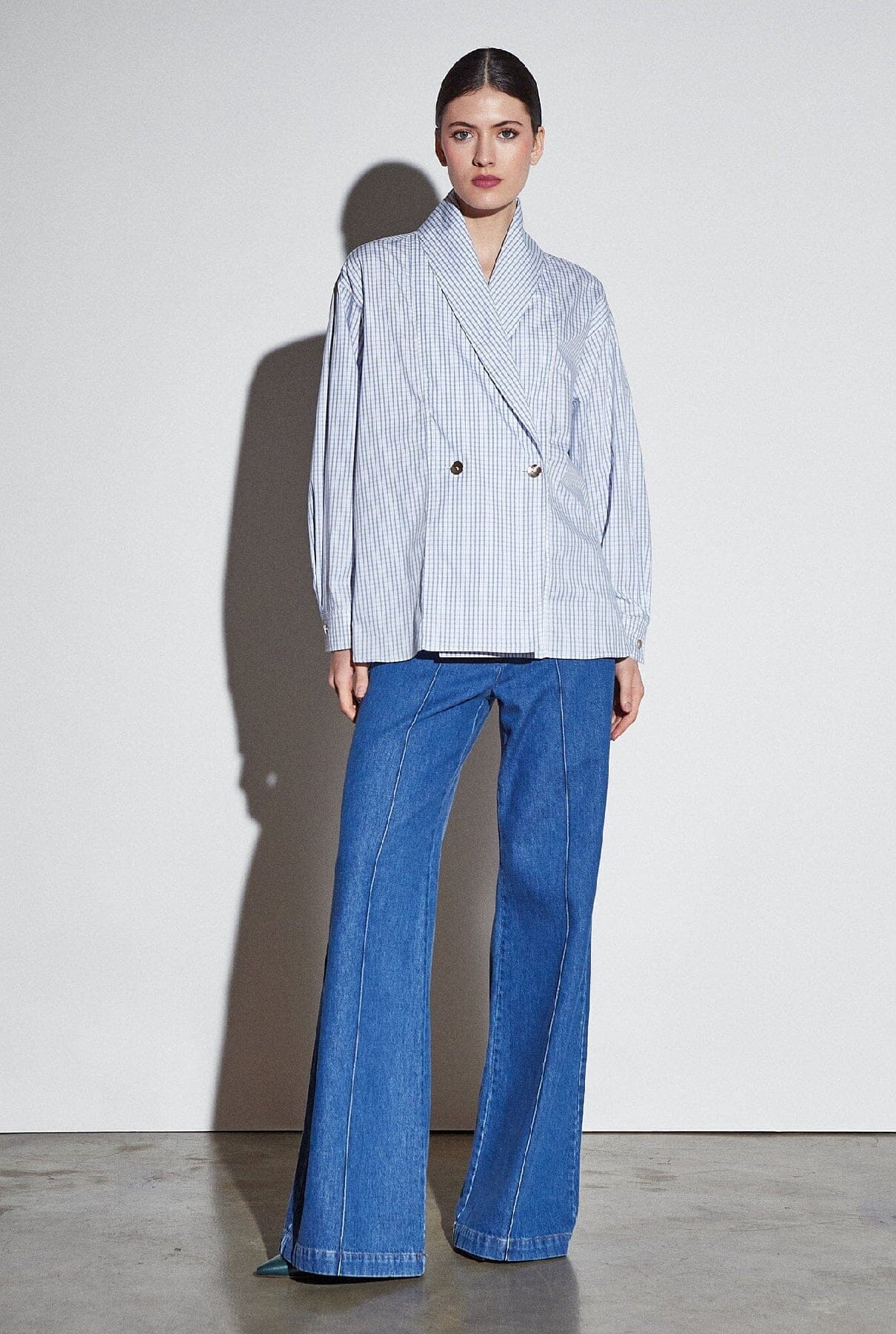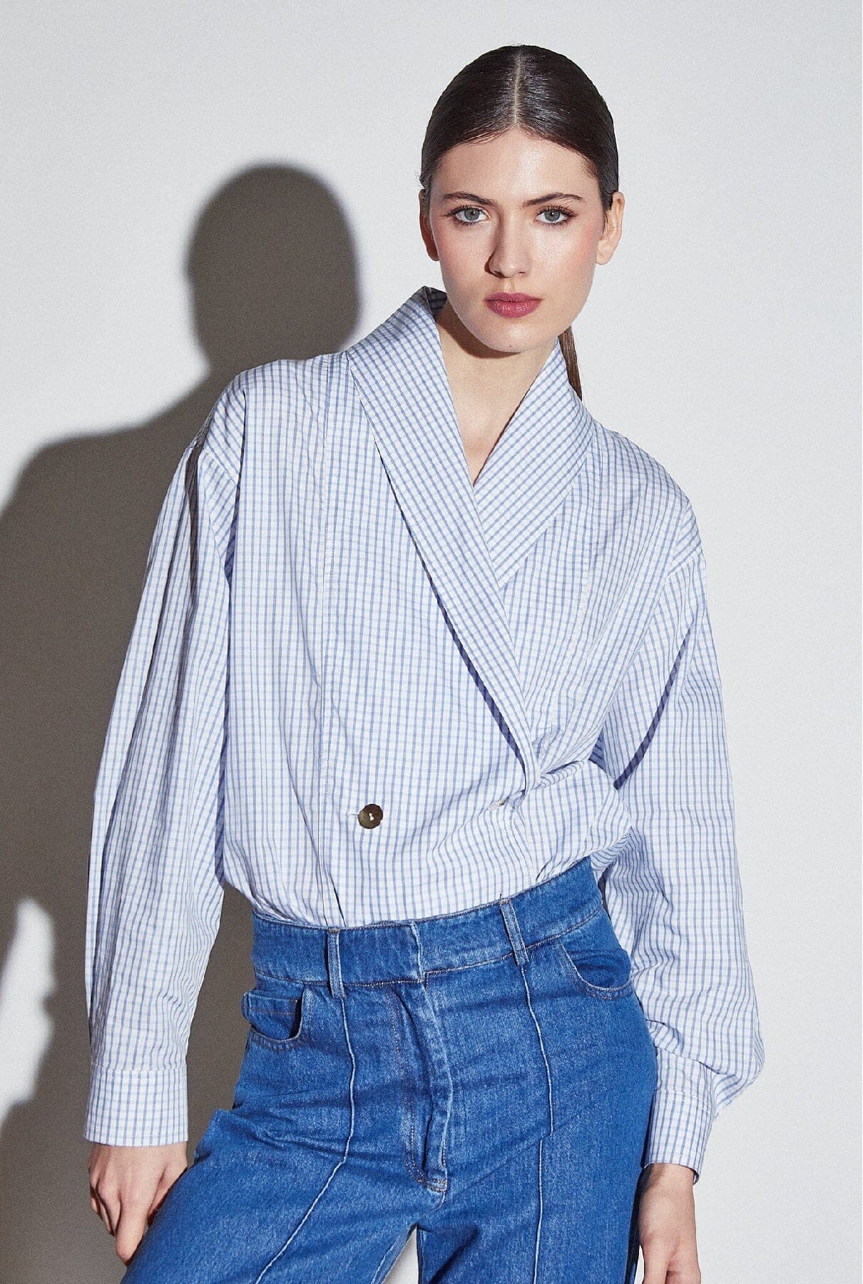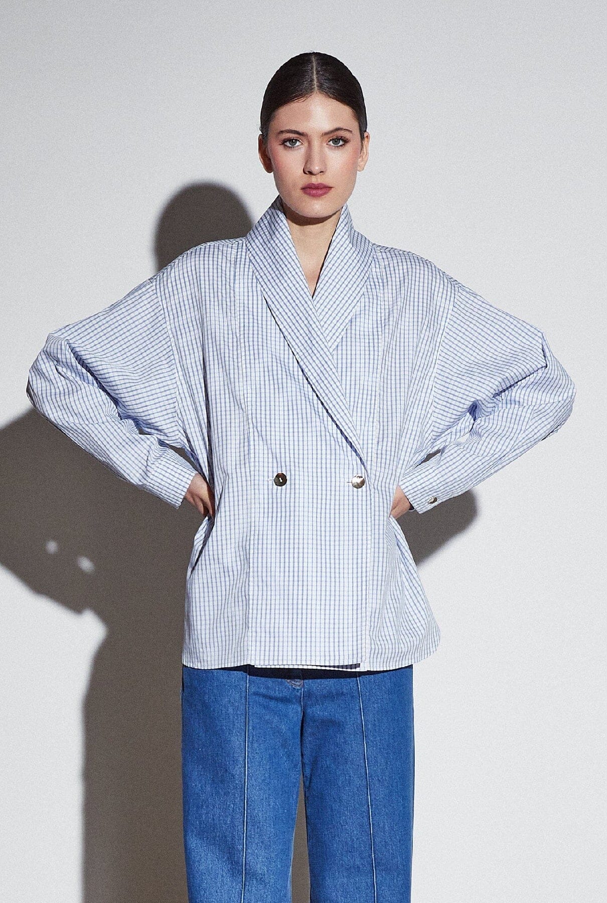 Realza tu estilo con esta sofisticada camisa de cuadros celeste con un refinado patrón entallado. El diseño cruzado con dos botones dorados le aporta un toque único a esta camisa, dándole un aire de elegancia.