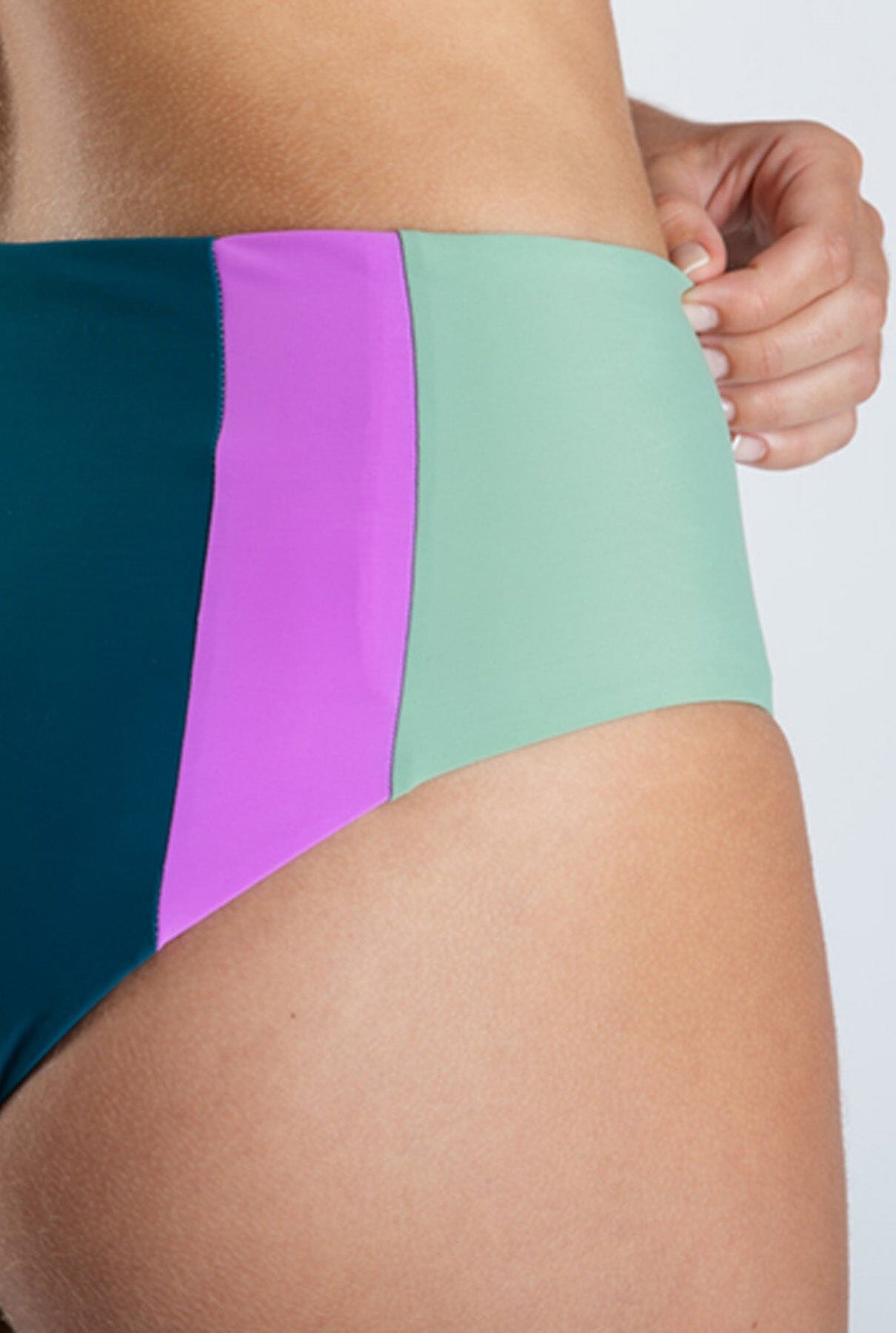 Braguita de bikini tricolor que combina un estilo distintivo y favorecedor gracias a su tiro alto que alarga visualmente las piernas, realza las caderas y estiliza la figura. La combinación de tres colores aporta un toque de versatilidad. Ideal para marcar tendencia. Cuenta con un forro morado agradable al tacto;