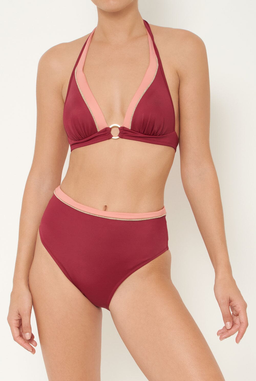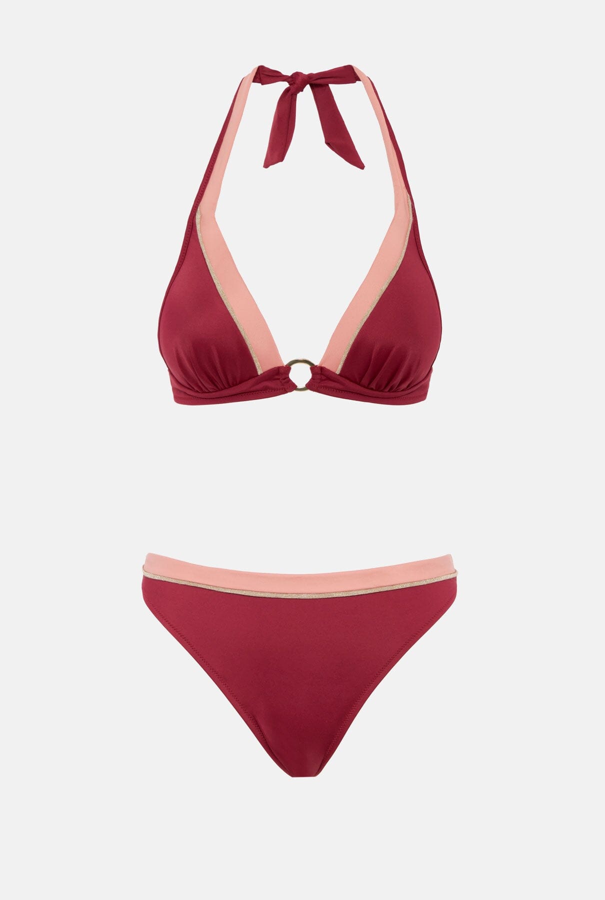 Bikini con una original combinación de color y ribete de lurex dorado. Top estilo halter, anudado al cuello que estiliza tu escote. Un diseño súper favorecedor bajo el sol. Diseñado por Wapa Trajes de baño.