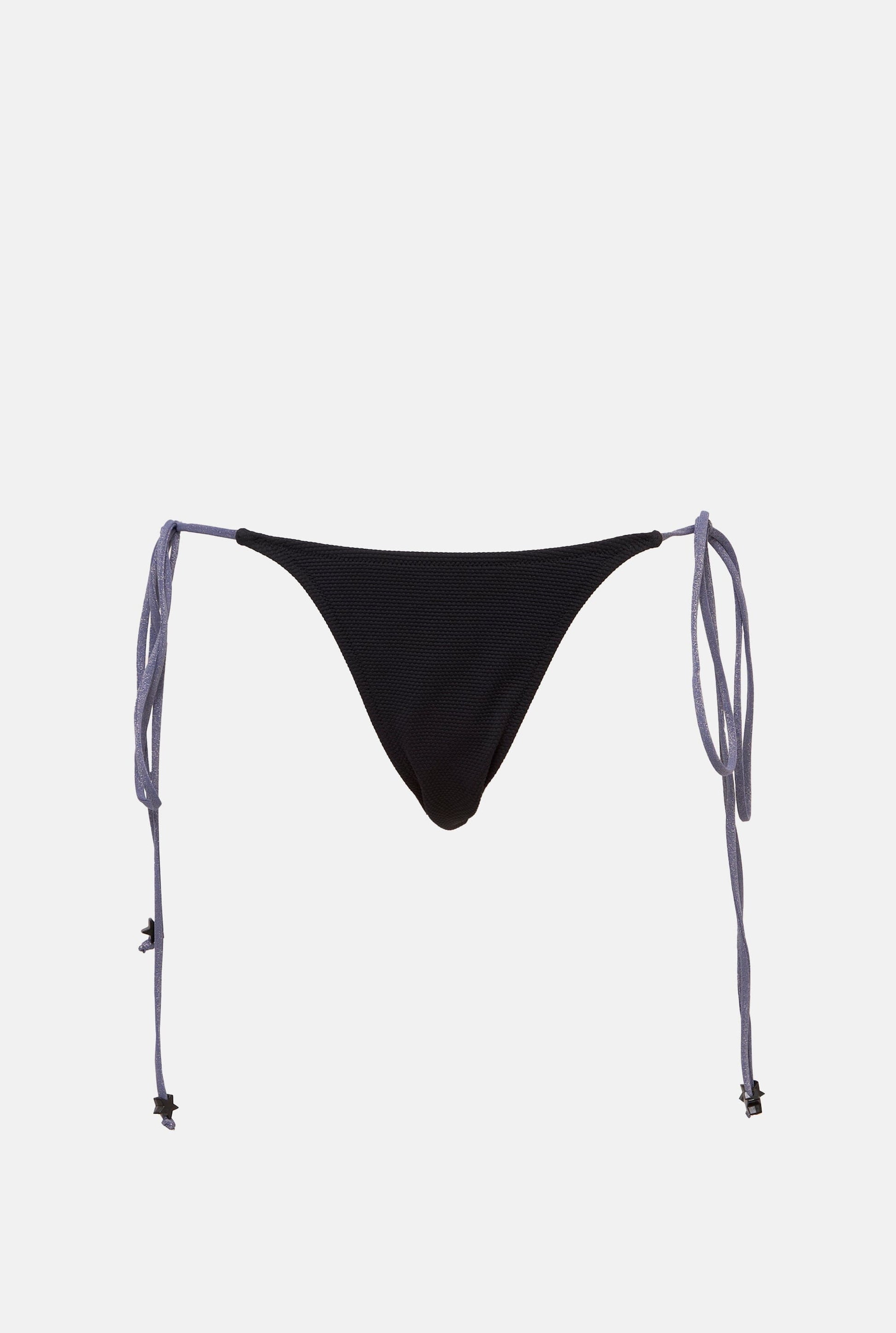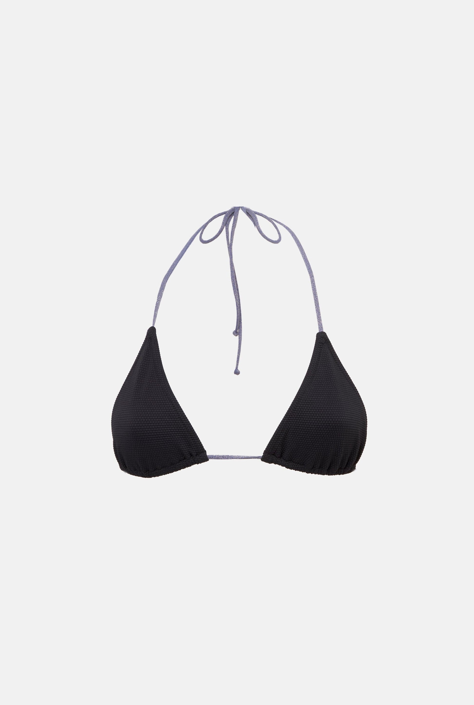 Este top de bikini está confeccionado en tejido piqué y cintas de lúrex azul que crean un contraste elegante y sofisticado. Los tirantes se pueden atar de diferentes maneras, lo que te permite personalizar tu estilo. El diseño minimiza ópticamente las caderas;