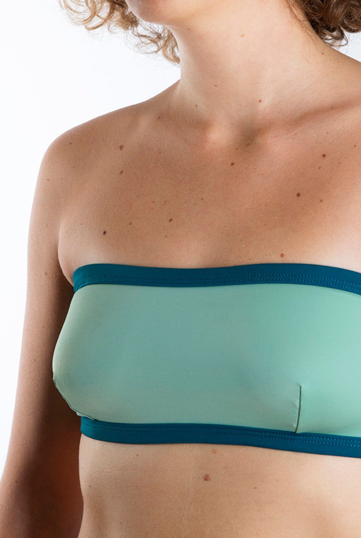 Top de bikini bandeau de color verde que garantiza un ajuste perfecto y una gran comodidad. Con ballenas laterales integradas y cierre trasero elástico que se adapta al contorno. Este top de bikini tiene tirantes extraíbles y ofrece versatilidad de uso, pudiendo usarse por la noche como top. Con forro morado y relleno extraíble. Ofrece una buena cobertura y un soporte firme para un ajuste cómodo. Adecuado para cualquier forma y tamaño de pecho.