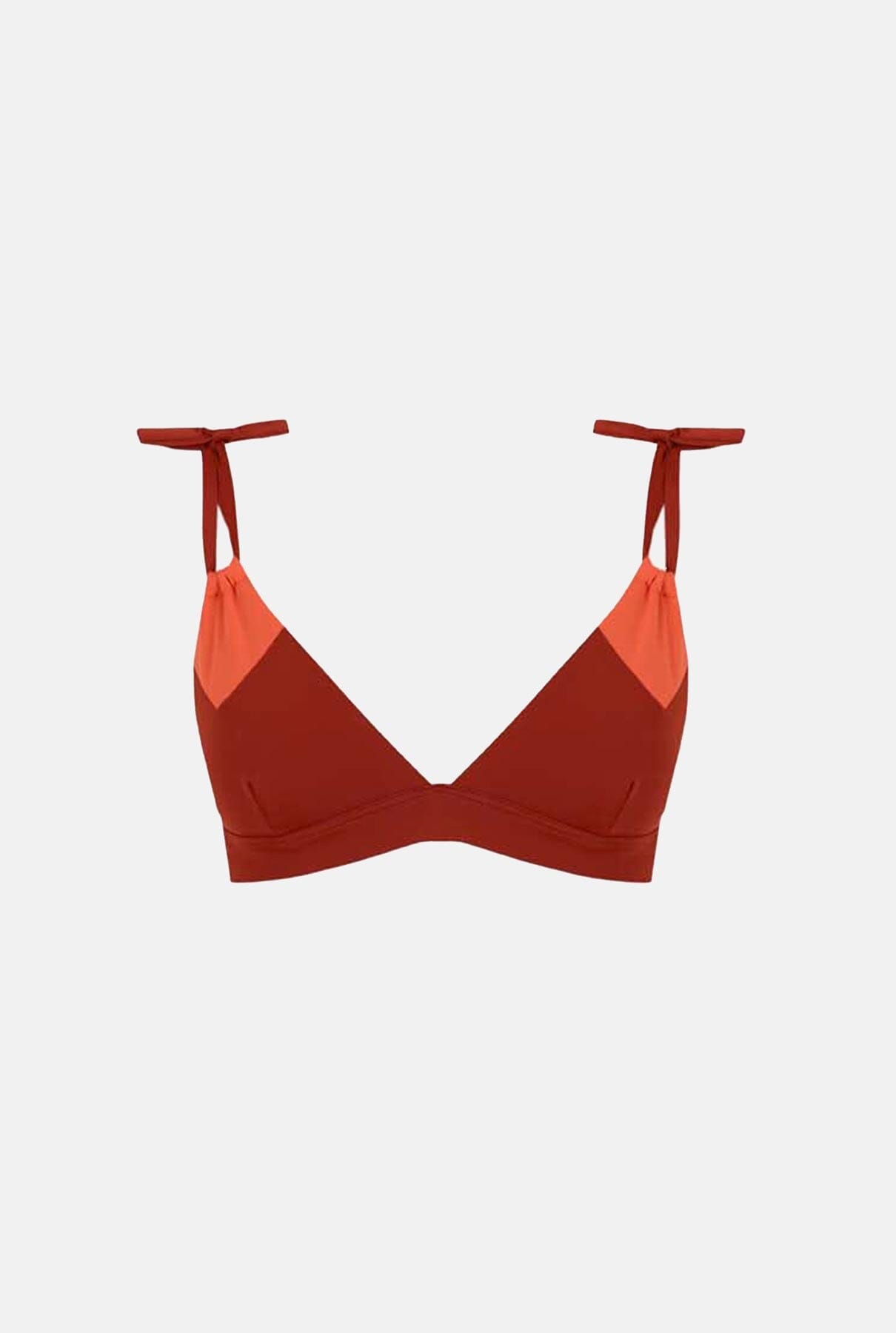 Top de bikini Rombo en color tierra, diseñado para ofrecer una sujeción y cobertura excepcionales. Los tirantes ajustables te permiten adaptarlo a tus necesidades, mientras que el elástico bajo el pecho refuerza la sujeción. Su diseño garantiza comodidad y estabilidad durante todo el día. Incluye forro y copas extraíbles para mayor versatilidad. Ofrece una alta cobertura y frunce el pecho de forma natural desde los laterales.