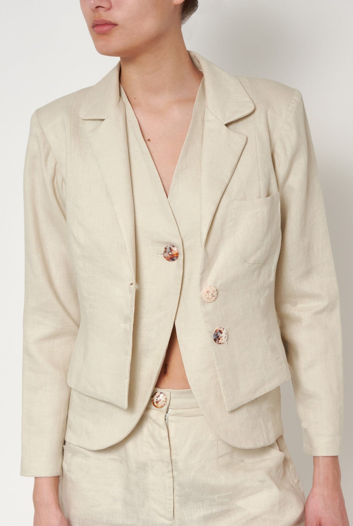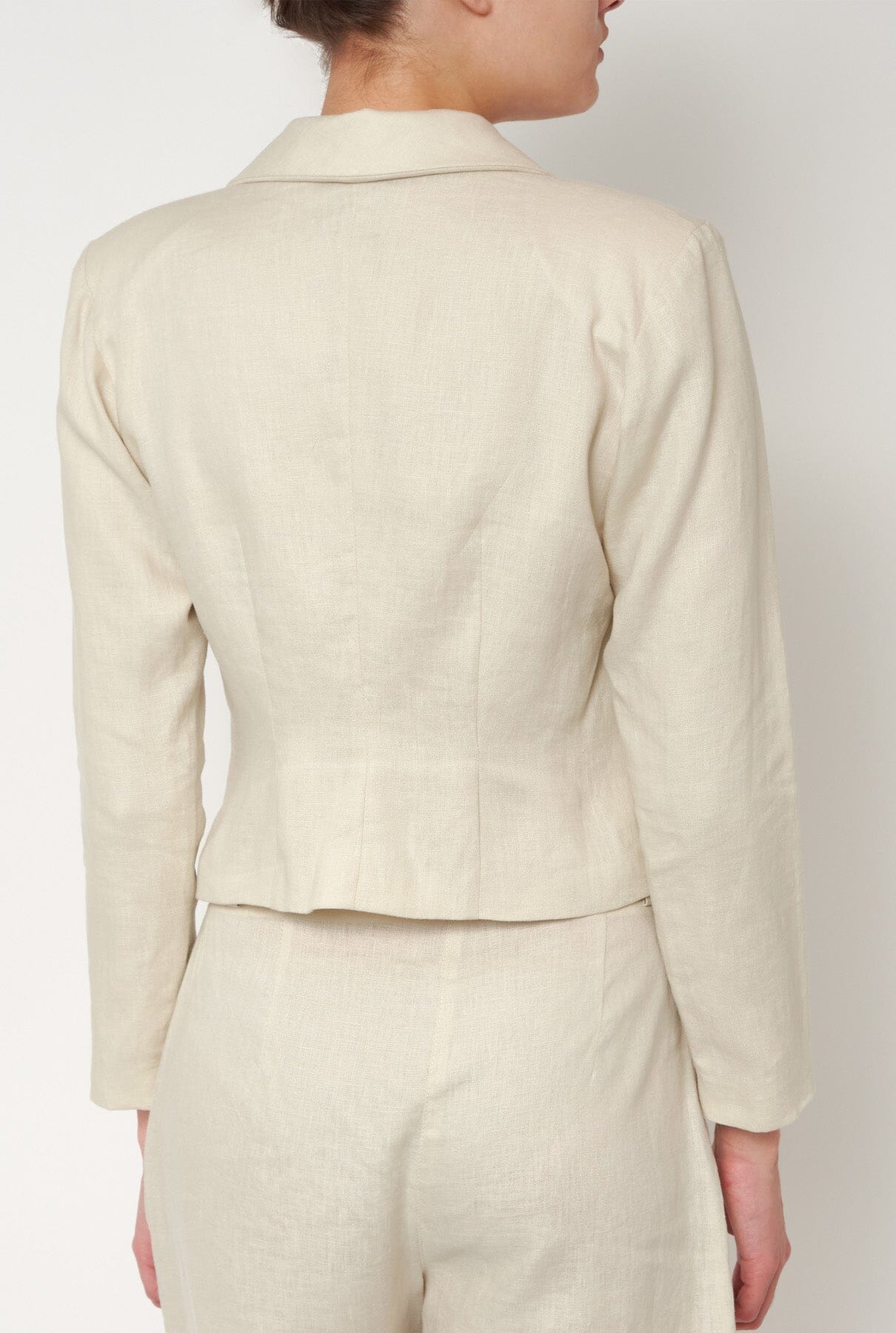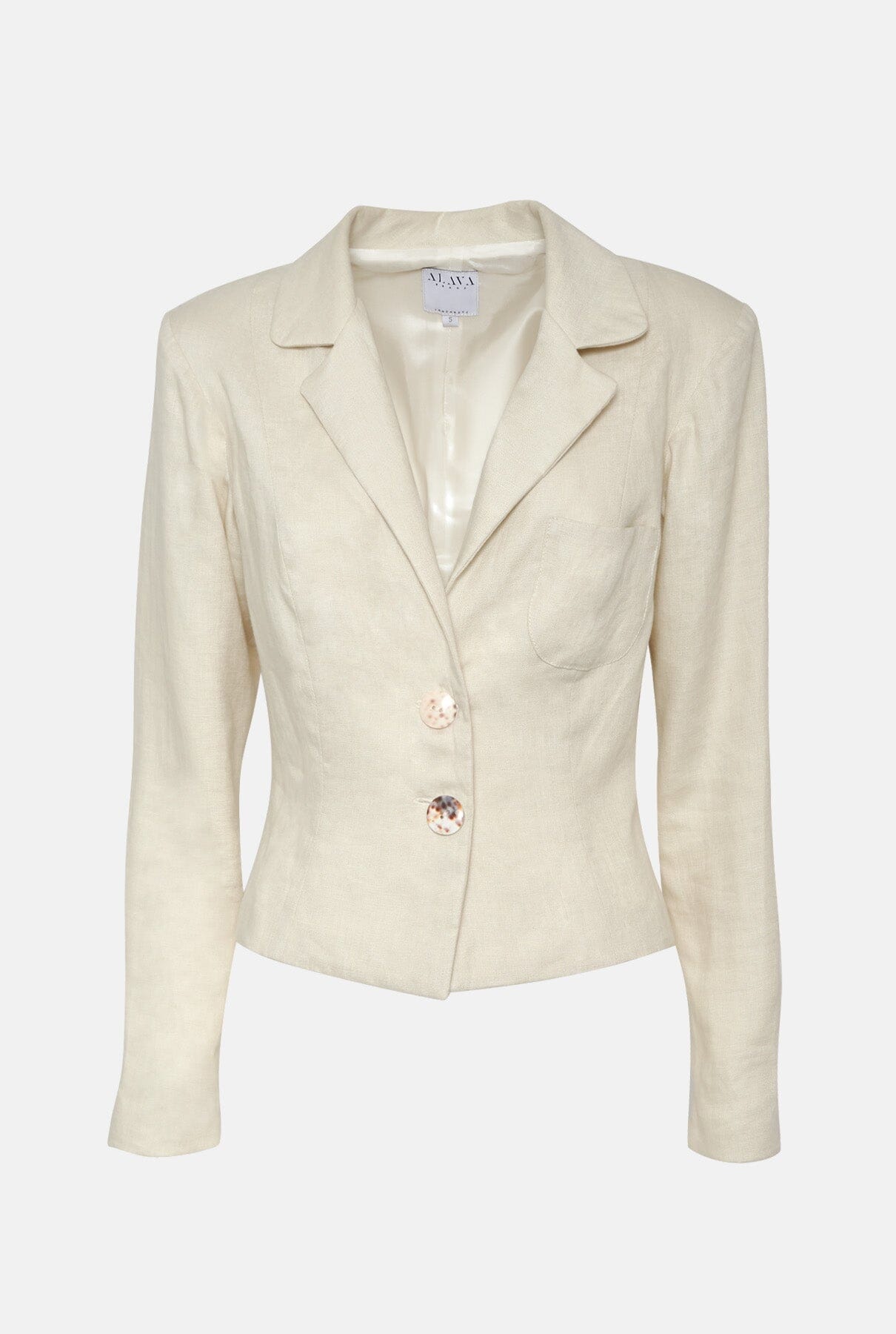 Blazer confeccionada artesanalmente en nuestro taller en Lanzarote. Blazer confeccionada en 100% lino. Blazer de cuello solapa y manga larga con hombreras.