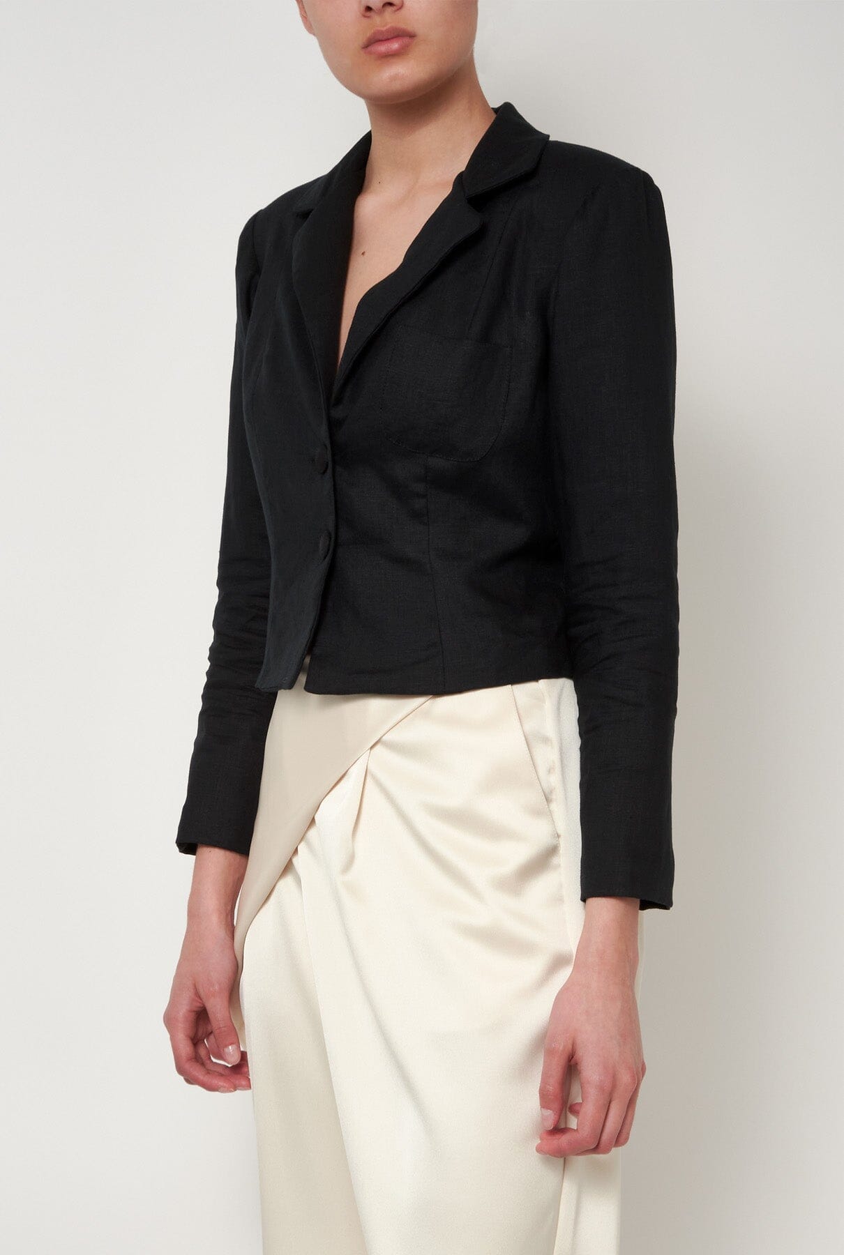 Blazer confeccionada artesanalmente en nuestro taller en Lanzarote. Americana de lino con cuello solapa y manga larga con hombreras. Cierre frontal con botones forrados en lino.