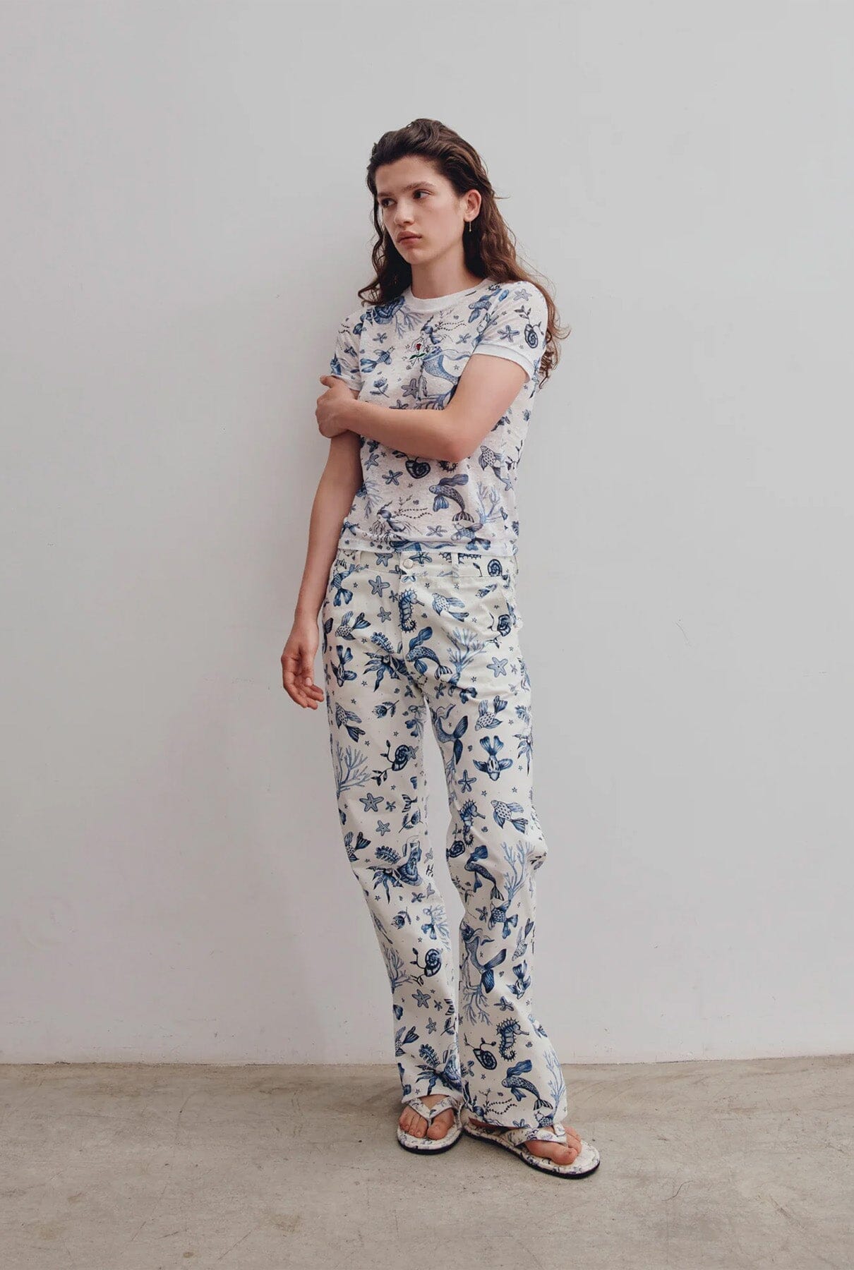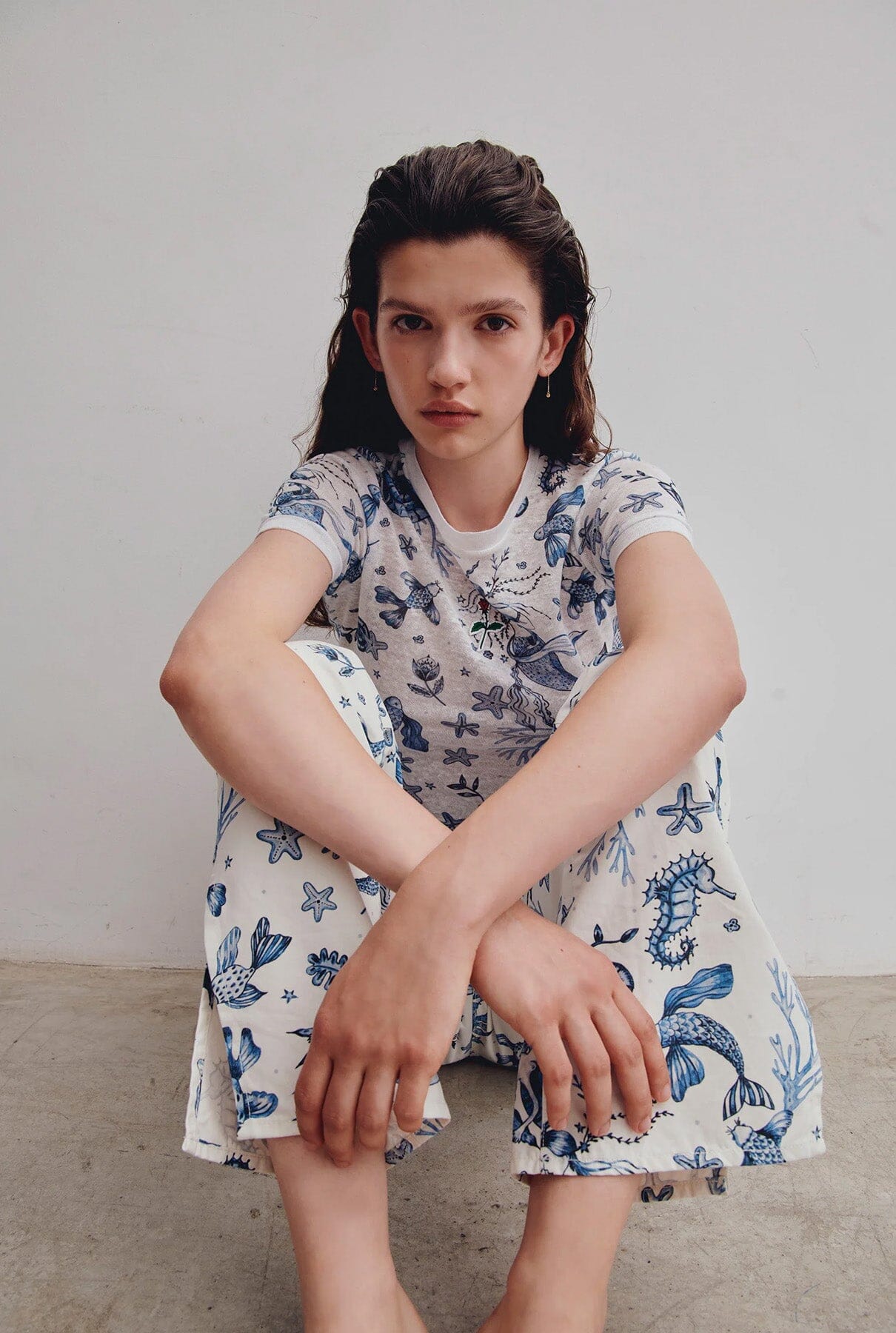 Yconic Nereids linen short tee. "Nereids" print all over the tee, designed by La Beltraneja. Ynesuelves Rose logo patch embroidered on the front. Slim fit.