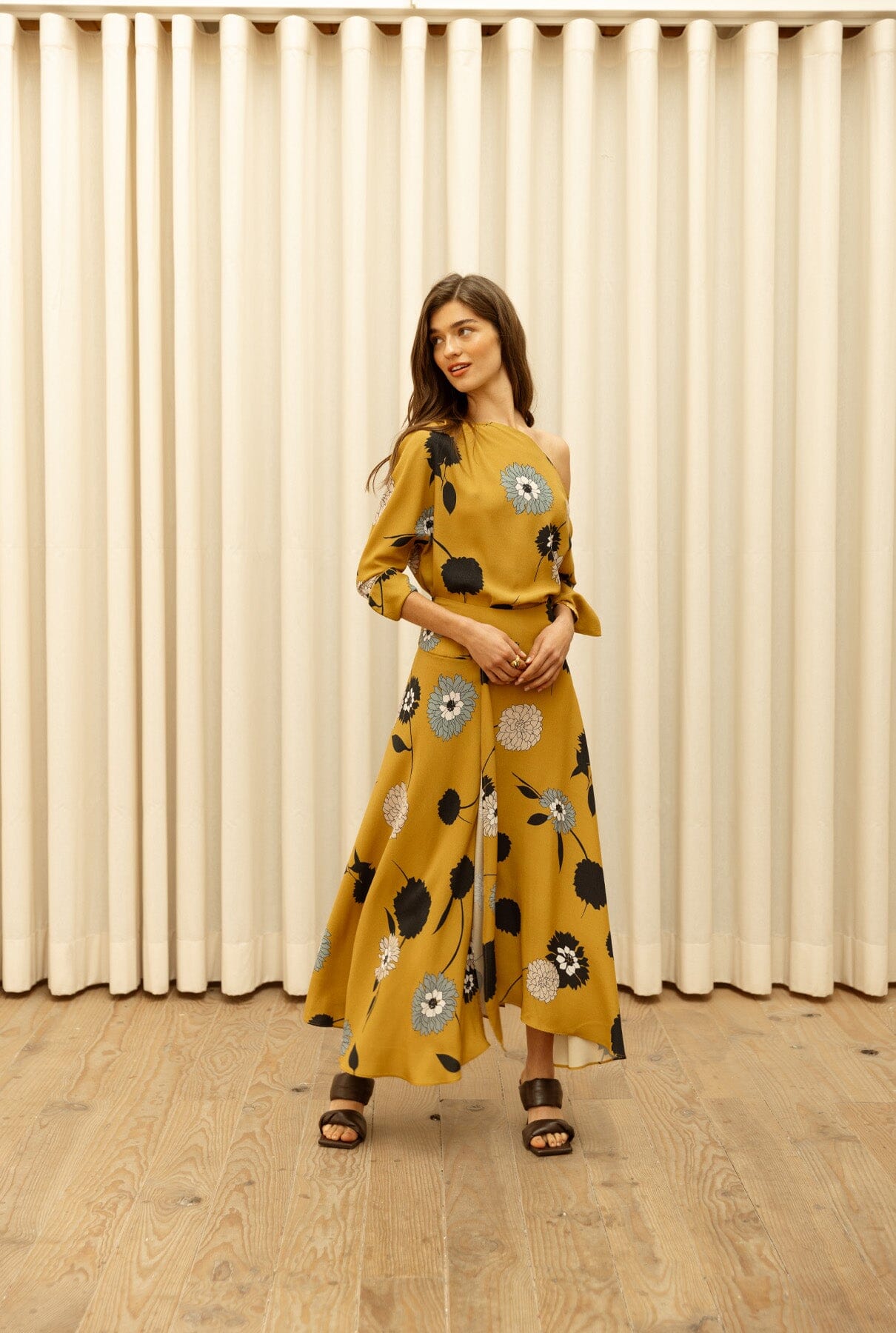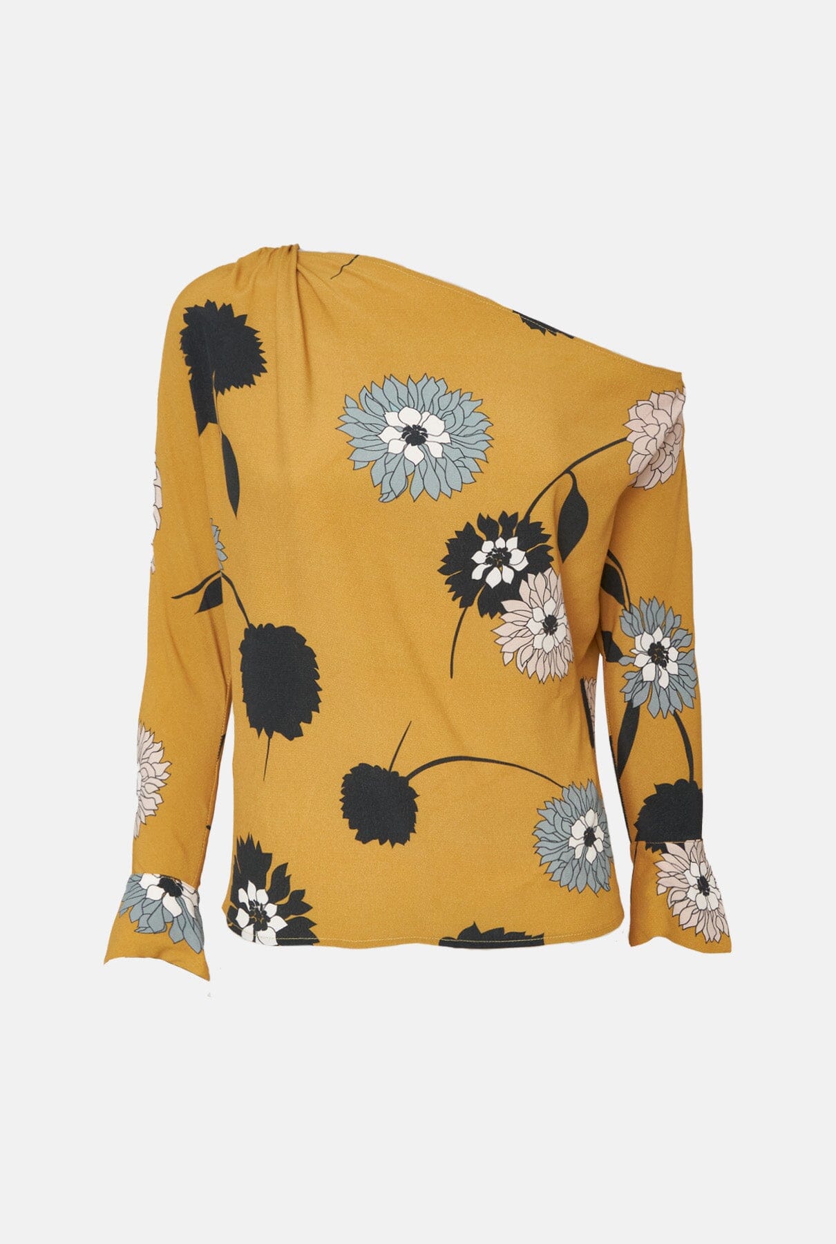 Blusa amplia asimétrica con escote escotado, hombro drapeado y puño abierto.