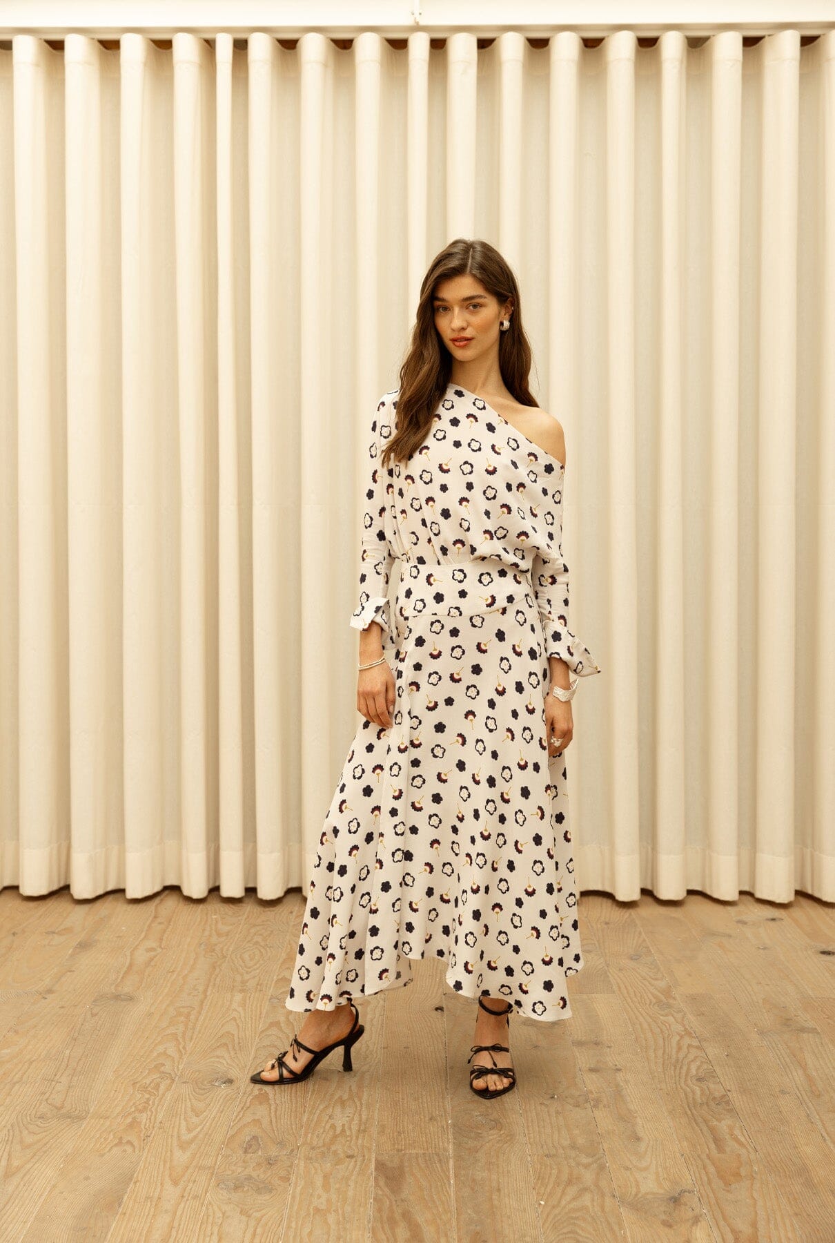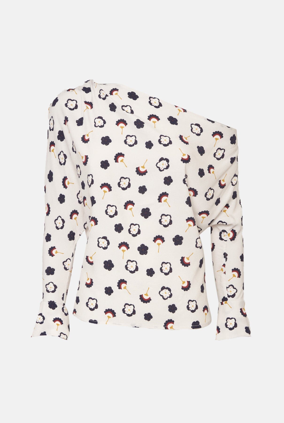 Blusa amplia asimétrica con escote escotado, hombro drapeado y puño abierto.